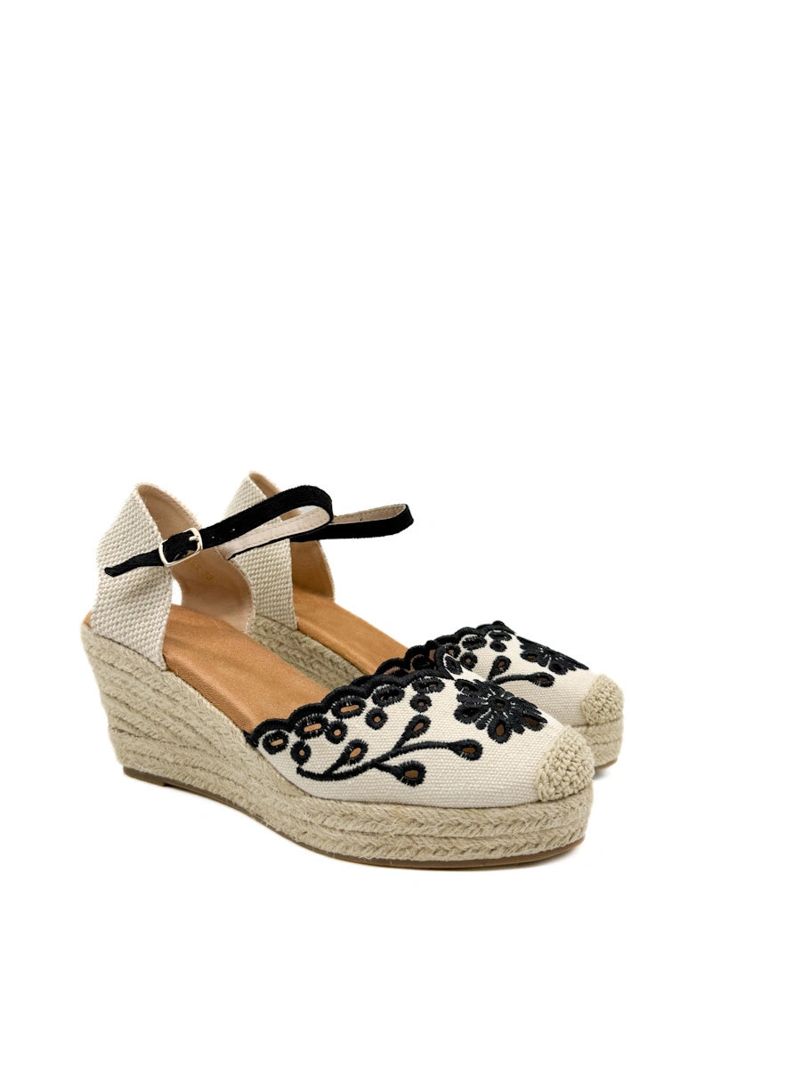 Alpargatas de cuña con un diseño romántico y artesanal, caracterizadas por su puntera cerrada con bordado troquelado en motivos florales. El calzado combina una plataforma de yute trenzado de altura media con una pala de lona decorada y una talonera textil reforzada que se sujeta mediante una fina pulsera al tobillo con hebilla metálica. La variedad cromática abarca desde tonos neutros y naturales como el beige, hasta contrastes más marcados en verde oliva o negro, e incluso una sofisticada versión en acabado metalizado dorado, ofreciendo una opción versátil y elegante para el verano.