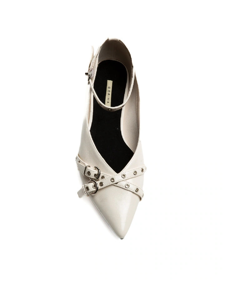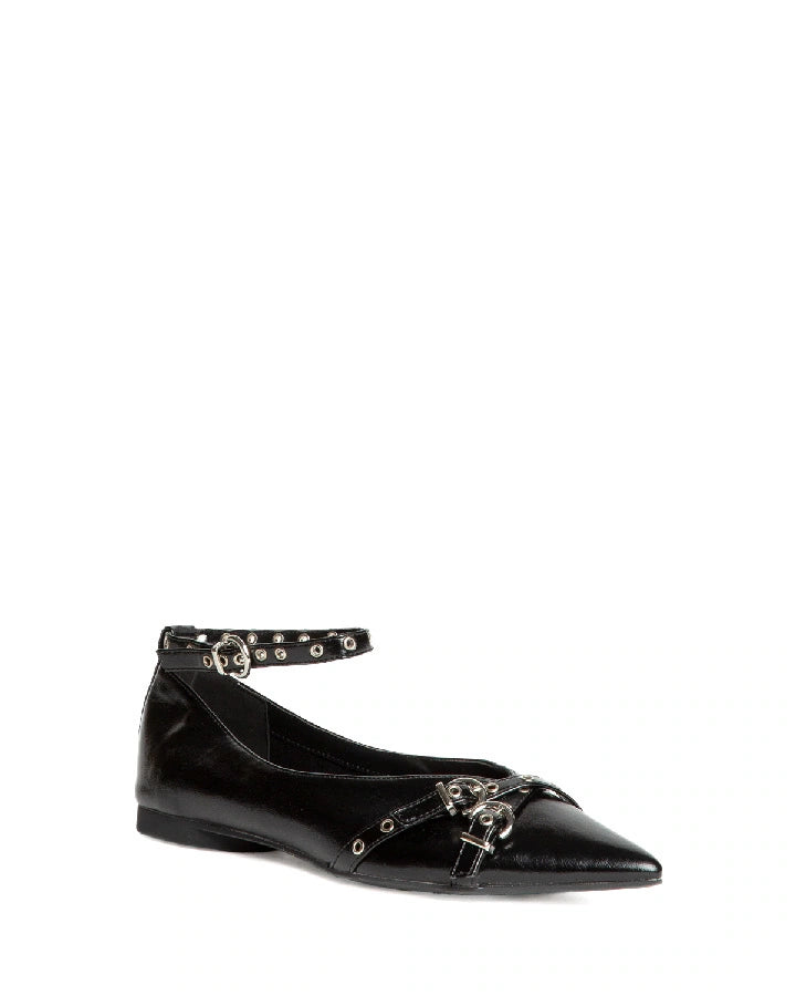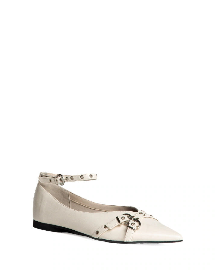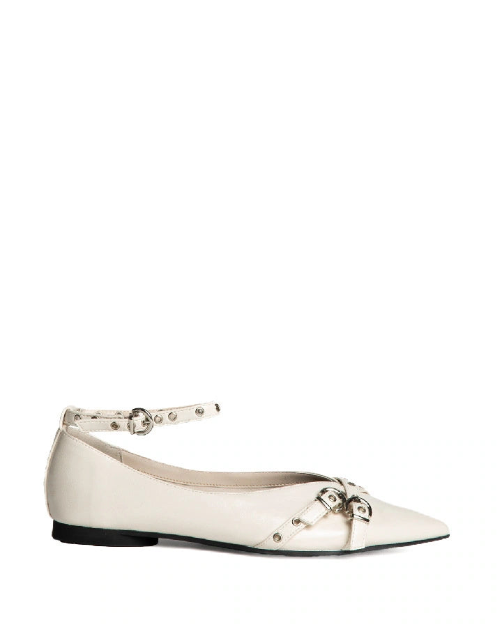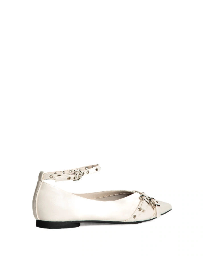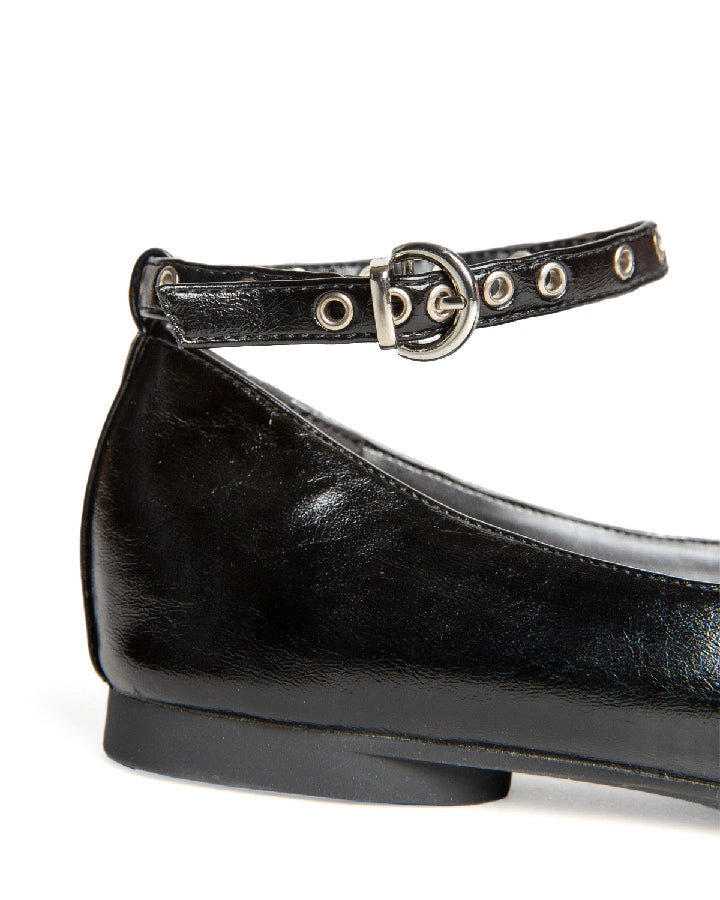 Bailarinas planas de mujer, Acabado y escote en punta. Detalle de hebilla y ojales metálicos en la parte delantera. Cierre mediante pulsera al tobillo.