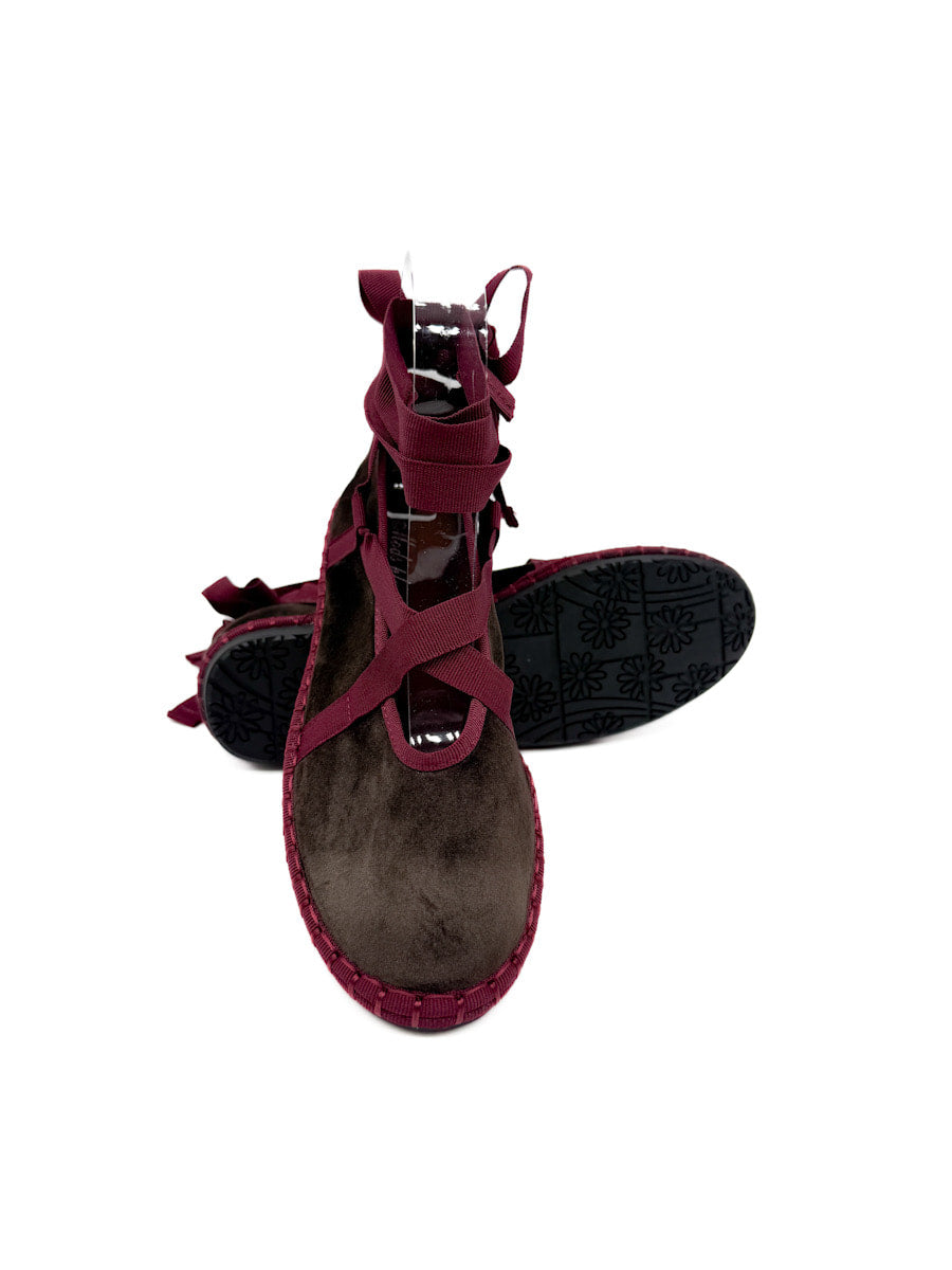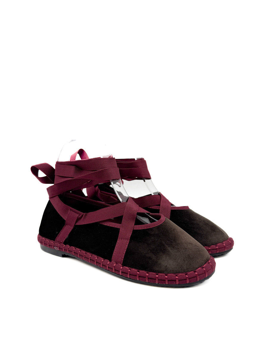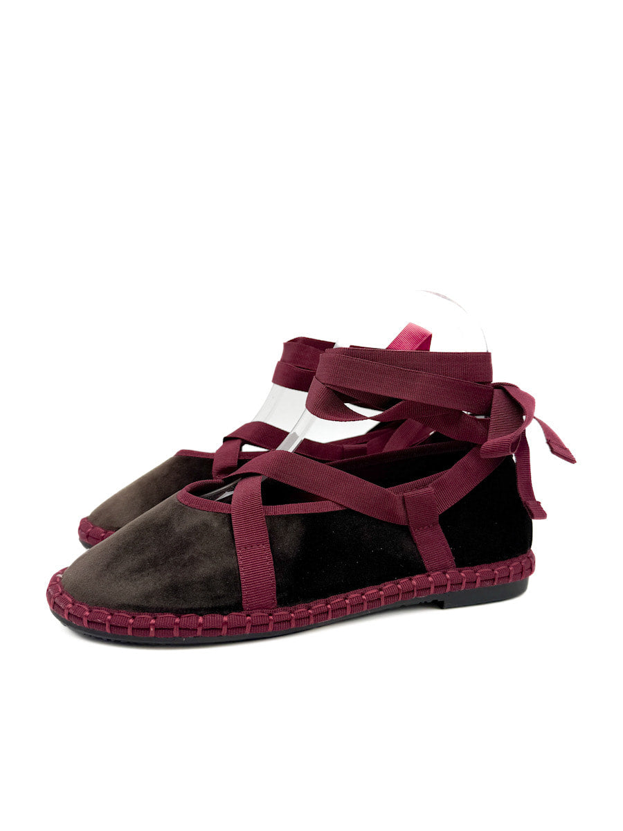 Zapatos planos de estilo Bailarinas  con una estética sofisticada y moderna, La parte superior está confeccionada en un material de terciopelo, en dos tonalidades: uno en un marrón oscuro profundo y otro en un kahki. Ambos modelos comparten un sistema de correas anchas  que se cruzan sobre el empeine y se atan alrededor del tobillo, lo que añade un toque femenino y funcional. La característica distintiva es la suela de goma negra con un borde trenzado en color burdeos, que contrasta vibrantemente con el cuerpo del zapato, completando el detalle artesanal de estos calzados versátiles.