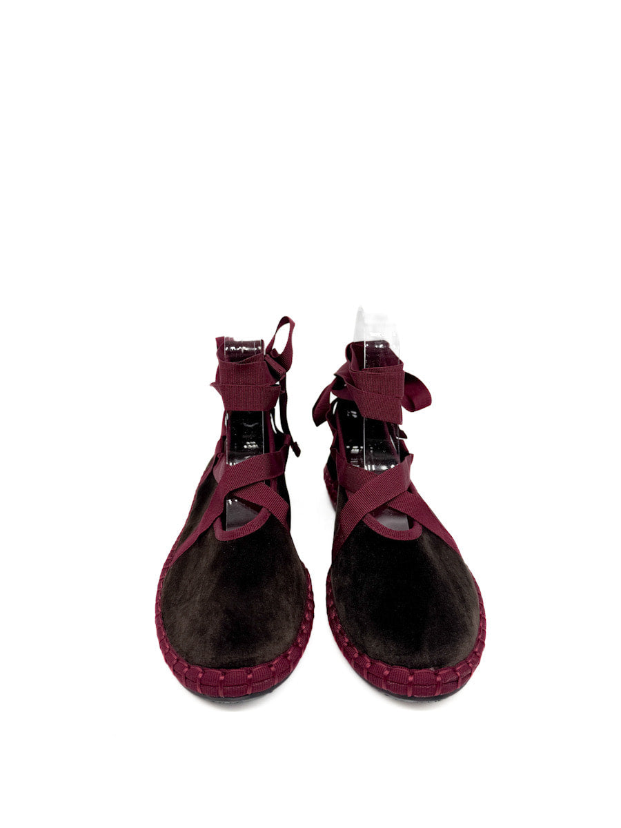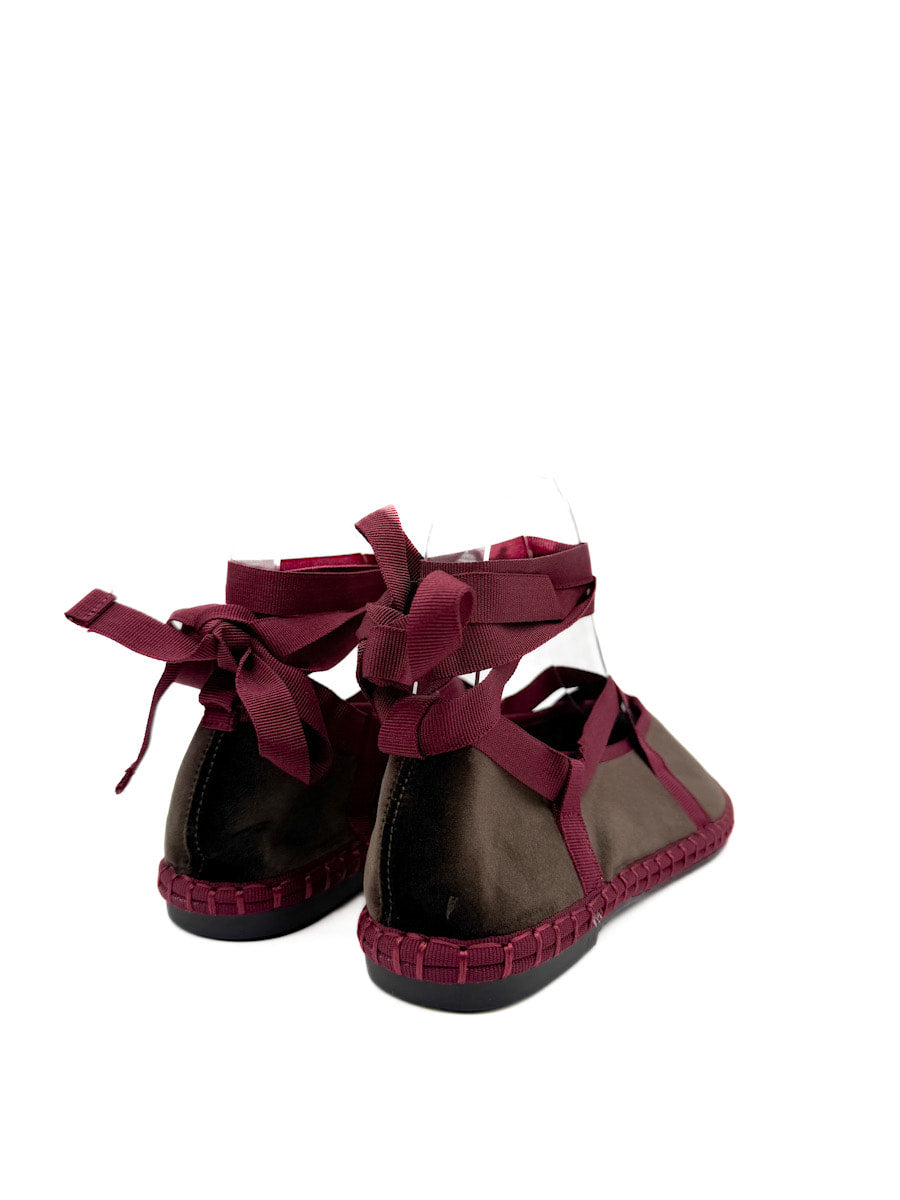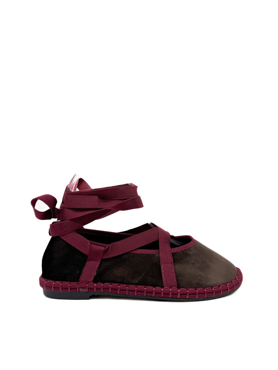 Zapatos planos de estilo Bailarinas  con una estética sofisticada y moderna, La parte superior está confeccionada en un material de terciopelo, en dos tonalidades: uno en un marrón oscuro profundo y otro en un kahki. Ambos modelos comparten un sistema de correas anchas  que se cruzan sobre el empeine y se atan alrededor del tobillo, lo que añade un toque femenino y funcional. La característica distintiva es la suela de goma negra con un borde trenzado en color burdeos, que contrasta vibrantemente con el cuerpo del zapato, completando el detalle artesanal de estos calzados versátiles.