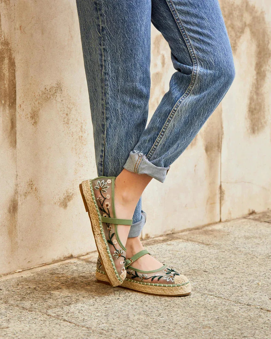 Merceditas con Plataforma Rejilla Bordado de Flores Verde