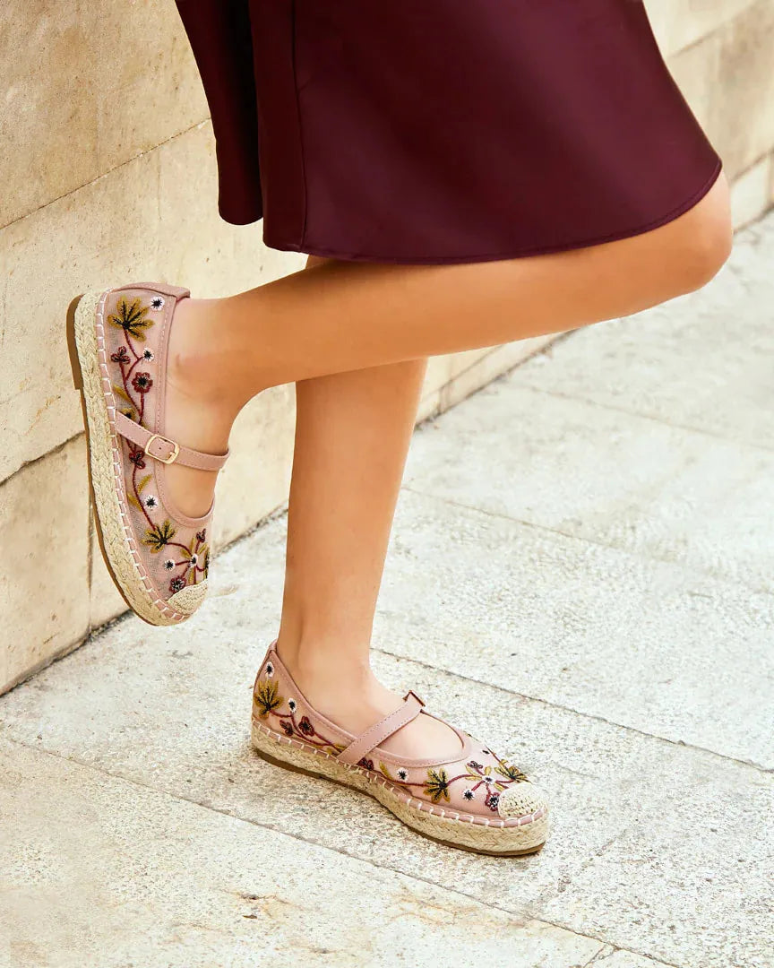Merceditas con Plataforma Rejilla Bordado de Flores Rosa