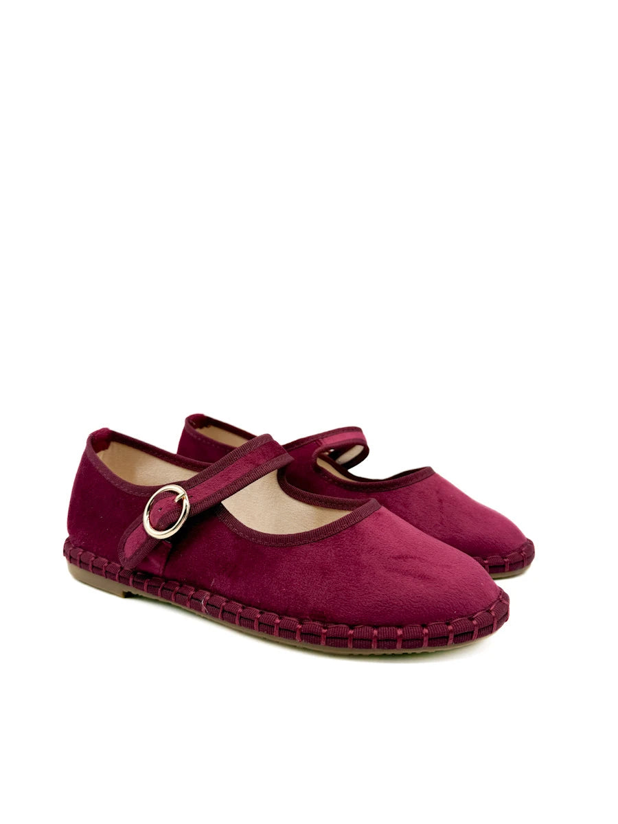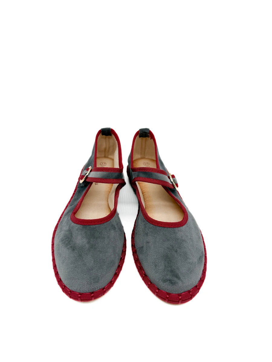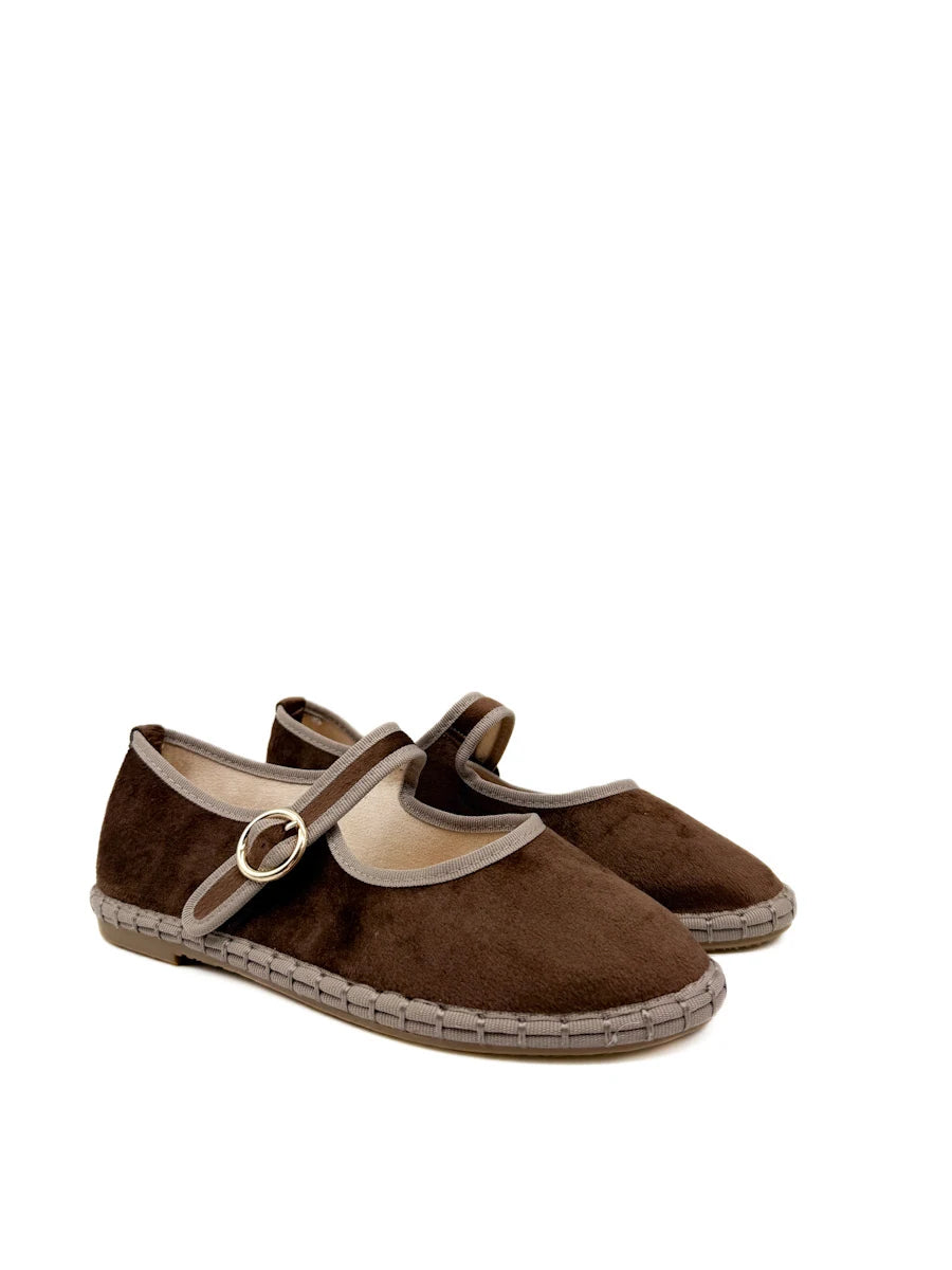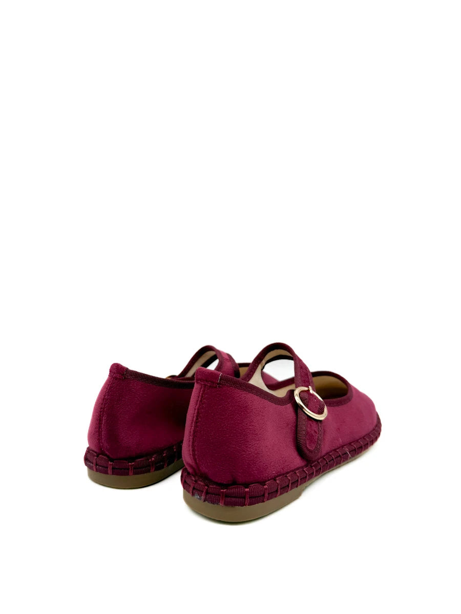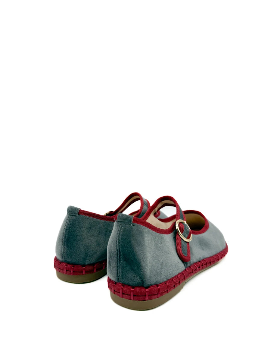 Zapatos de tipo merceditas. confeccionados en suave y lujoso terciopelo que aporta una elegancia , La suela está adornada con un detalle de costura festón, y una tira con una hebilla de aro en color dorado cruza el empeine. Este diseño combina elementos clásicos con toques modernos.