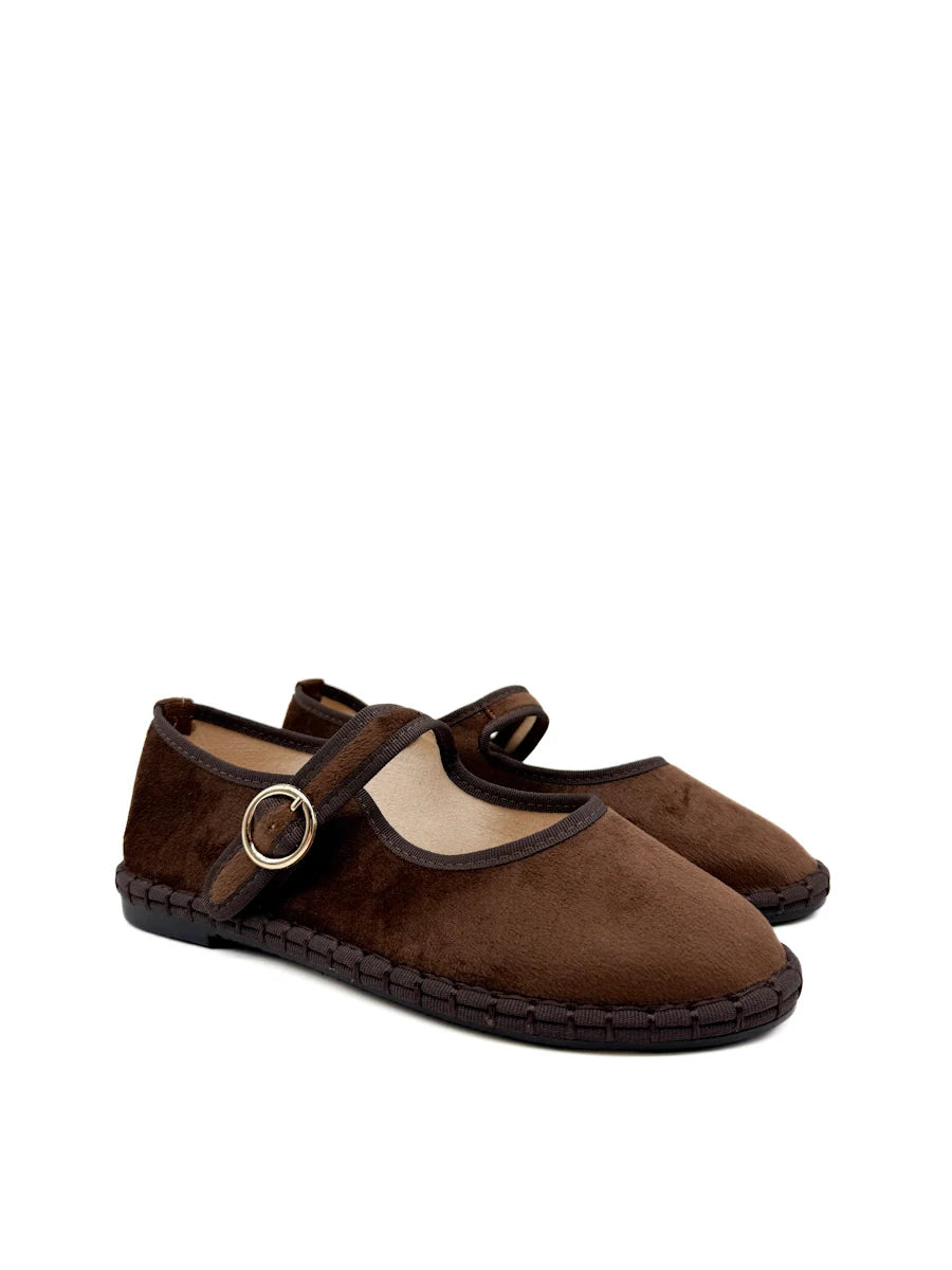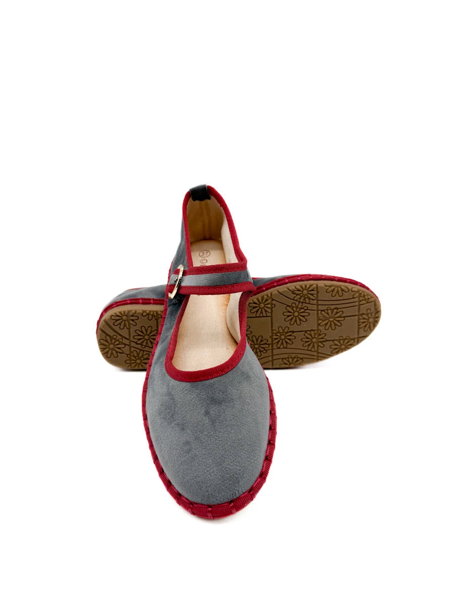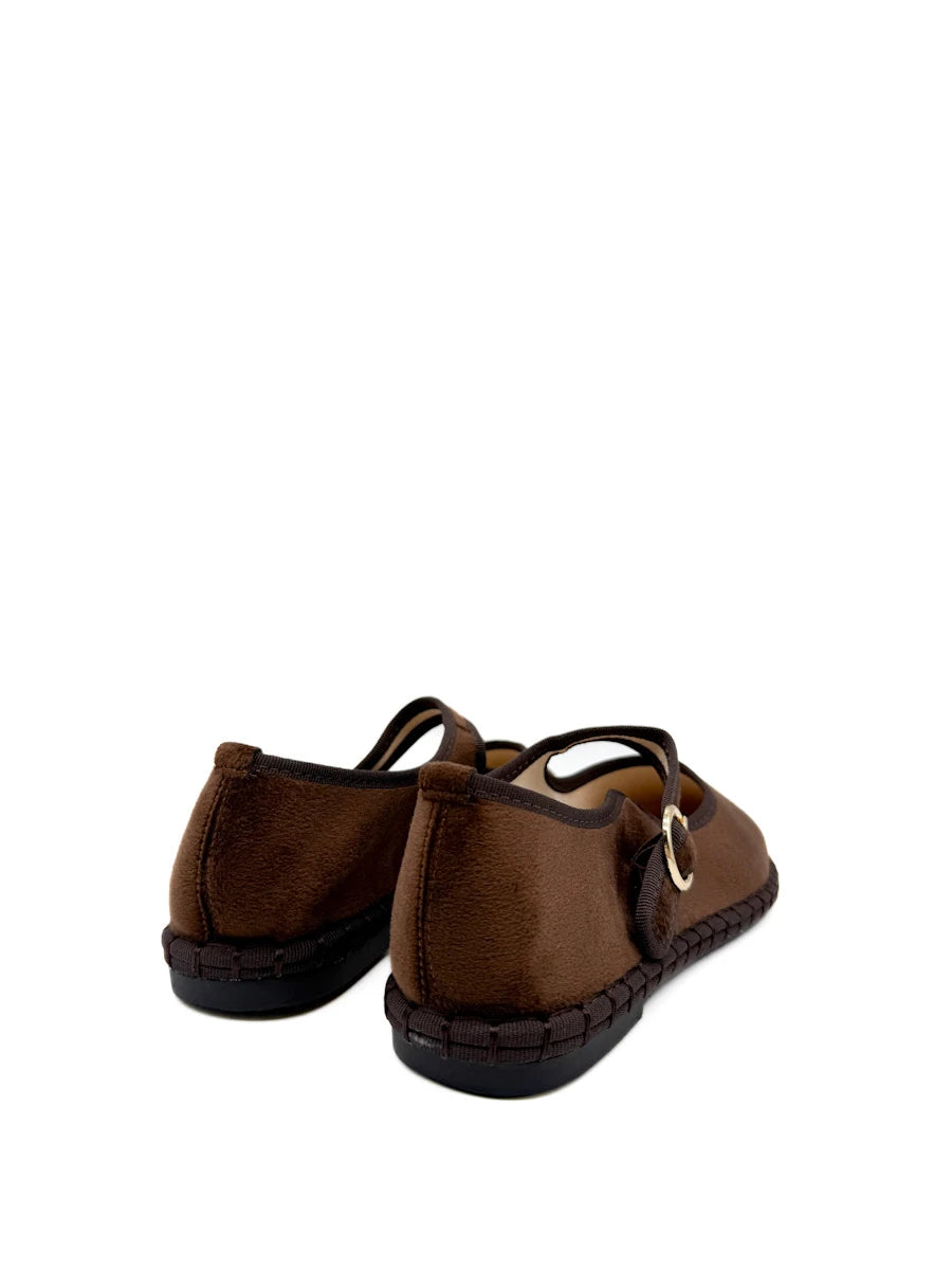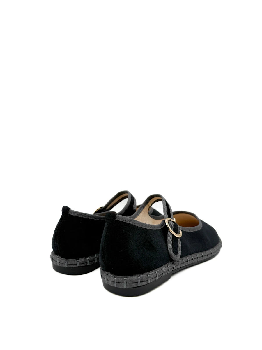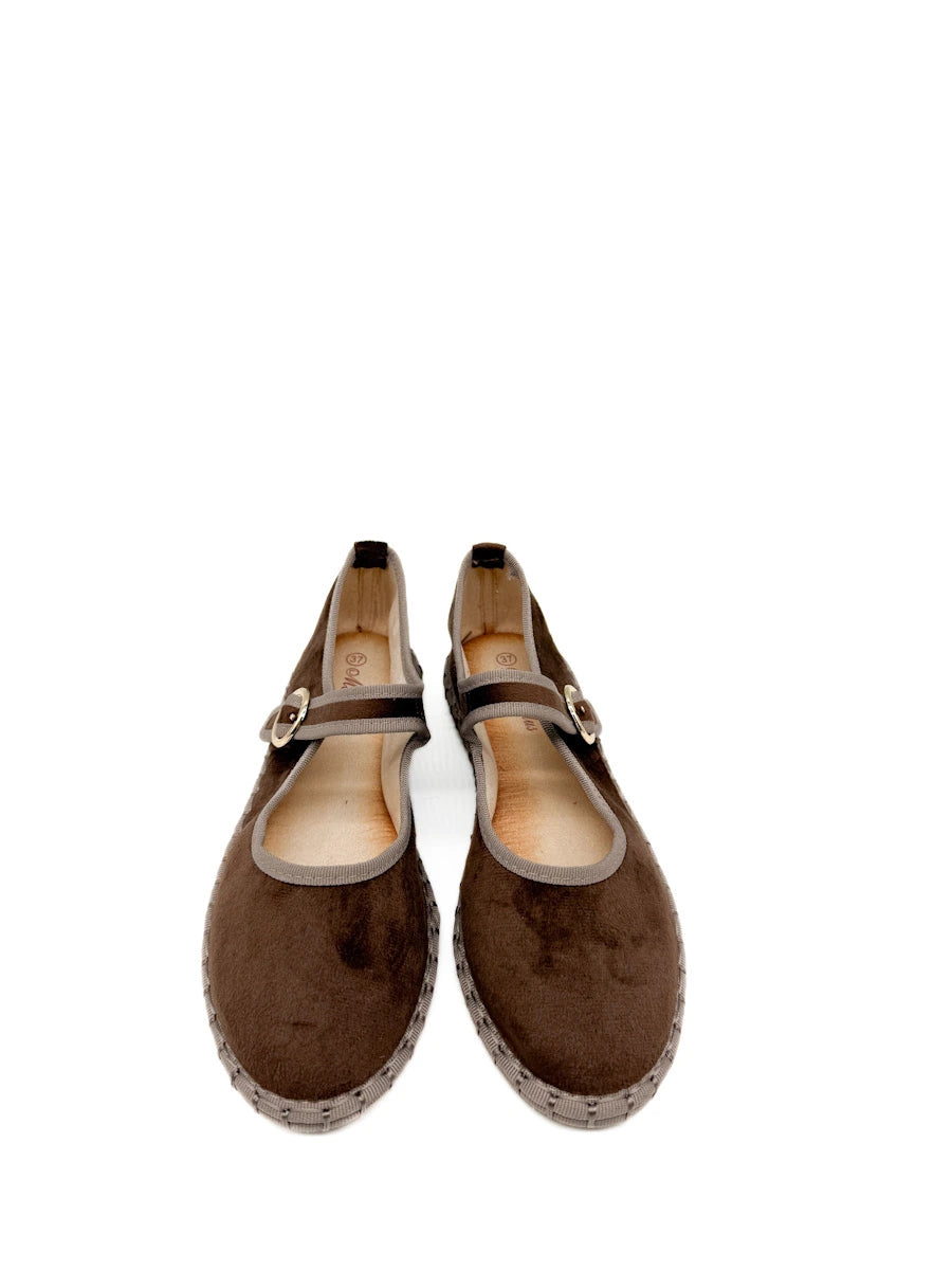 Zapatos de tipo merceditas. confeccionados en suave y lujoso terciopelo que aporta una elegancia , La suela está adornada con un detalle de costura festón, y una tira con una hebilla de aro en color dorado cruza el empeine. Este diseño combina elementos clásicos con toques modernos.