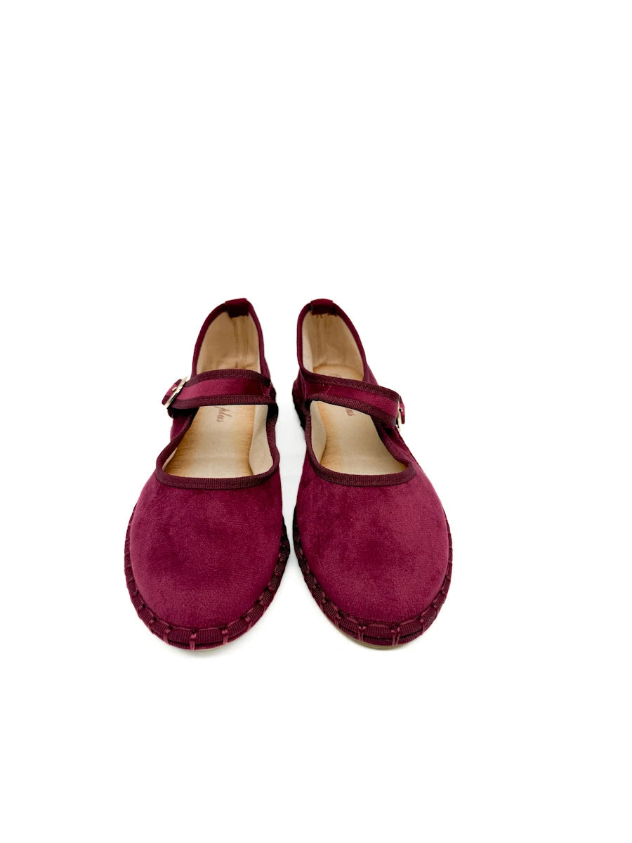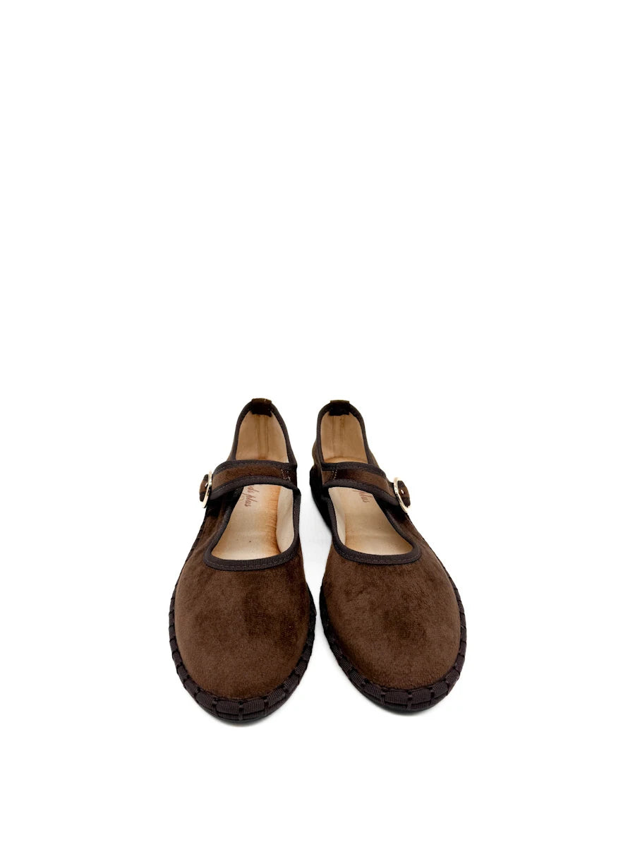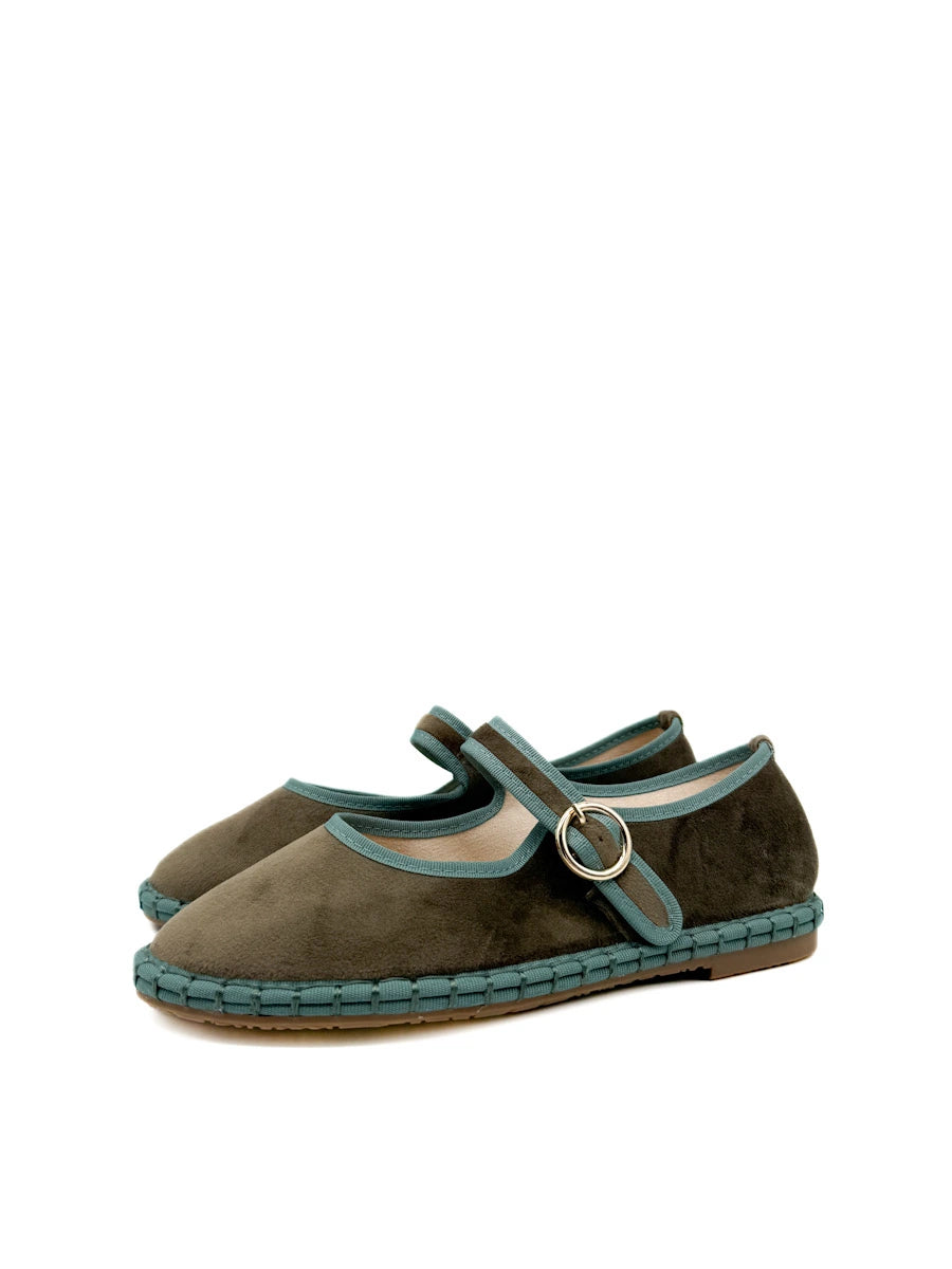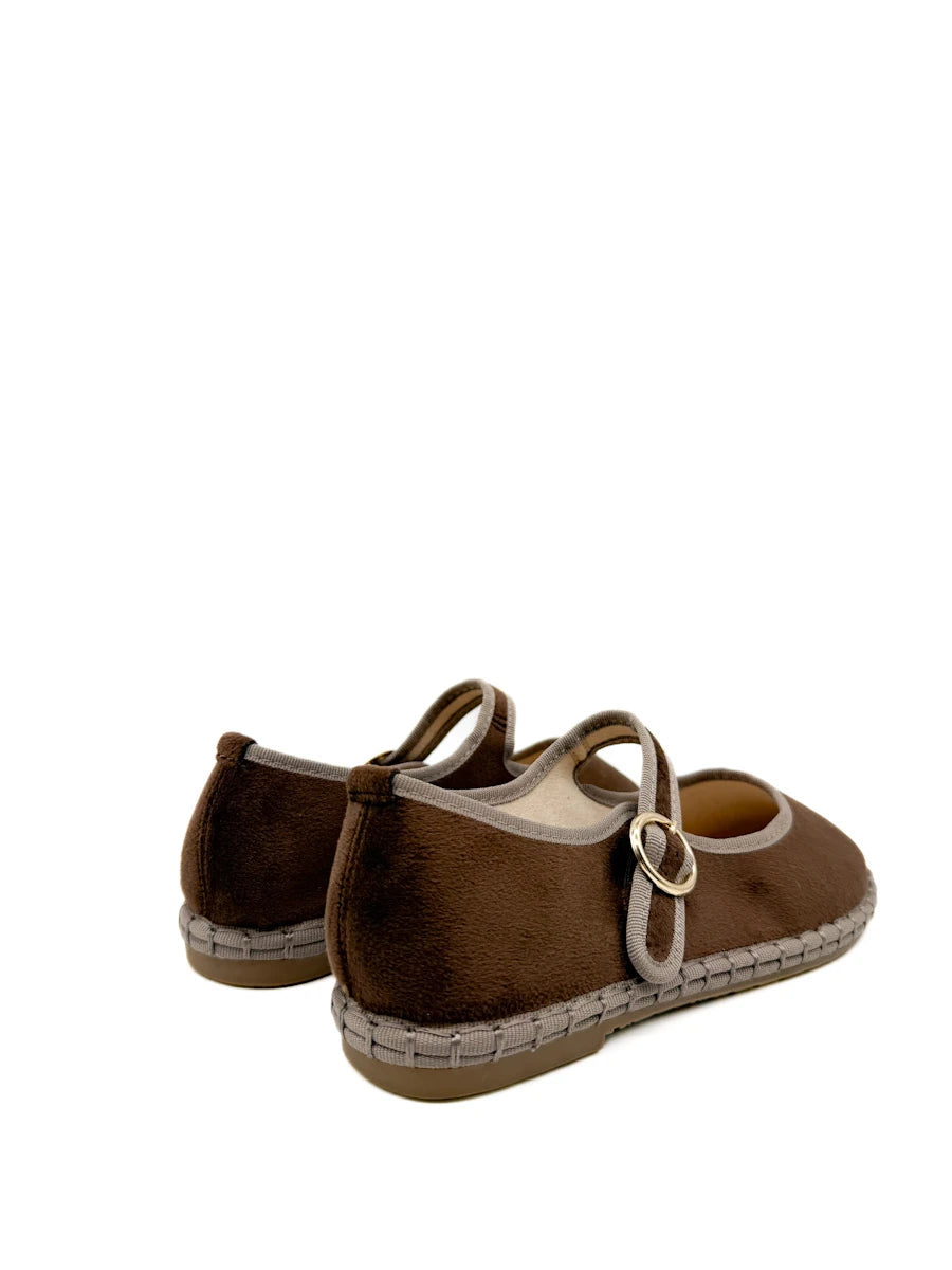 Zapatos de tipo merceditas. confeccionados en suave y lujoso terciopelo que aporta una elegancia , La suela está adornada con un detalle de costura festón, y una tira con una hebilla de aro en color dorado cruza el empeine. Este diseño combina elementos clásicos con toques modernos.