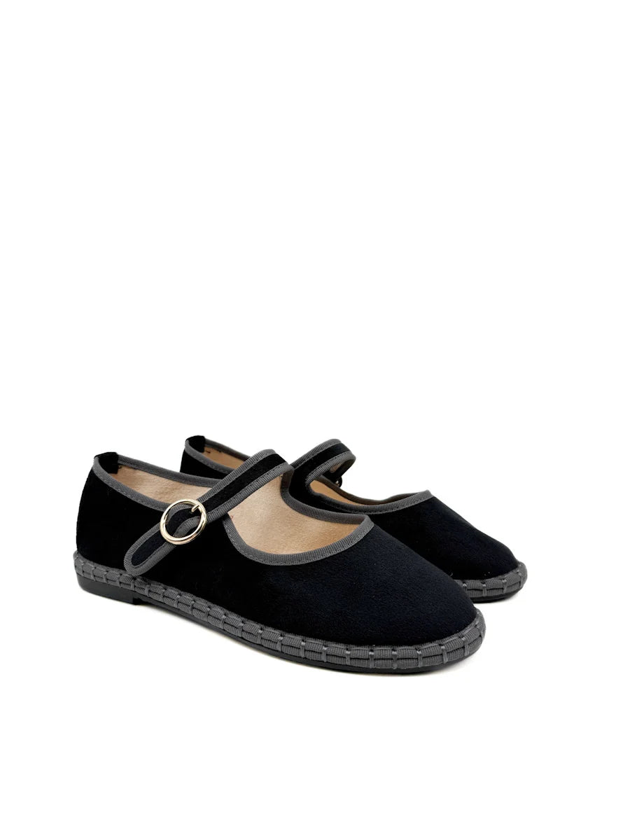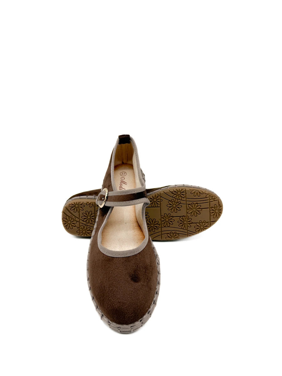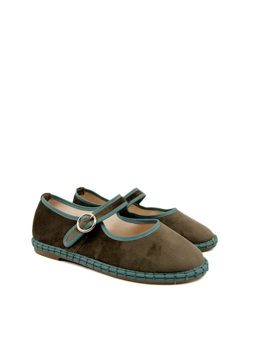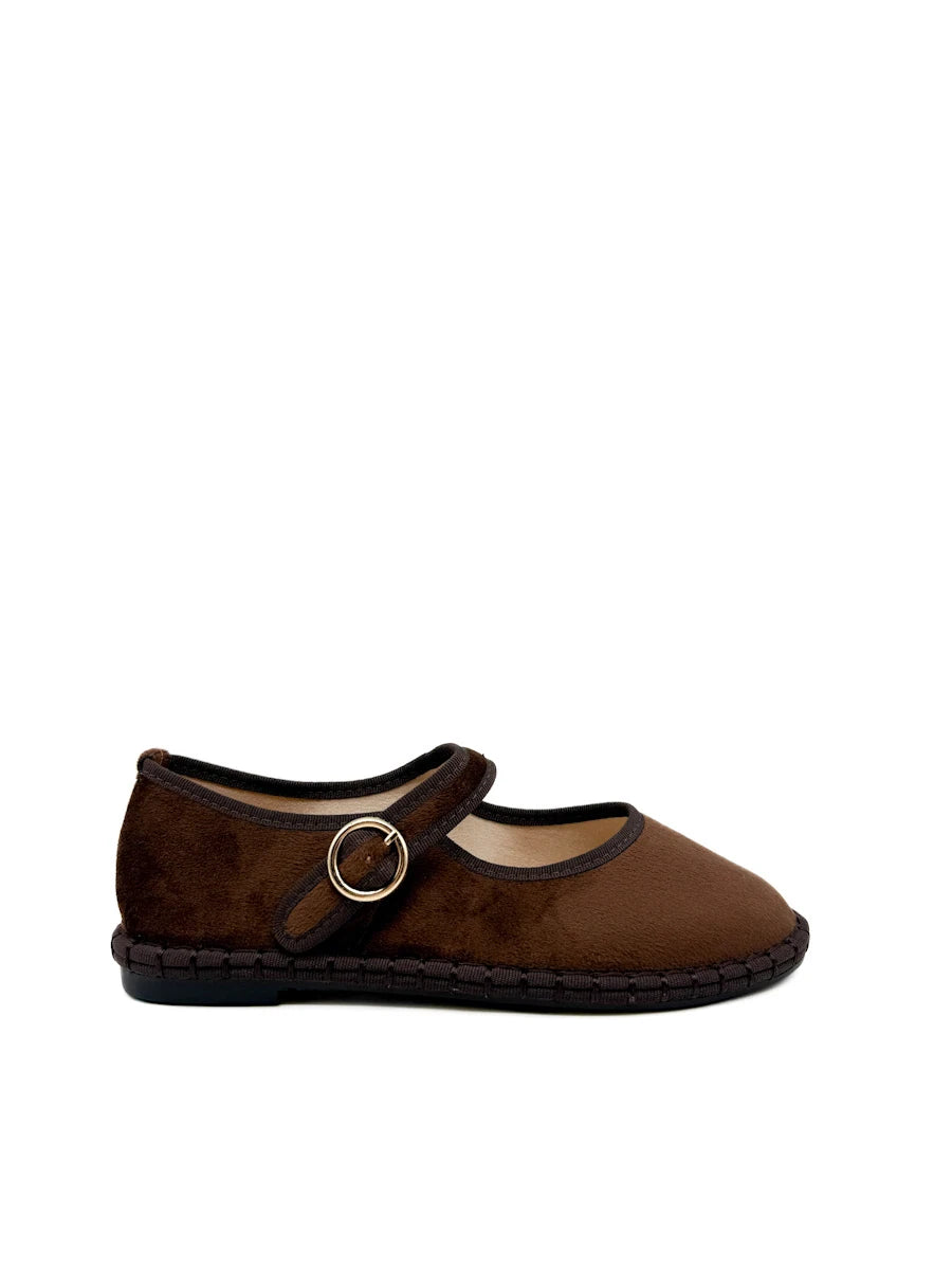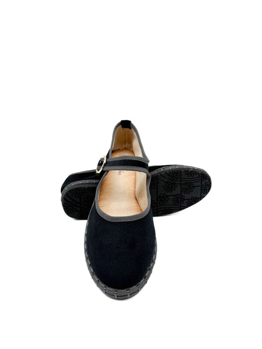 Zapatos de tipo merceditas. confeccionados en suave y lujoso terciopelo que aporta una elegancia , La suela está adornada con un detalle de costura festón, y una tira con una hebilla de aro en color dorado cruza el empeine. Este diseño combina elementos clásicos con toques modernos.