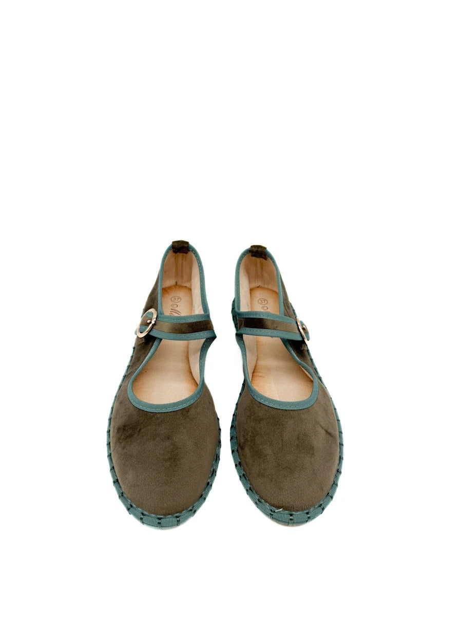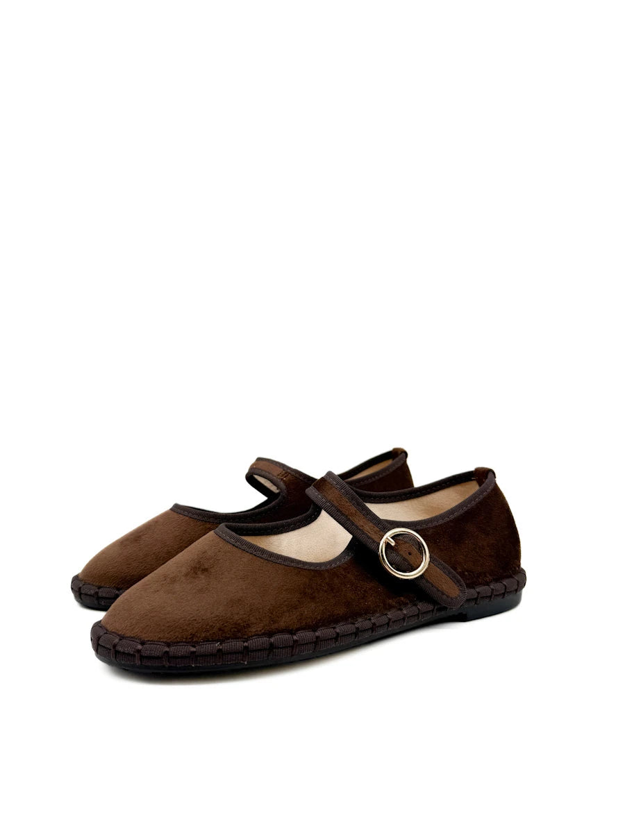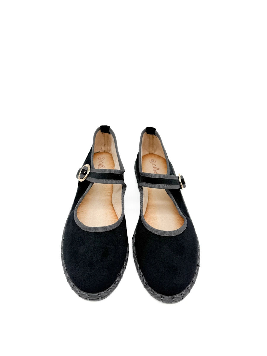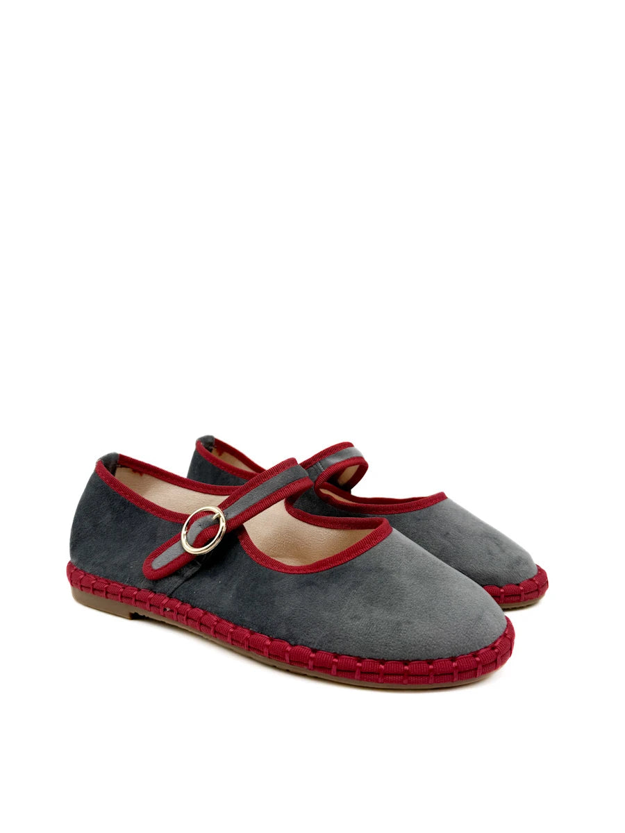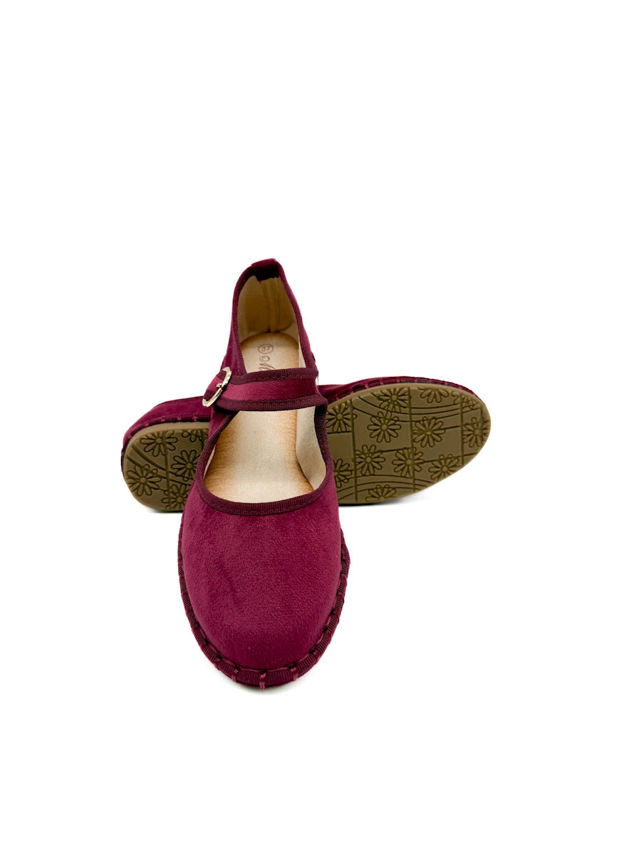 Zapatos de tipo merceditas. confeccionados en suave y lujoso terciopelo que aporta una elegancia , La suela está adornada con un detalle de costura festón, y una tira con una hebilla de aro en color dorado cruza el empeine. Este diseño combina elementos clásicos con toques modernos.