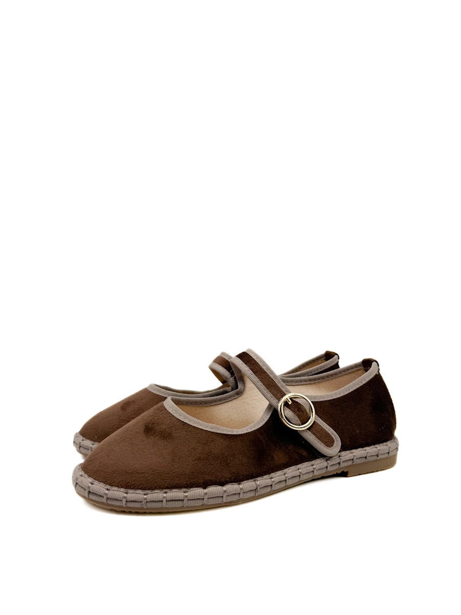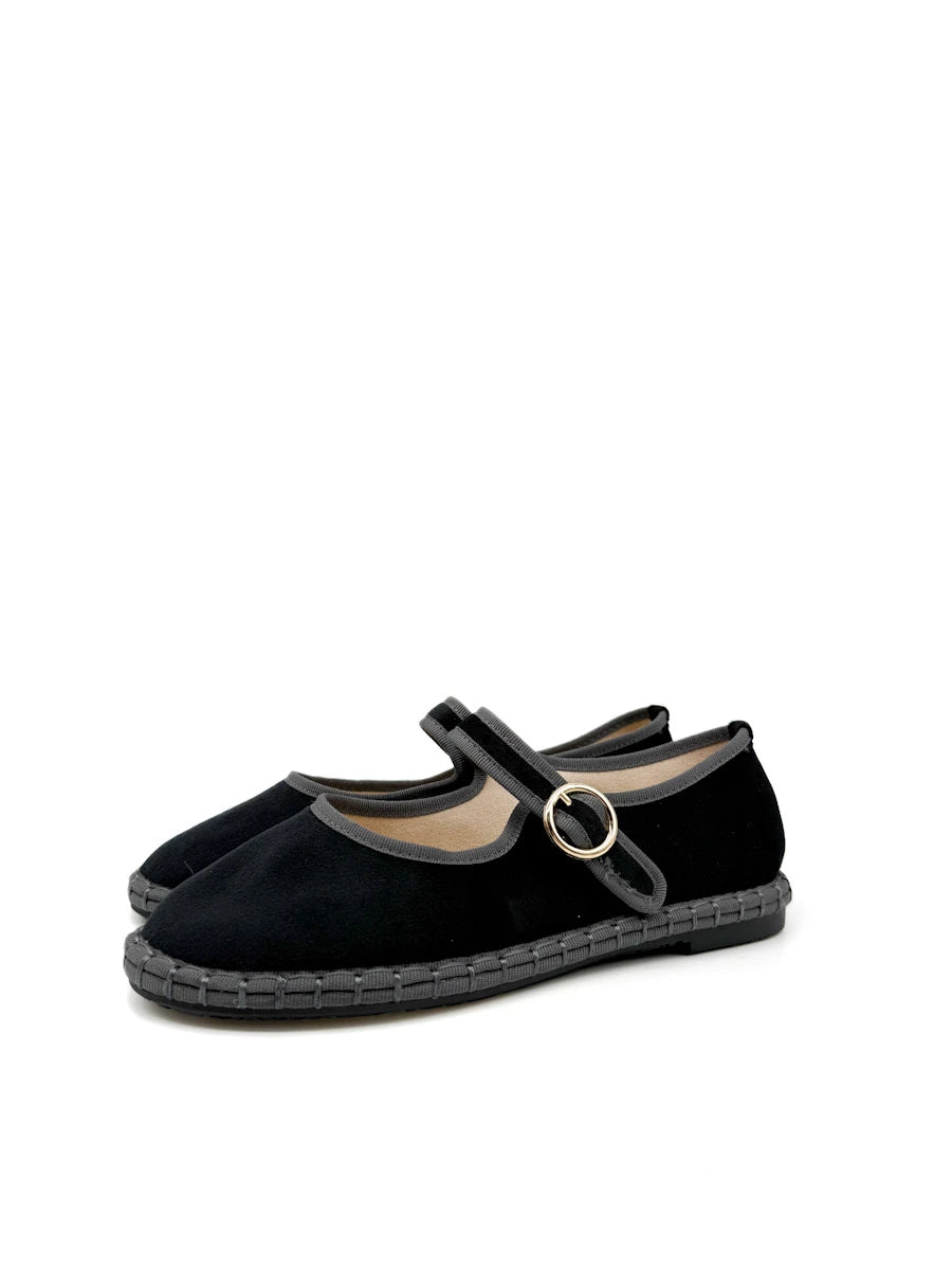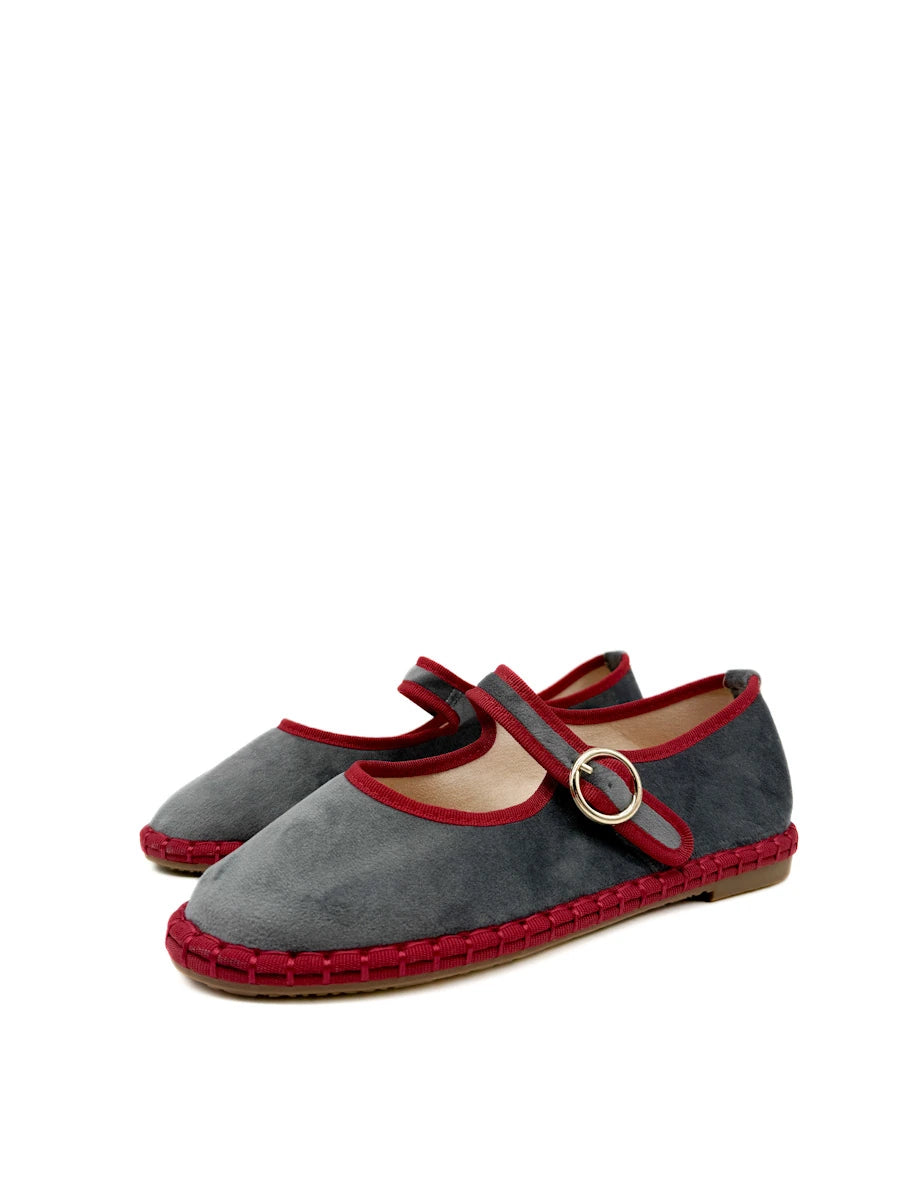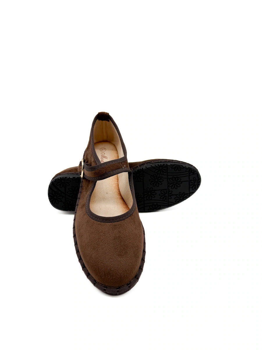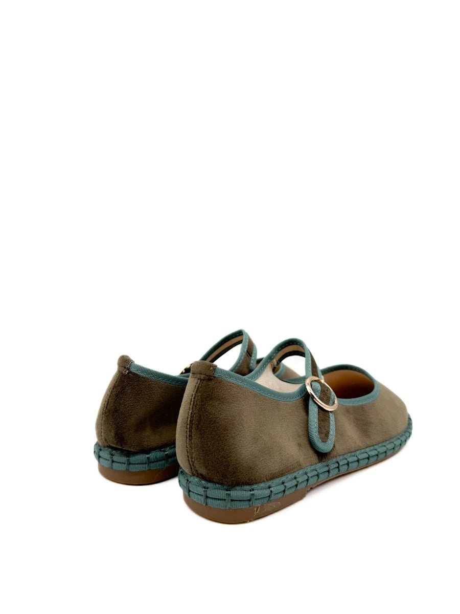 Zapatos de tipo merceditas. confeccionados en suave y lujoso terciopelo que aporta una elegancia , La suela está adornada con un detalle de costura festón, y una tira con una hebilla de aro en color dorado cruza el empeine. Este diseño combina elementos clásicos con toques modernos.