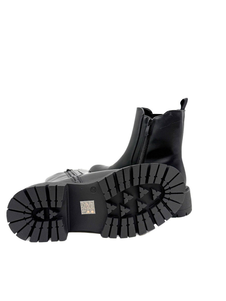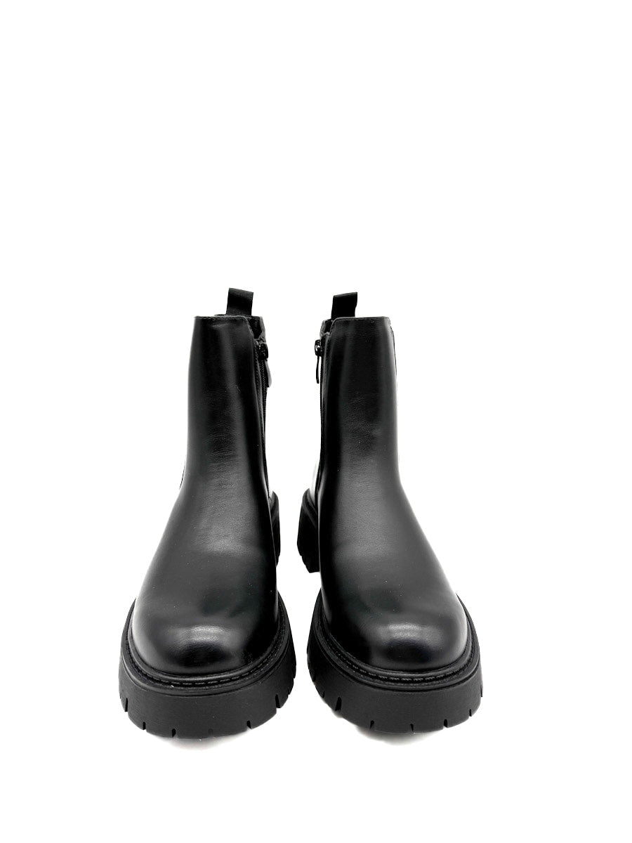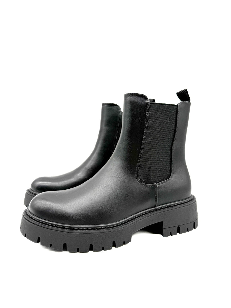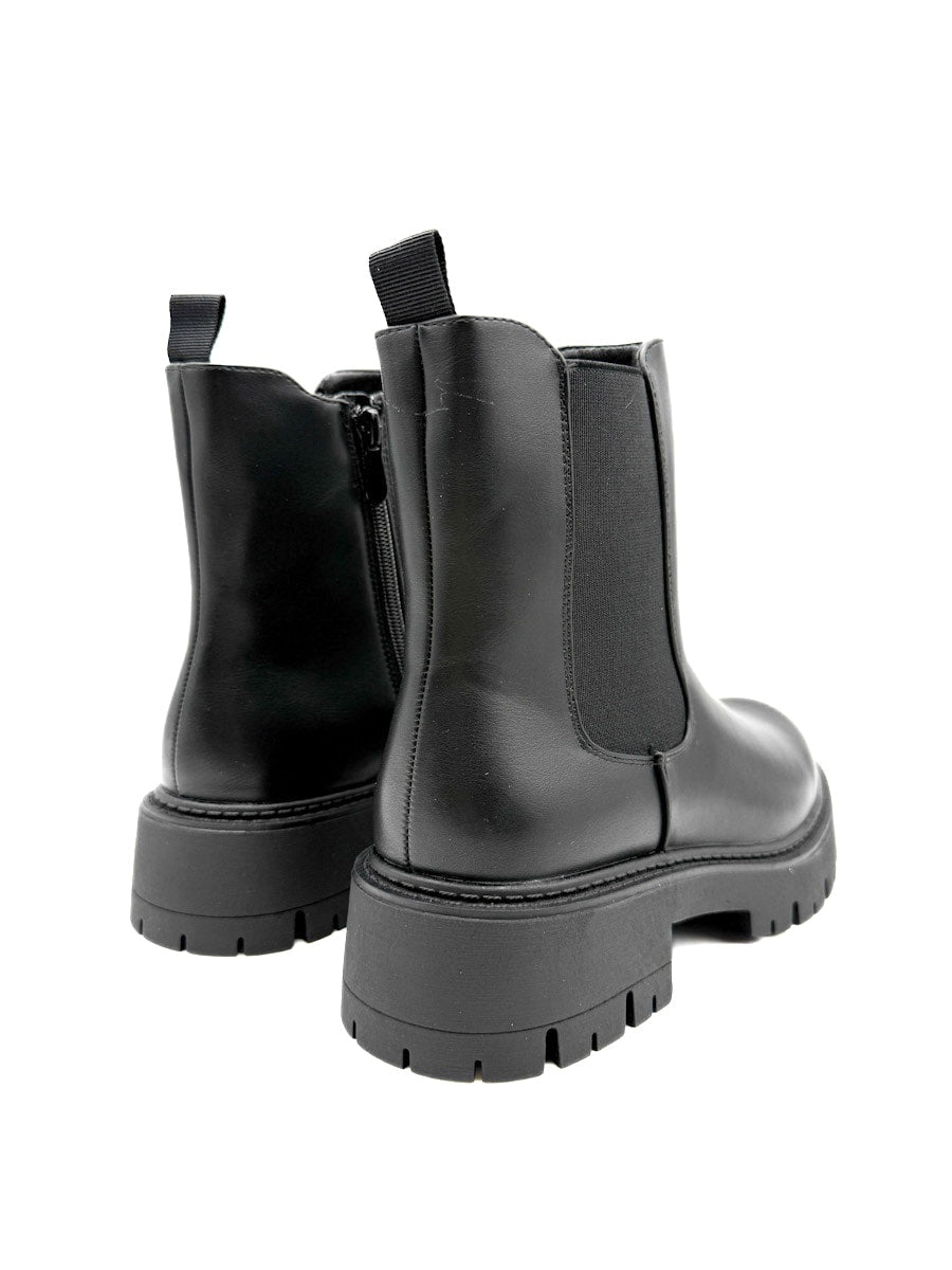 Botín chelsea de cuero sintético negro, de diseño robusto y estilo moderno. Caña media se caracterizan por el panel lateral elástico que facilita su calce, y una suela gruesa con relieve y tacón bajo, que añade un toque distintivo y actual. En la parte posterior, se observa una cremallera y una cinta para ayudar a ponérselas. Su acabado liso y color neutro las convierte en un calzado versátil, perfecto para combinar con una variedad de atuendos informales y urbanos.