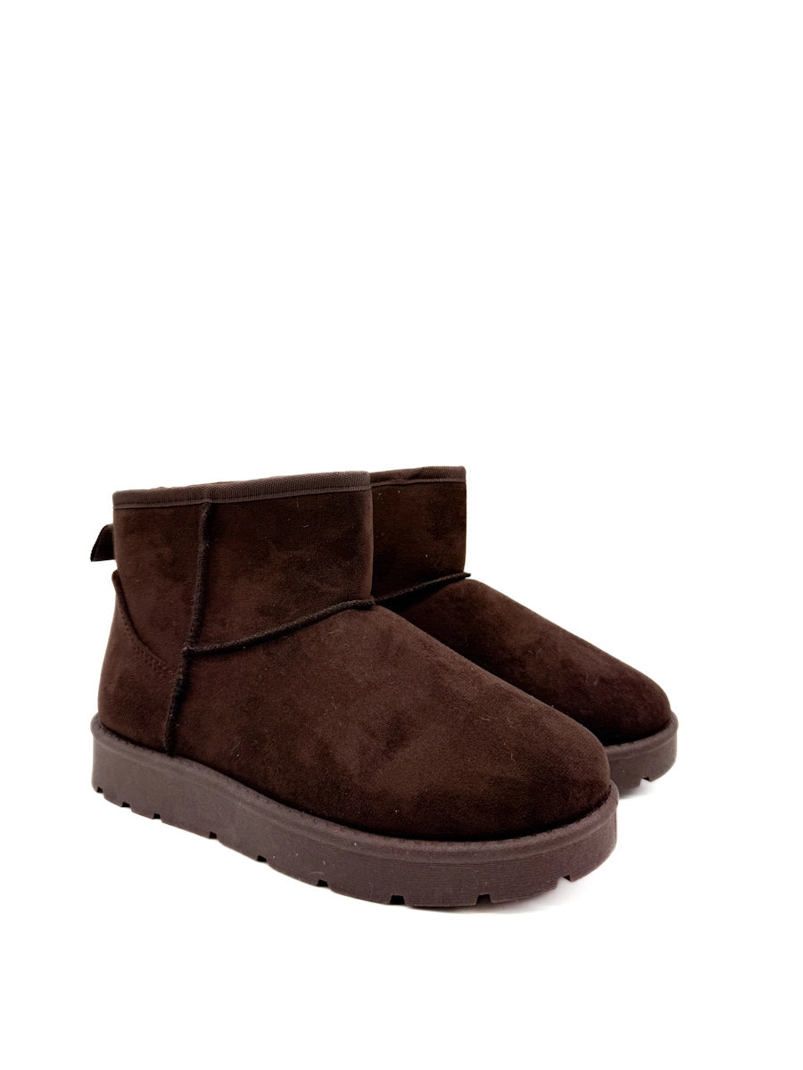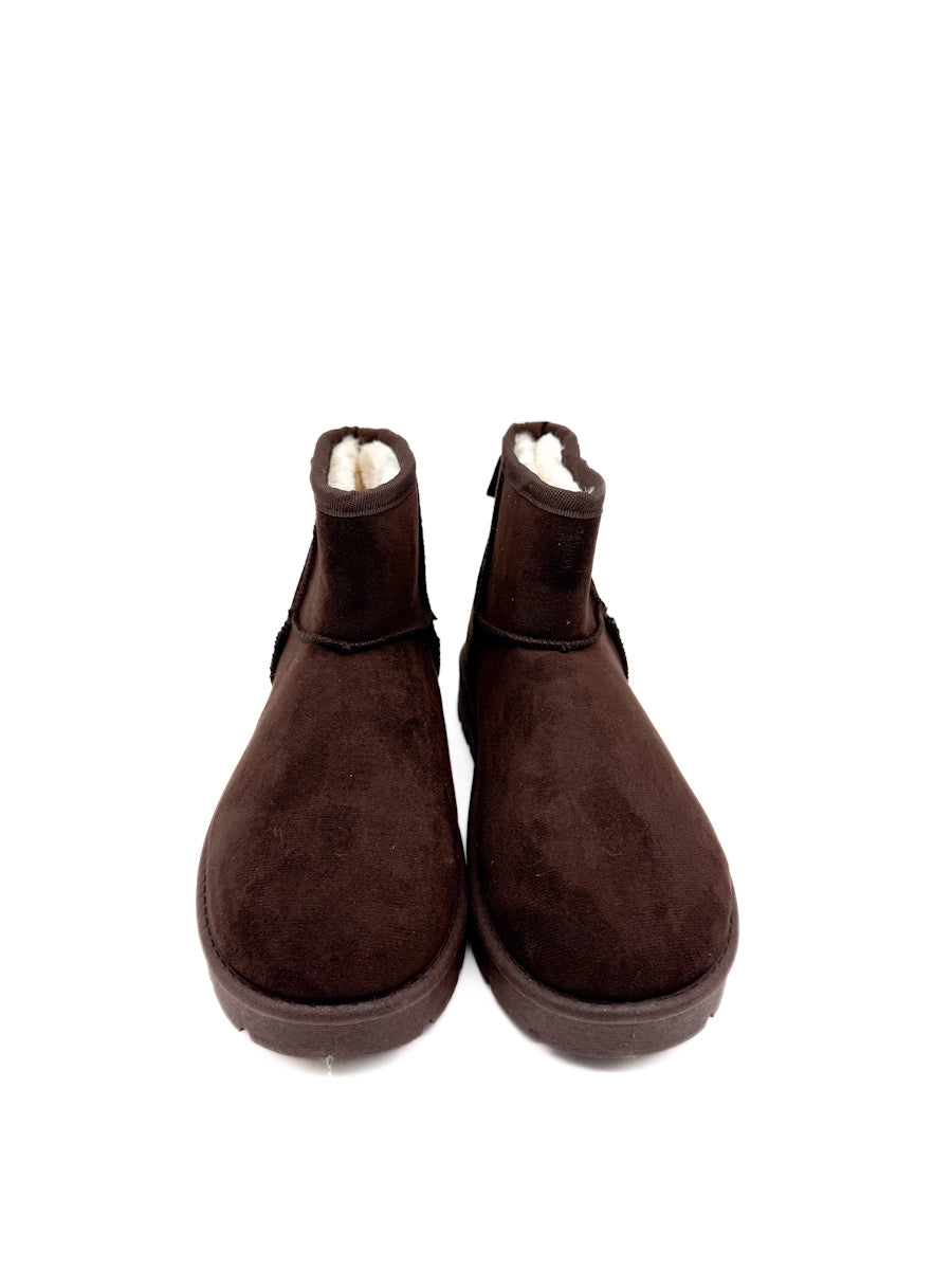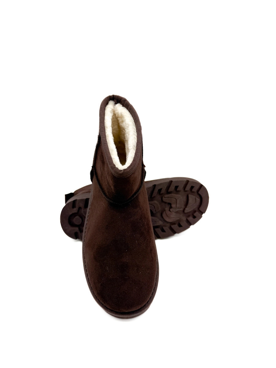 Botín nieve de estilo australiana, confeccionados en un material de color marrón oscuro con un acabado que antelina. Están diseñados para el frío, ya que el interior está completamente forrado de efecto borreguillo de color blanco cremoso, Tienen una silueta robusta, con costuras exteriores visibles en los laterales y un tirador de tela en la parte trasera para facilitar el calce. La suela es gruesa, de EVA del mismo color marrón, con un patrón de relieve para un buen agarre.