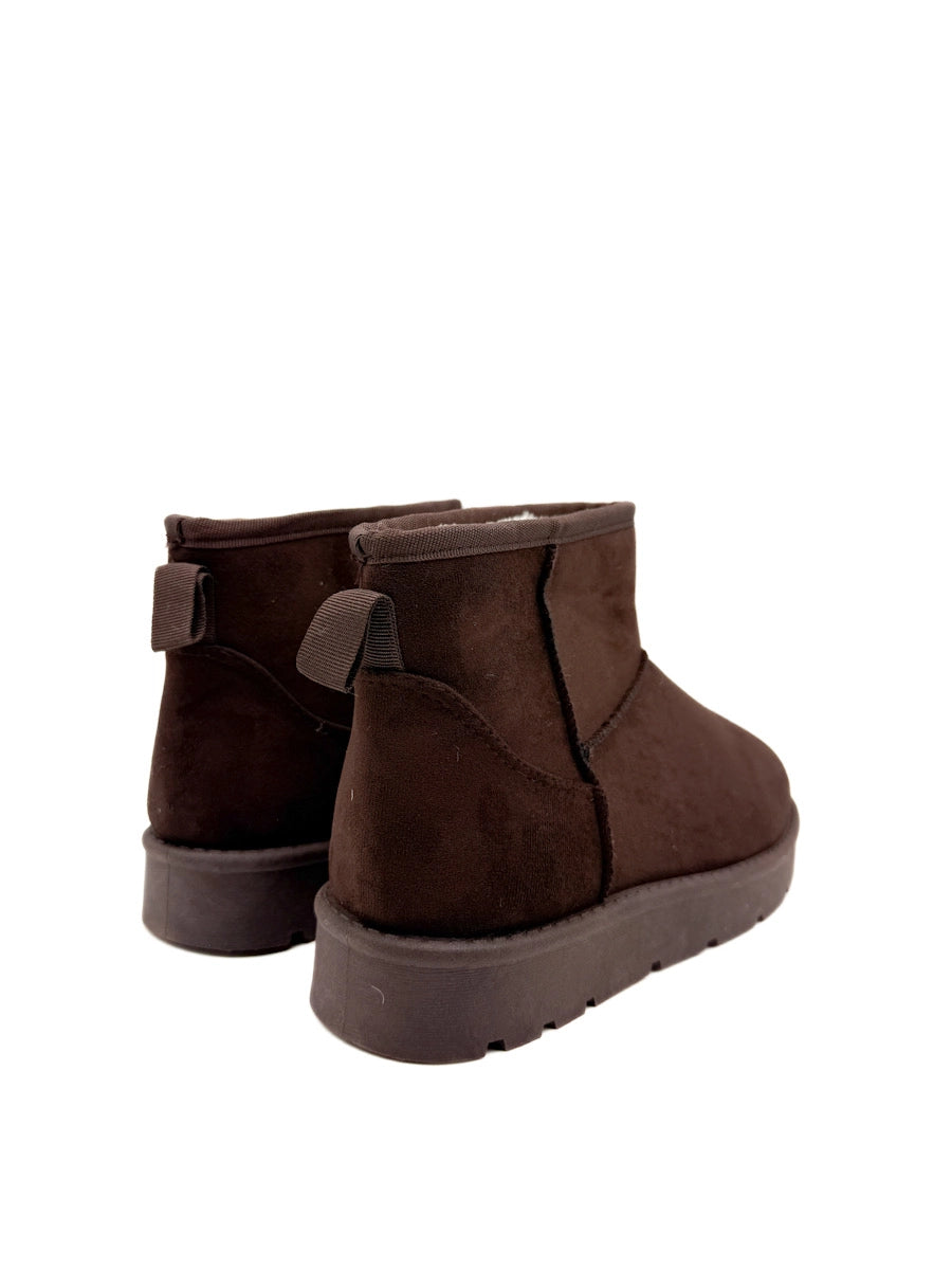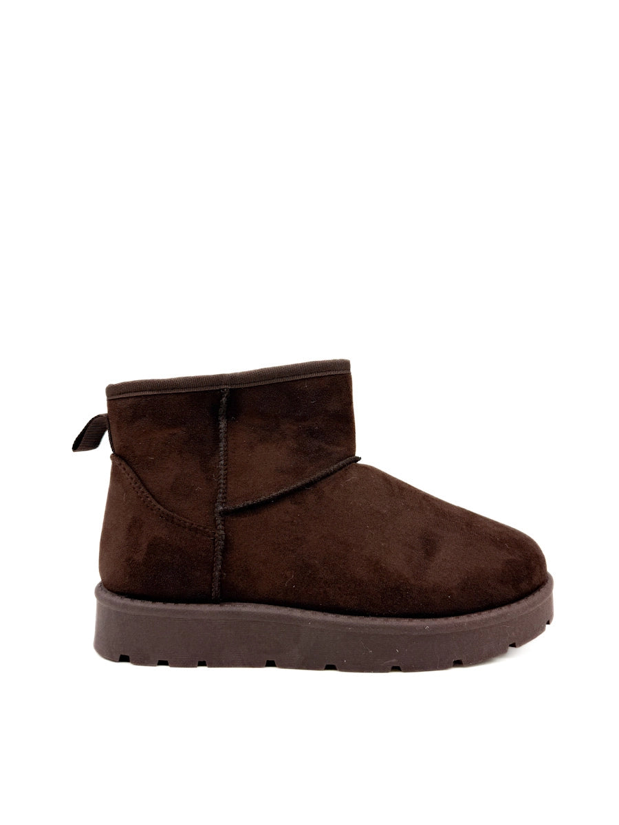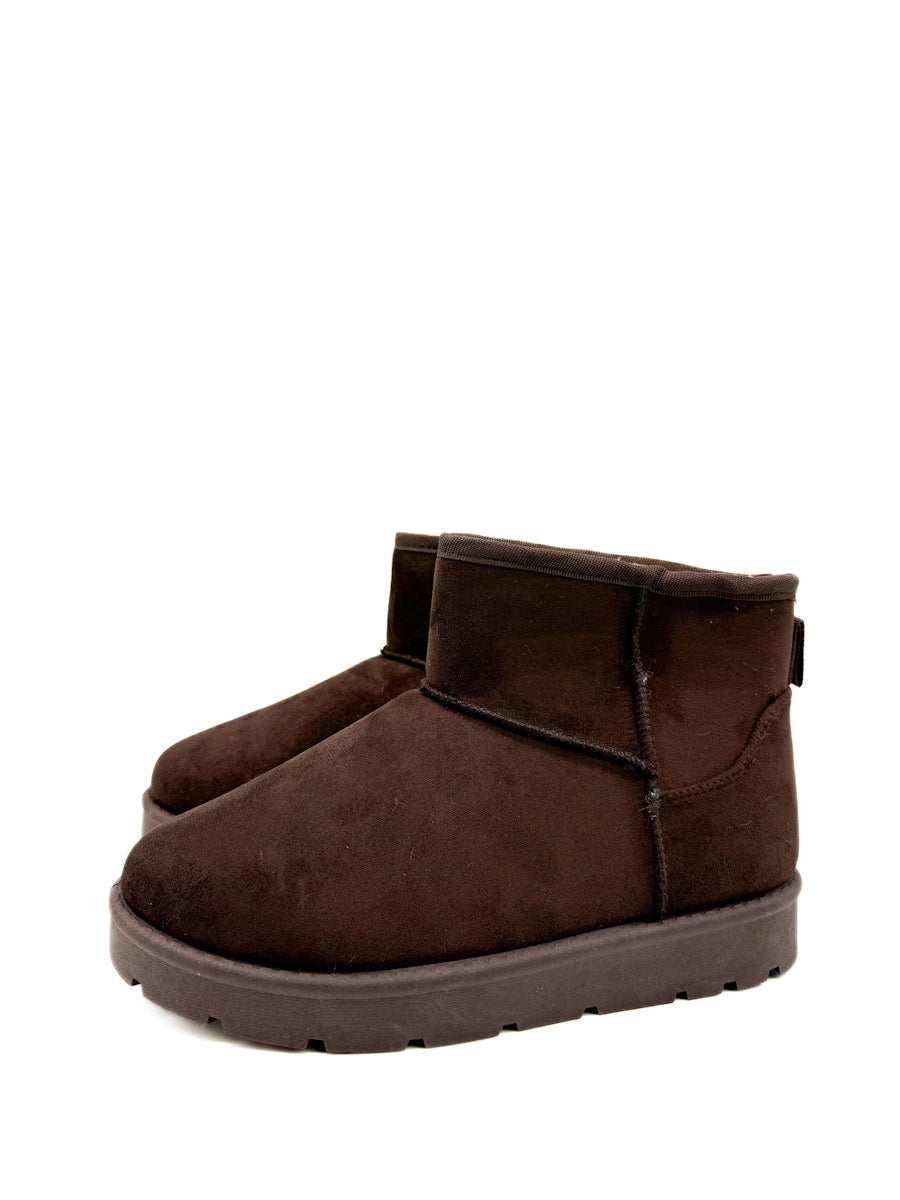 Botín nieve de estilo australiana, confeccionados en un material de color marrón oscuro con un acabado que antelina. Están diseñados para el frío, ya que el interior está completamente forrado de efecto borreguillo de color blanco cremoso, Tienen una silueta robusta, con costuras exteriores visibles en los laterales y un tirador de tela en la parte trasera para facilitar el calce. La suela es gruesa, de EVA del mismo color marrón, con un patrón de relieve para un buen agarre.