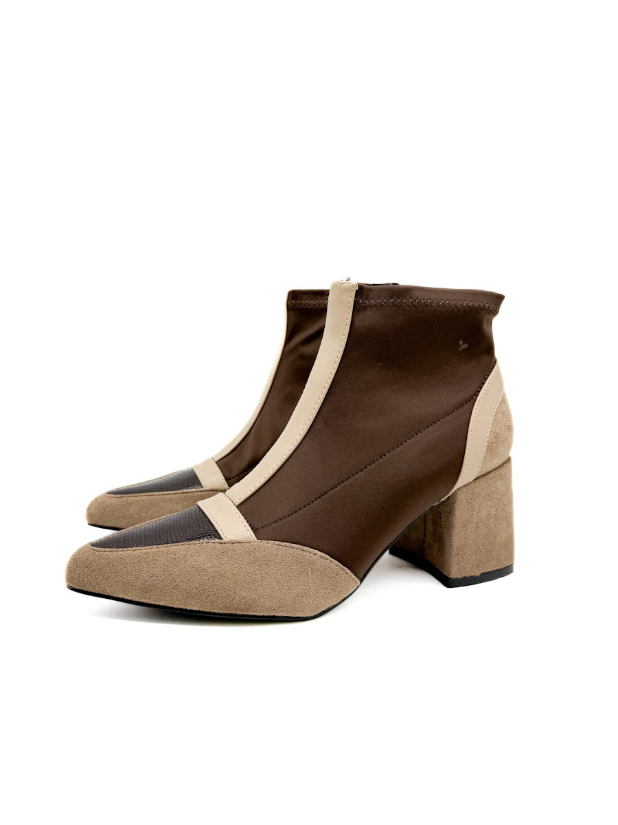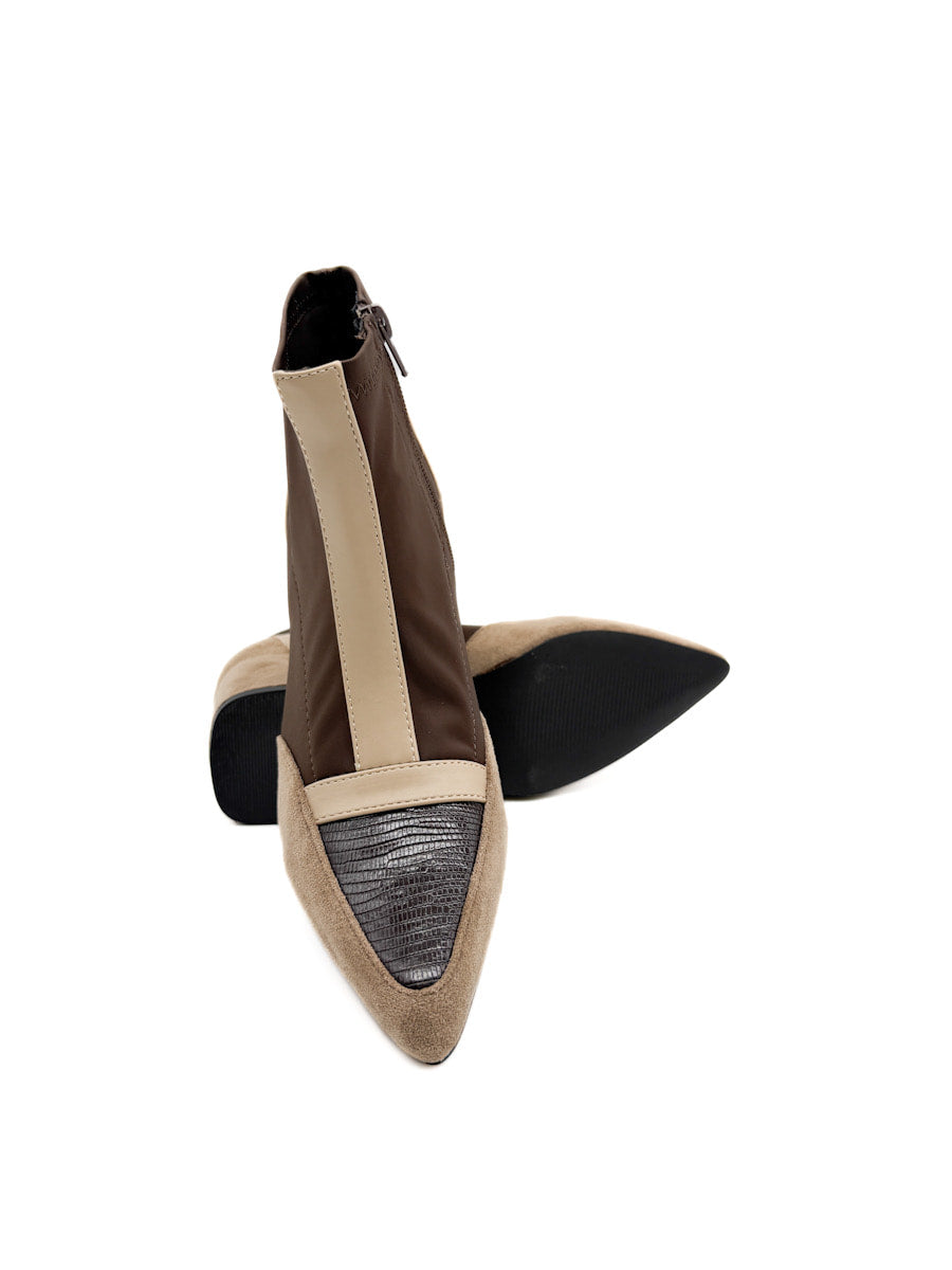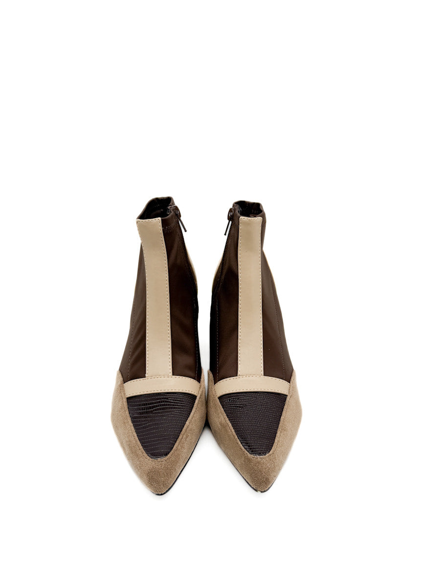 Botín de tobillo diseño elegante y moderno, combinando diferentes tonos de marrón elástico y beige en una mezcla de materiales que incluyen antelina, piel lisa y textura de efecto piel de cocodrilo en la punta. Su silueta se caracteriza por un tacón grueso y cuadrado de color beige que aporta estabilidad y estilo, mientras que el corte ajustado al tobillo con cremallera lateral facilita su uso. La punta fina y puntiaguda realza su aire sofisticado, ideal para looks formales o semi-formales.