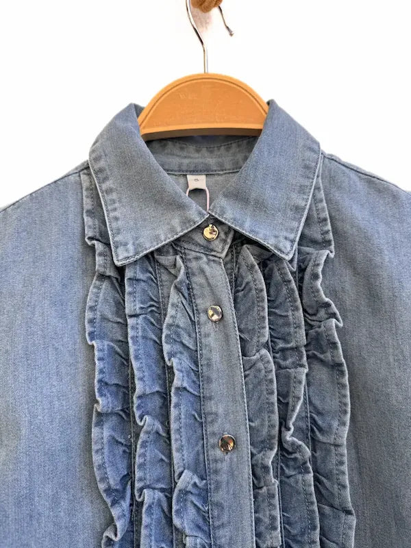 chambray, presenta un diseño clásico de manga larga y cuello camisero. Destaca su detalle de volantes verticales en la parte frontal, que aporta un toque romántico y sofisticado, junto con botones frontales que facilitan su uso. Talla viene un poco más grande, recomiendo pide una talla meno.