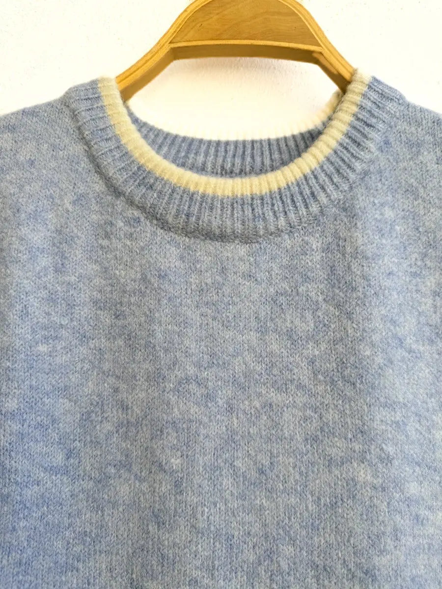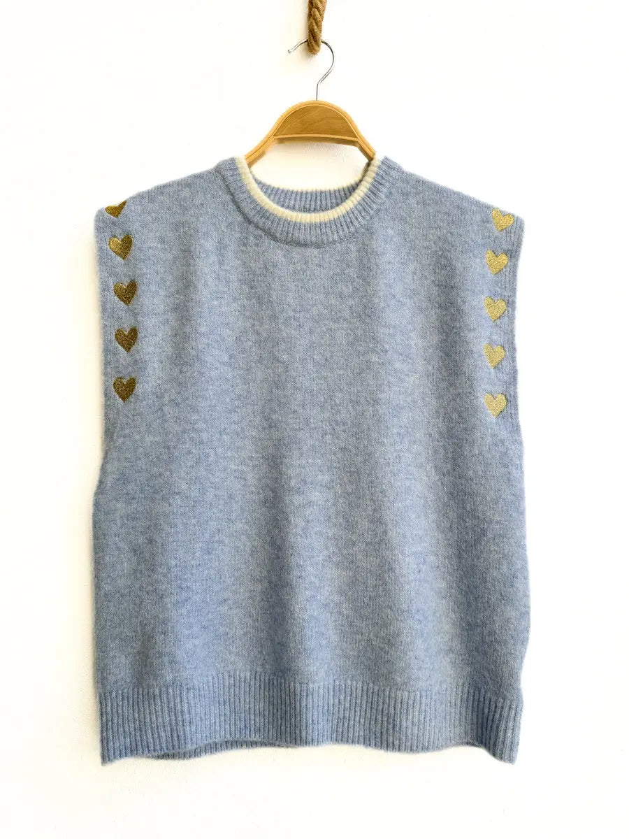 Chaleco sin mangas de punto suave en color azul claro, con un cuello redondo ribeteado en tonos blanco y azul, y un dobladillo inferior también acanalado. A cada lado de los hombros, el chaleco tiene una fila de pequeños corazones dorados que añaden un detalle decorativo sutil pero llamativo.