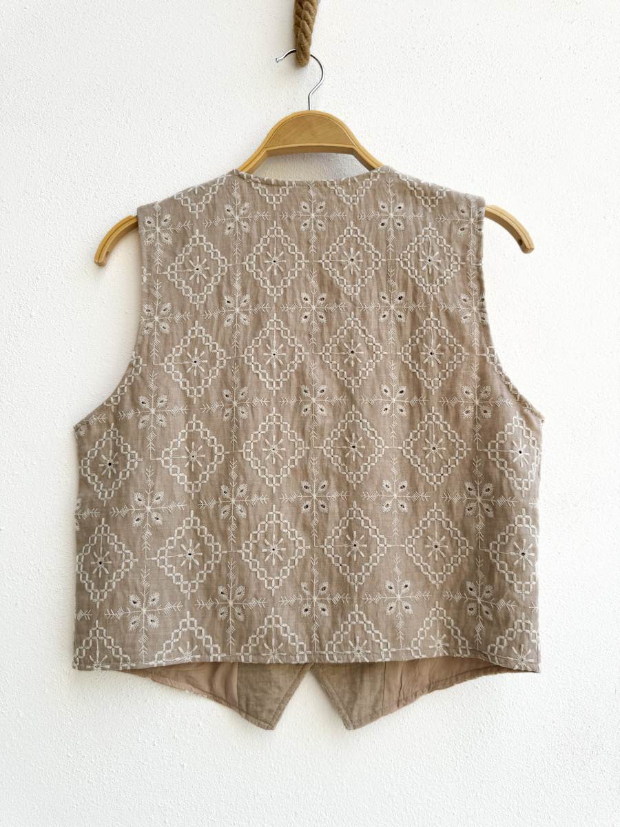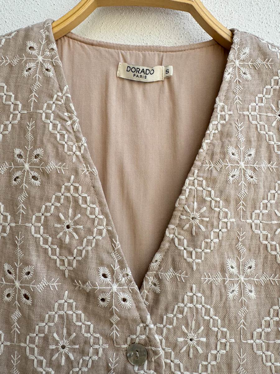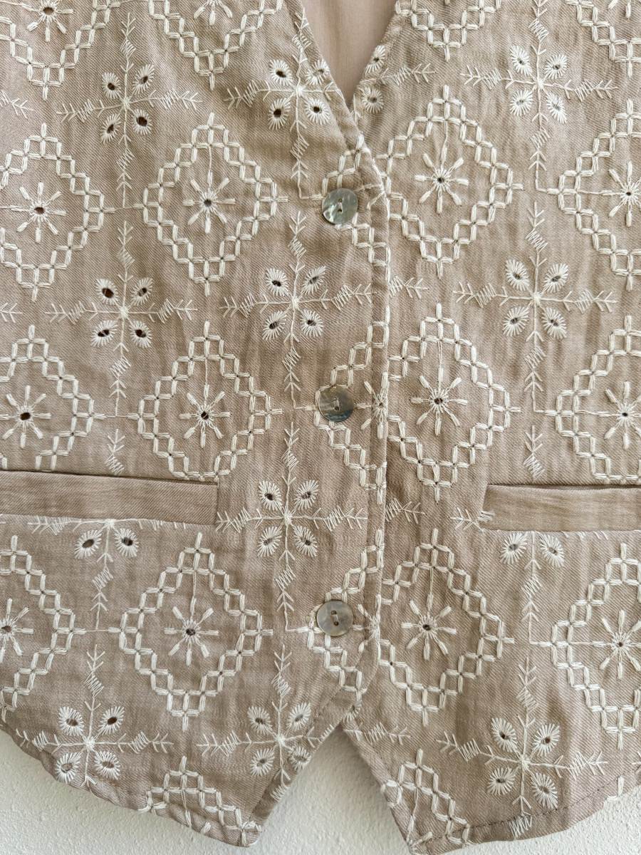 Chaleco bordado beige con dos bolsillos de adorno, cierre frontal con botónes. También tenemos pantalón a juego con el chaleco.