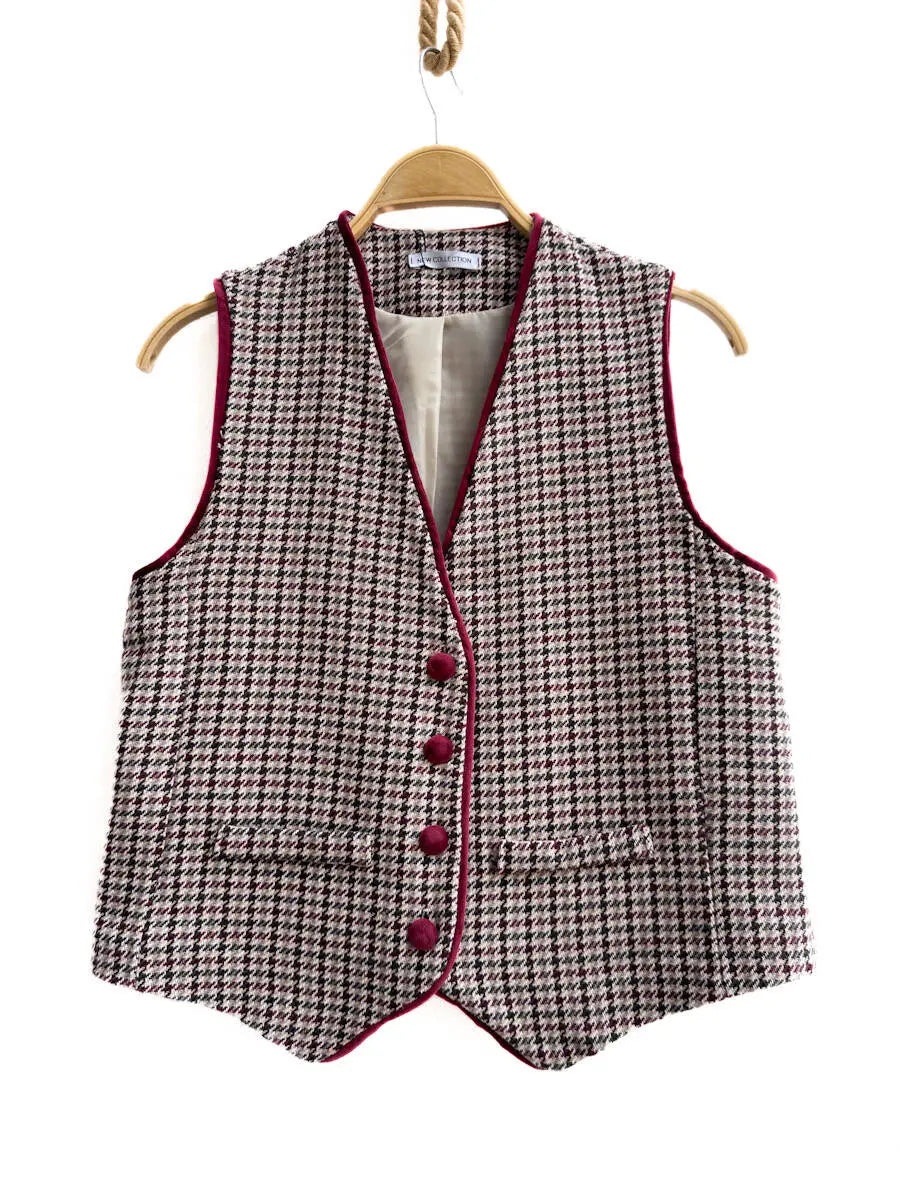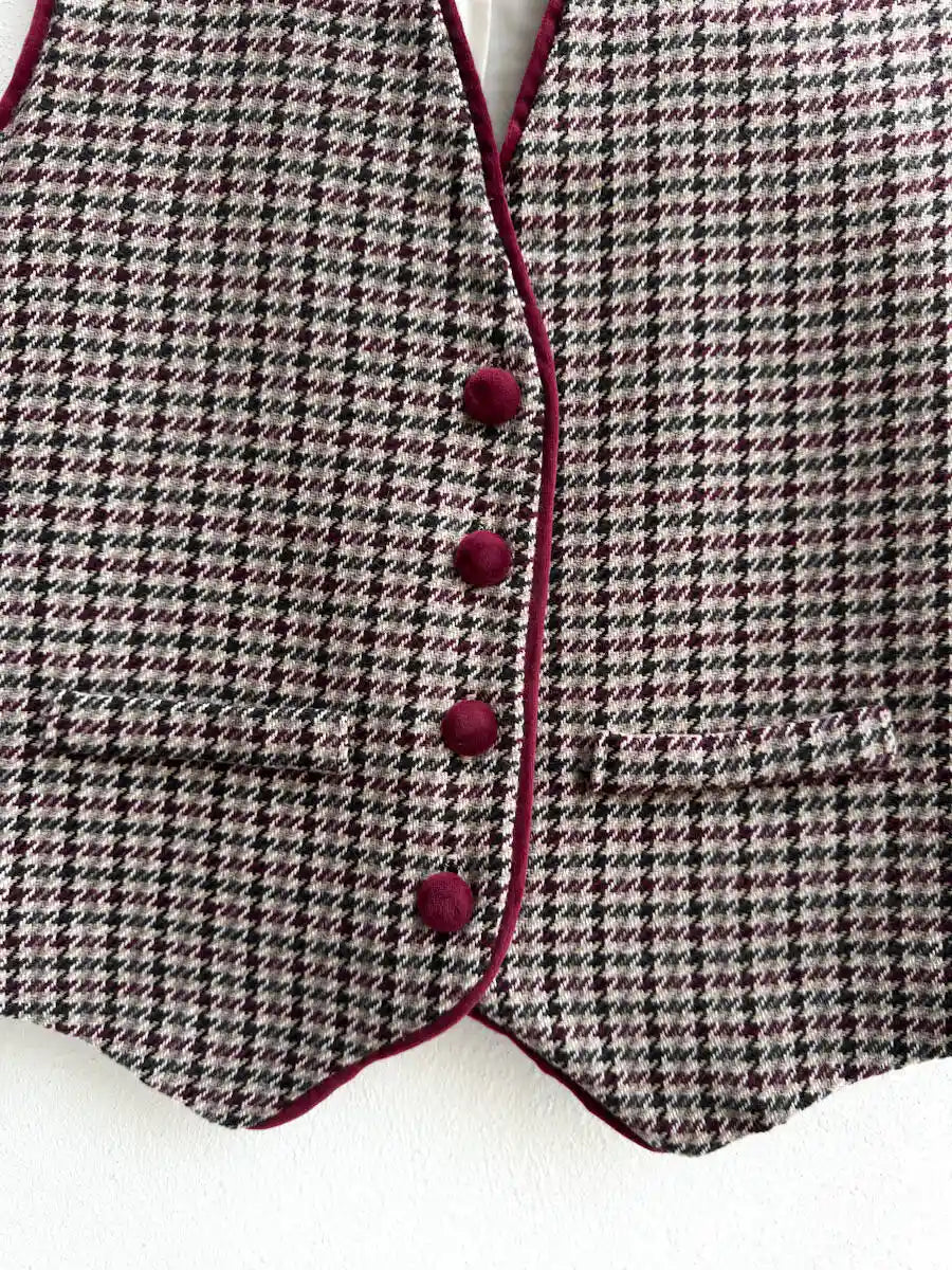 Aporta un toque de elegancia atemporal a tu look con este chaleco clásico de estampado pata de gallo. Confeccionado en un tejido estructurado y de acabado suave, destaca por sus detalles en vivo burdeos que enmarcan la silueta y sus botones forrados a juego, añadiendo un aire sofisticado y artesanal.