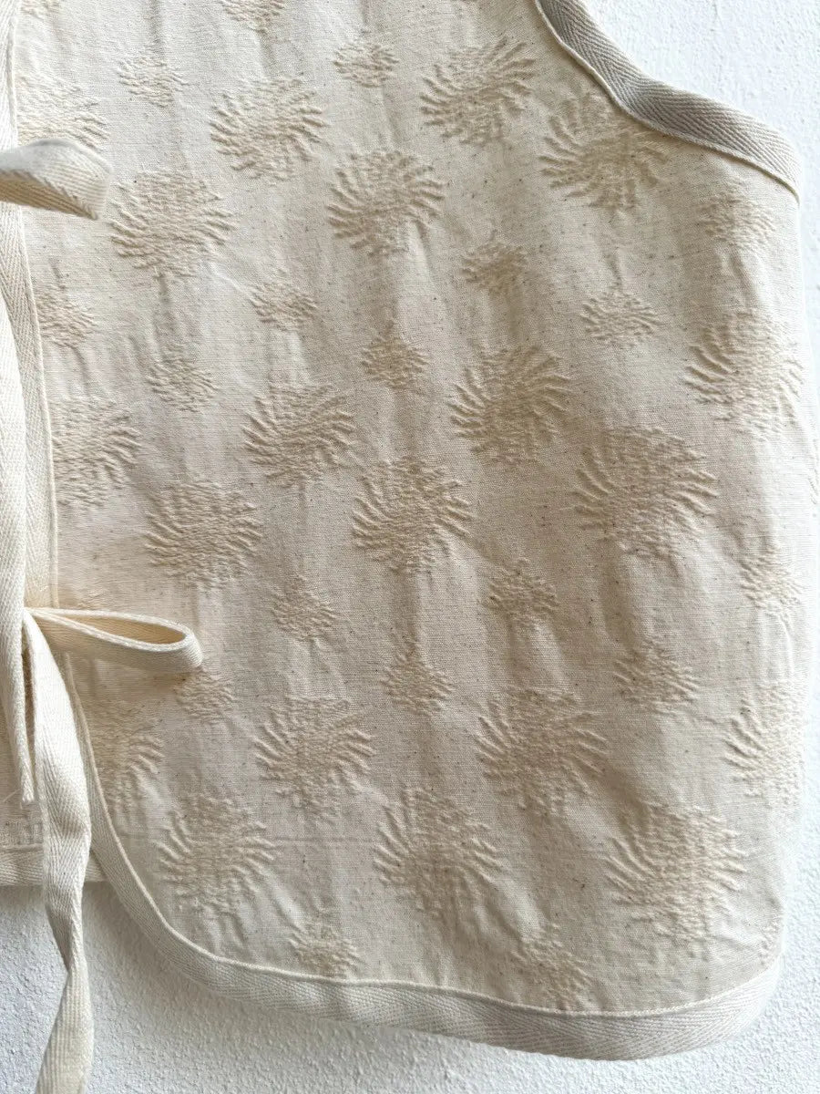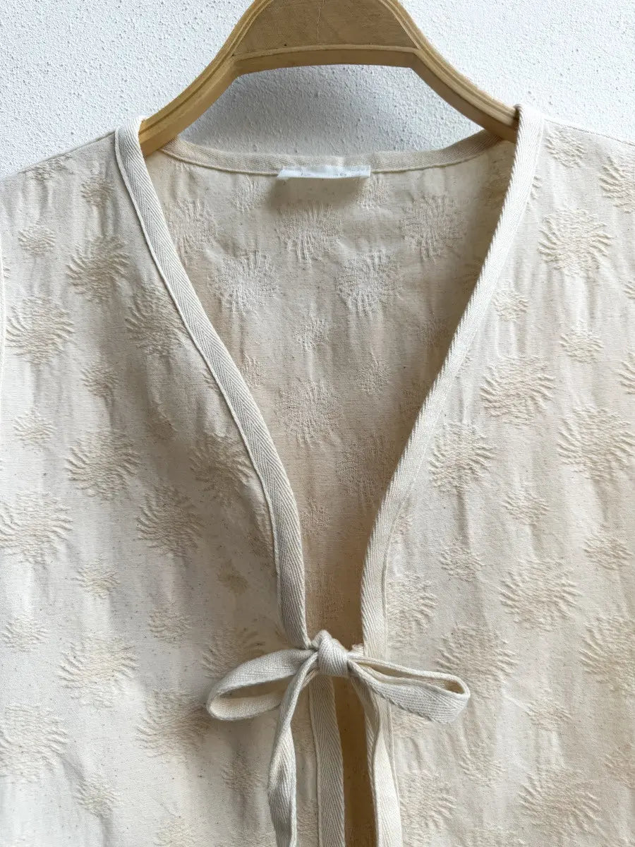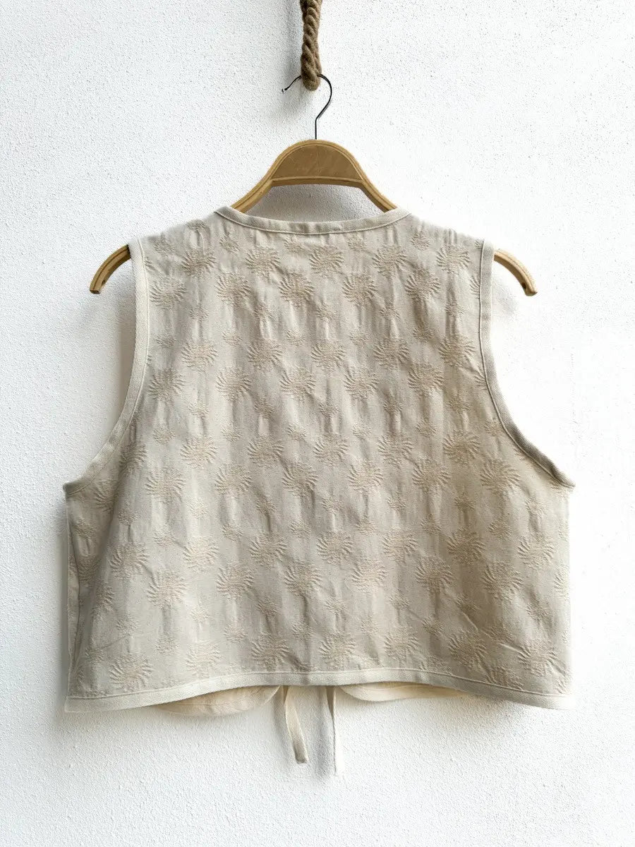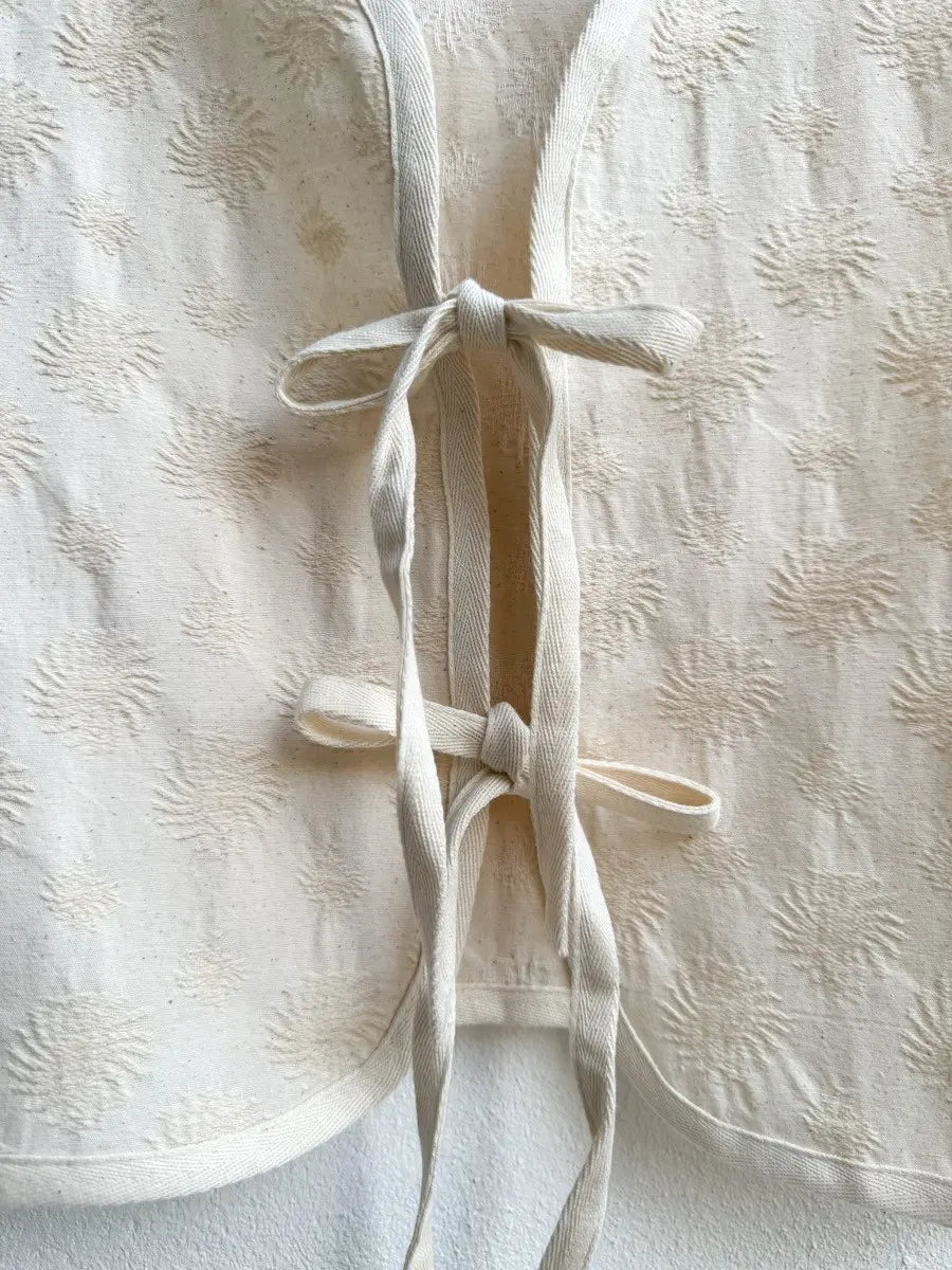 Este chaleco bordado con lazos en color beige es el complemento perfecto para cualquier outfit.