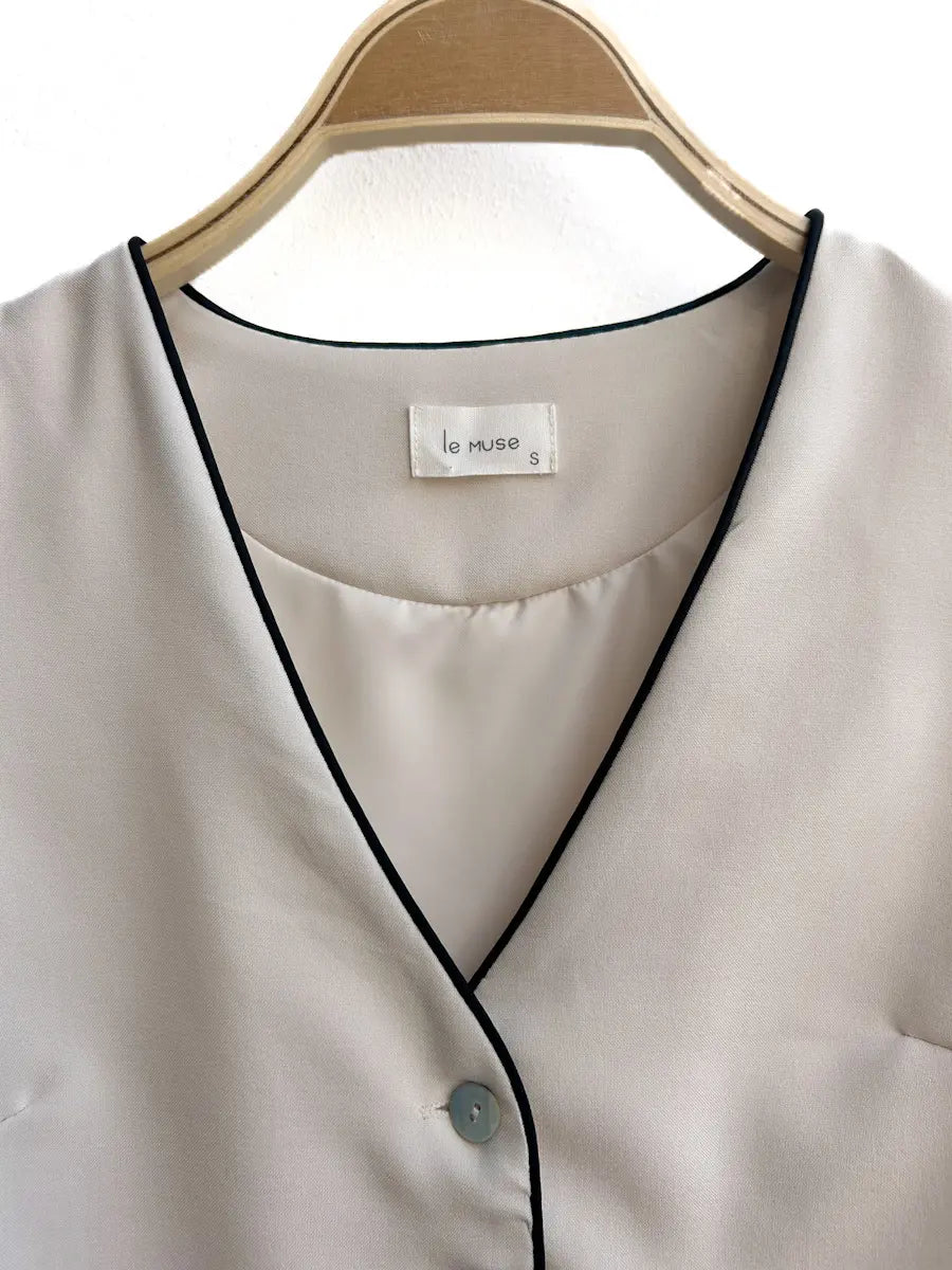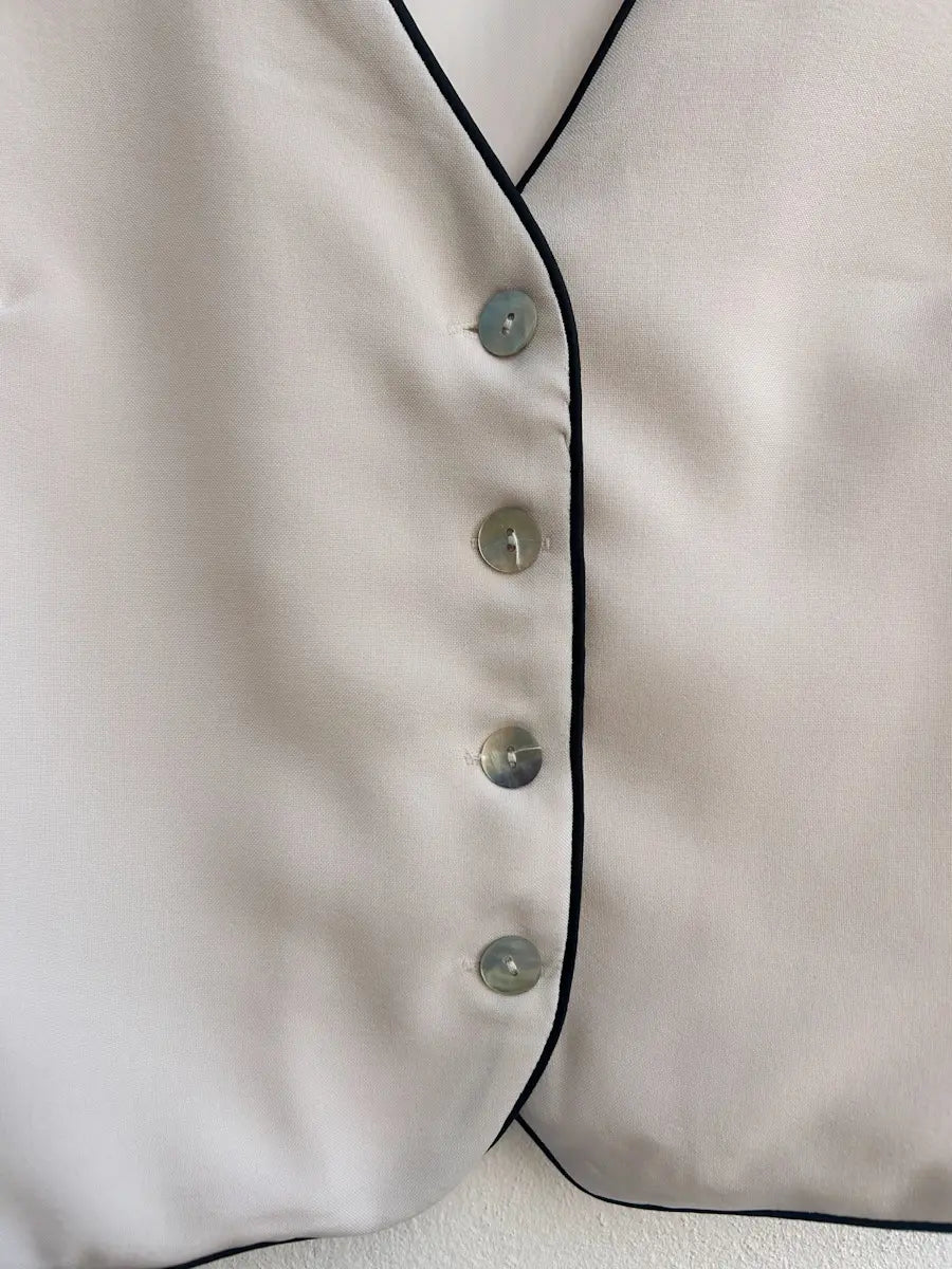 Chaleco sin mangas en color beige con botones al frente. Tiene un escote en V está decorado con una línea negra delgada en los bordes, lo que le da un toque elegante.
