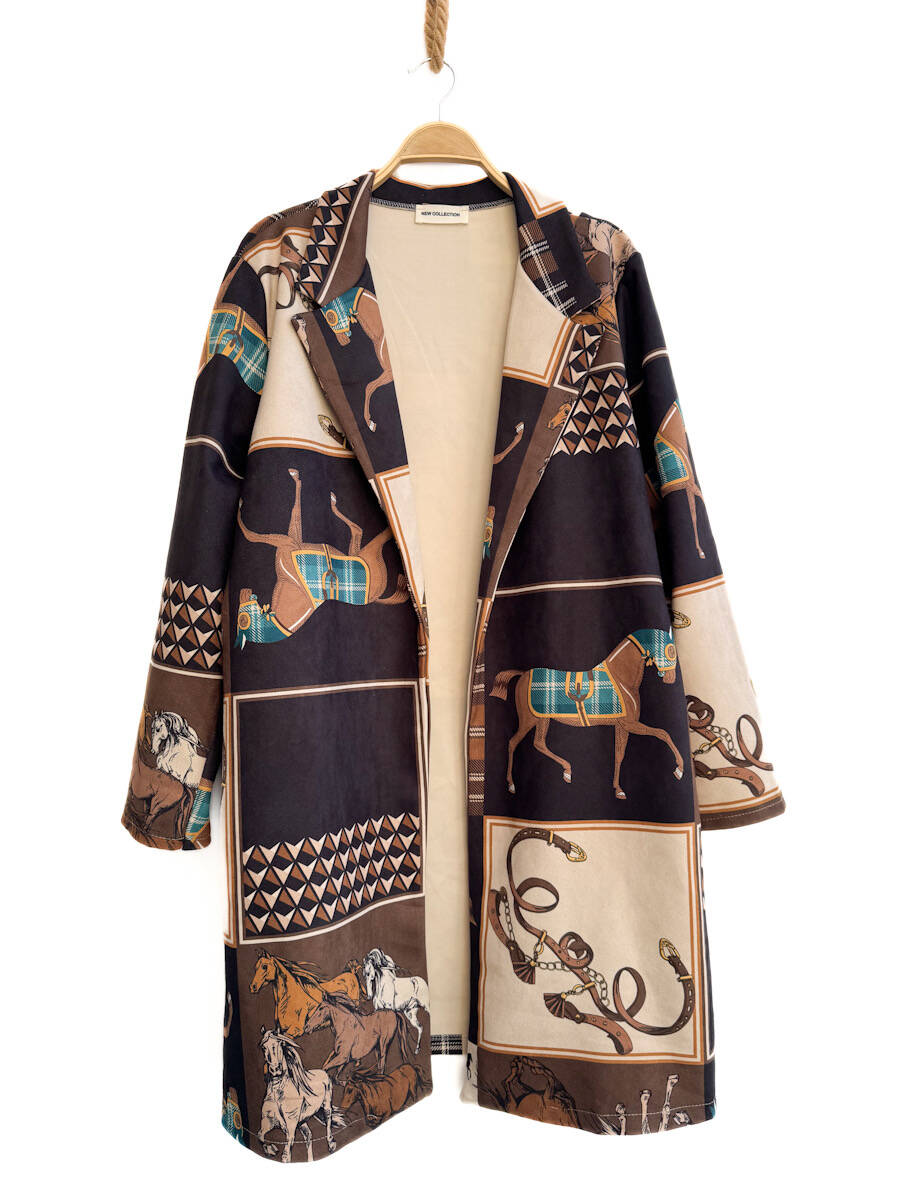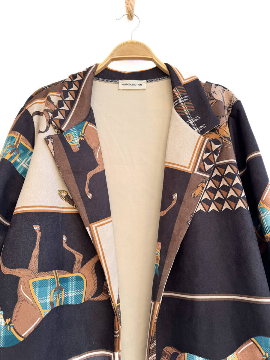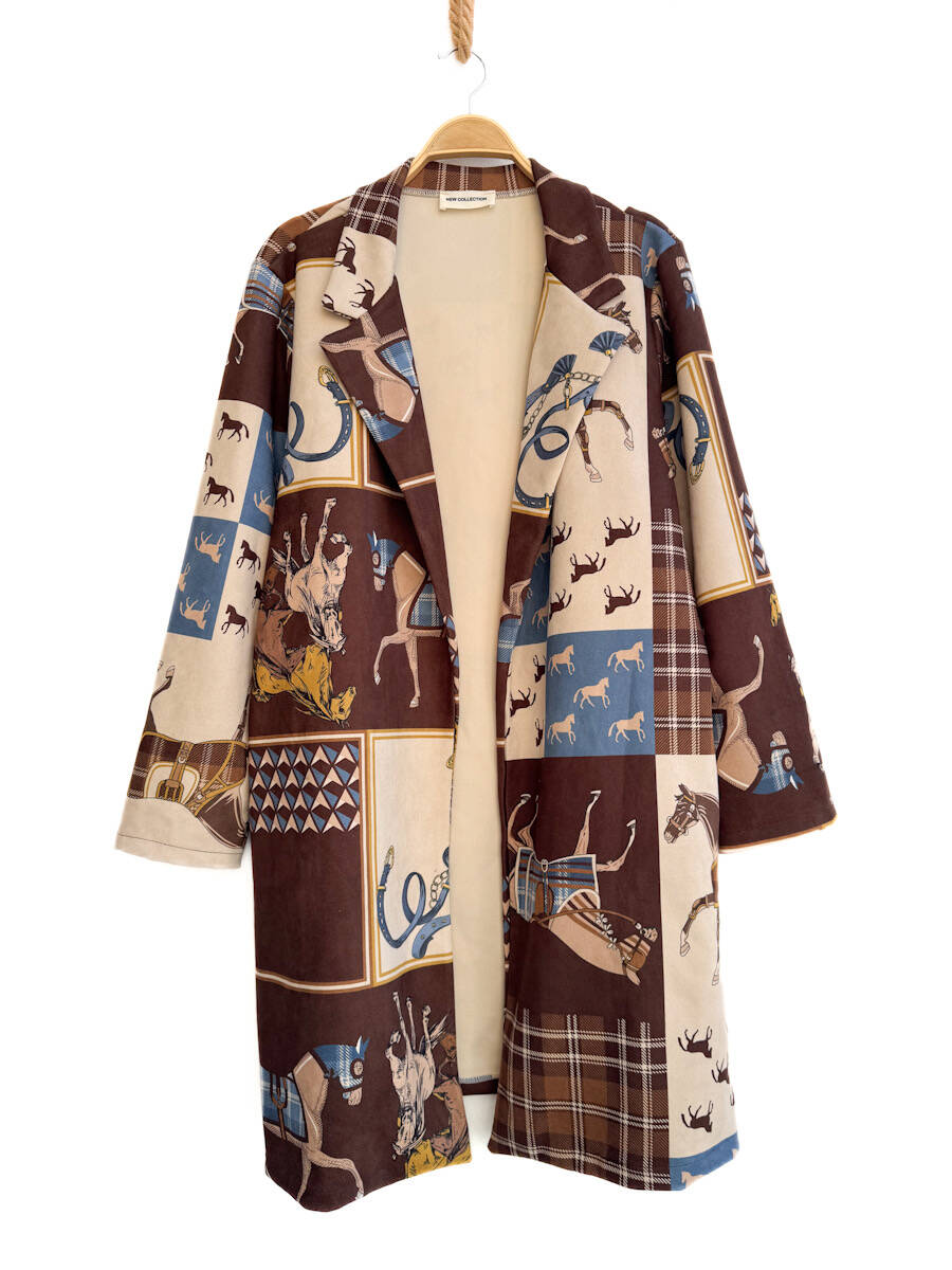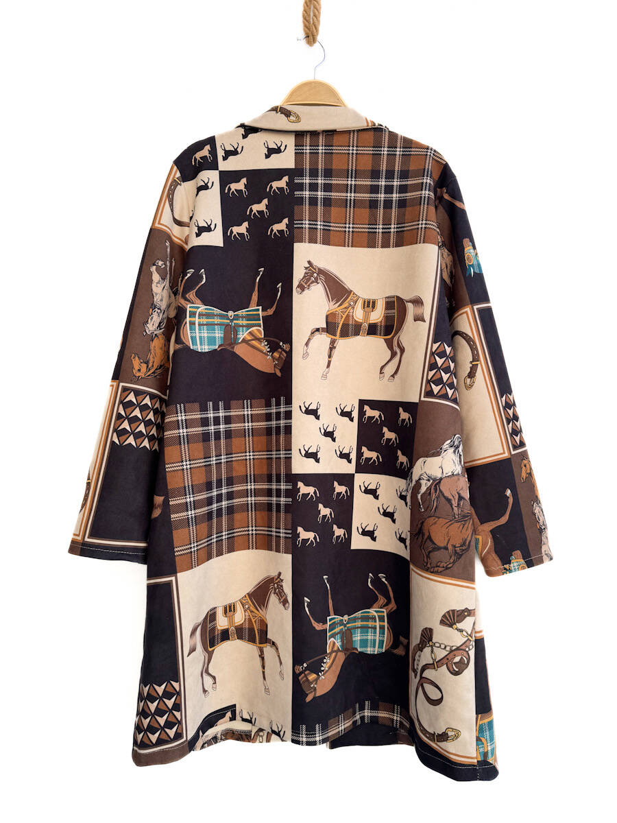 Este abrigo combina estilo y personalidad con un estampado ecuestre inspirado en motivos clásicos. Confeccionado en tela suave y ligera, presenta un diseño tipo patchwork en tonos marrones, beige y azul, ideal para quienes buscan una prenda única y con carácter. Su corte relajado y su largo medio lo hacen perfecto para combinar con looks casuales o elegantes.