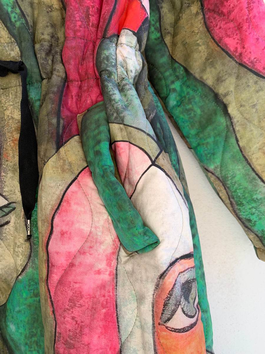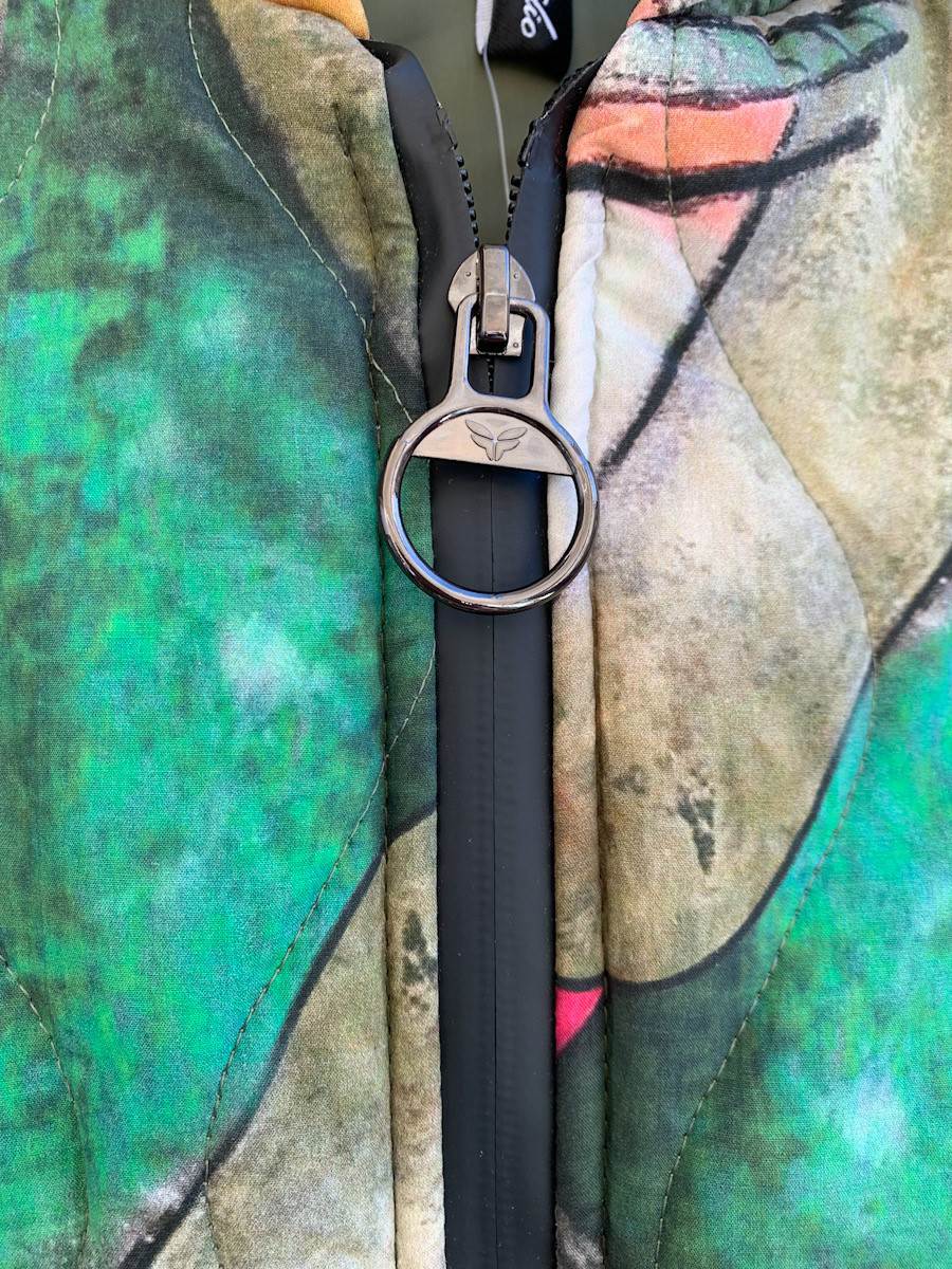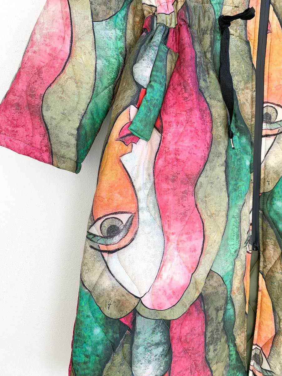 Chaqueta larga estampada con cinta de regulación, con dos bosillo delantero y capucha, Cierre con cremallera.