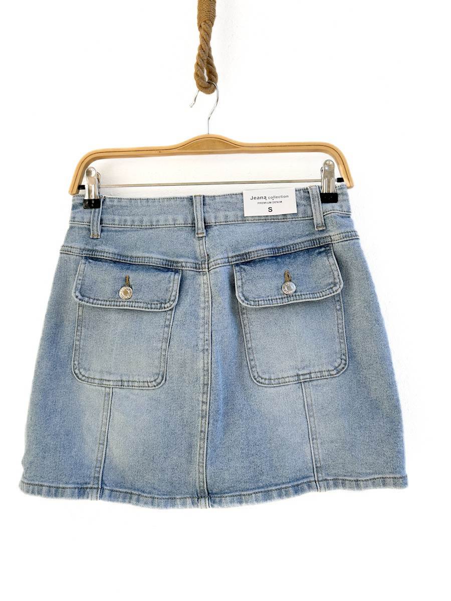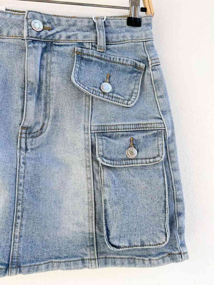 Esta es una falda de mezclilla en color azul claro con un efecto desgastado que le da un estilo vintage y casual. Tiene un diseño recto y corto, ideal para looks modernos y versátiles.