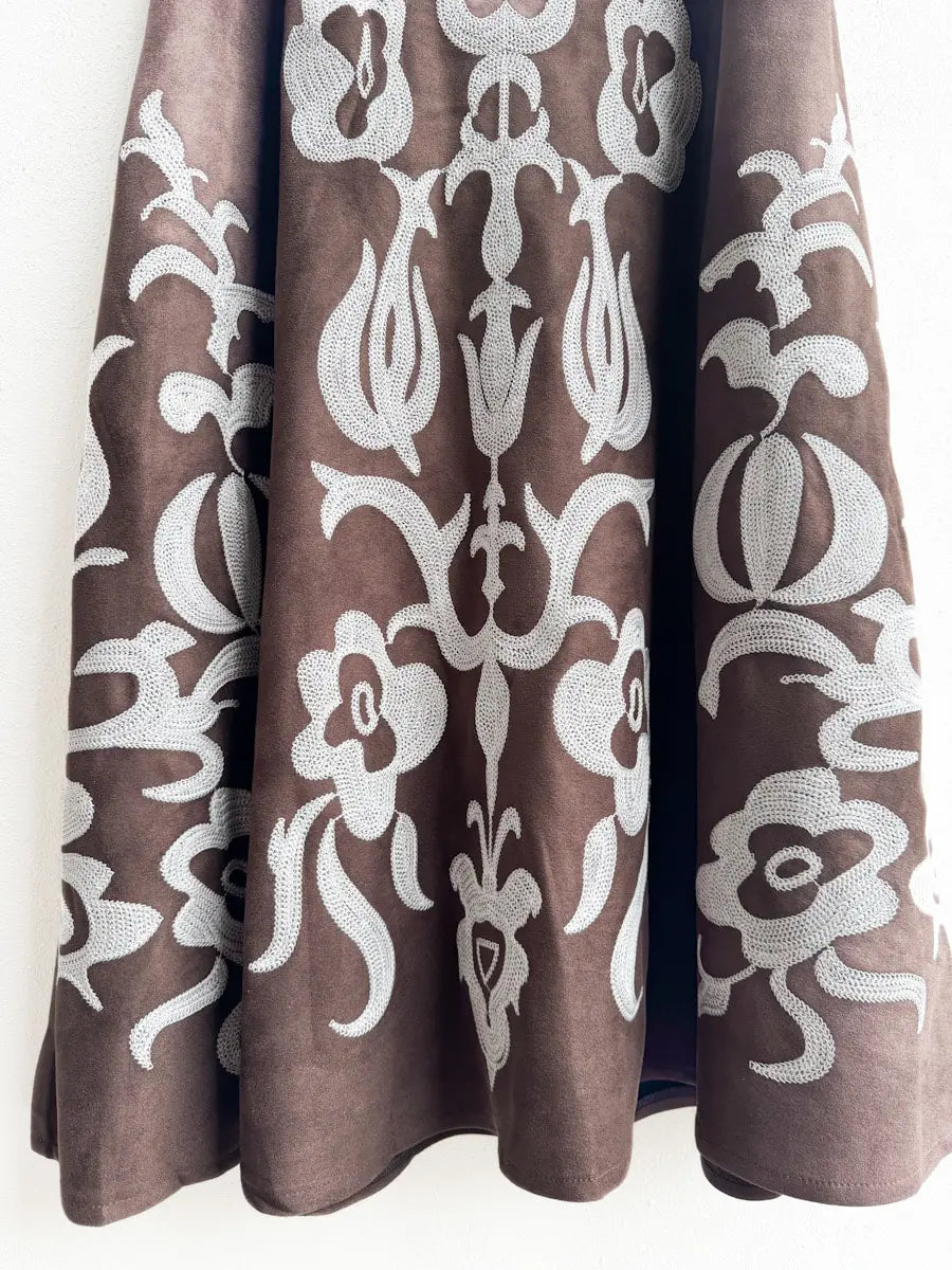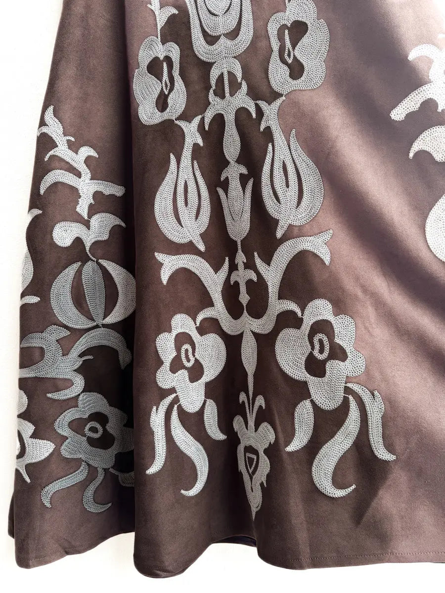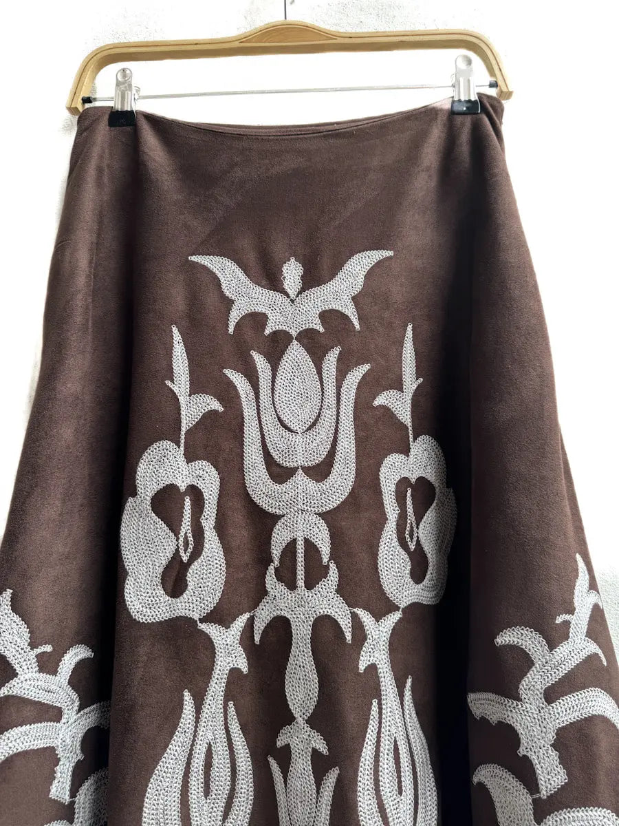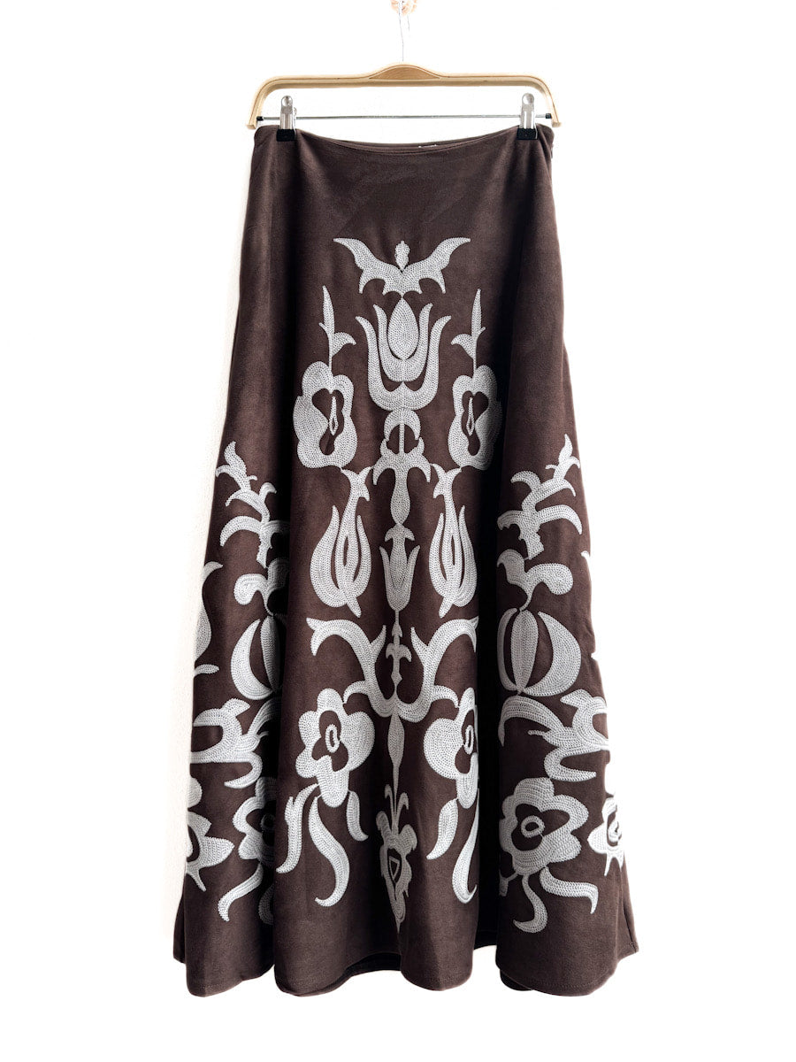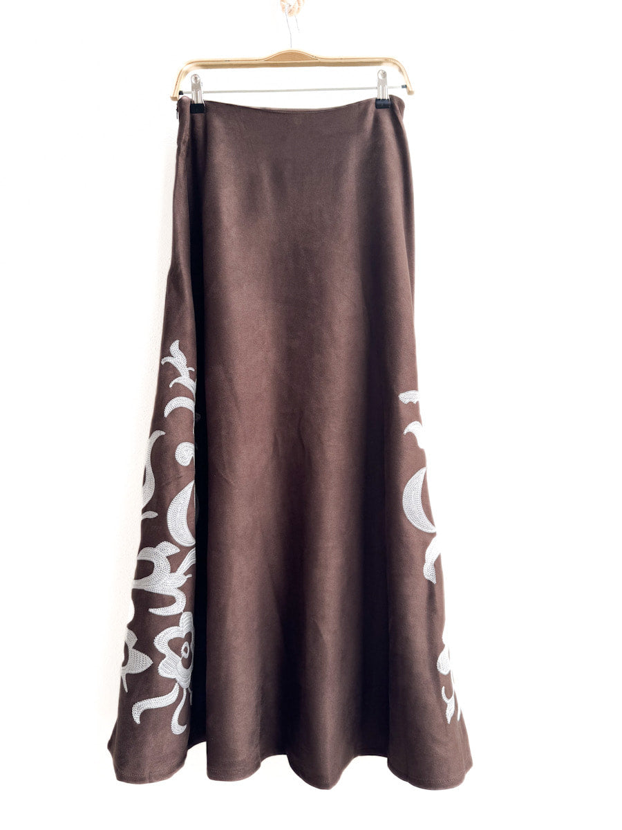 Destaca tu estilo con esta elegante falda larga en tono marrón oscuro, decorada con un intrincado bordado en color claro que forma un diseño simétrico de inspiración floral y natural. Confeccionada en una tela suave y fluida, esta pieza ofrece movimiento y comodidad, ideal para ocasiones especiales o para elevar un look casual. Su caída amplia y su detalle artesanal la convierten en una prenda única y sofisticada. Ref. FMX076