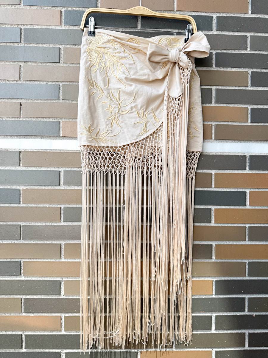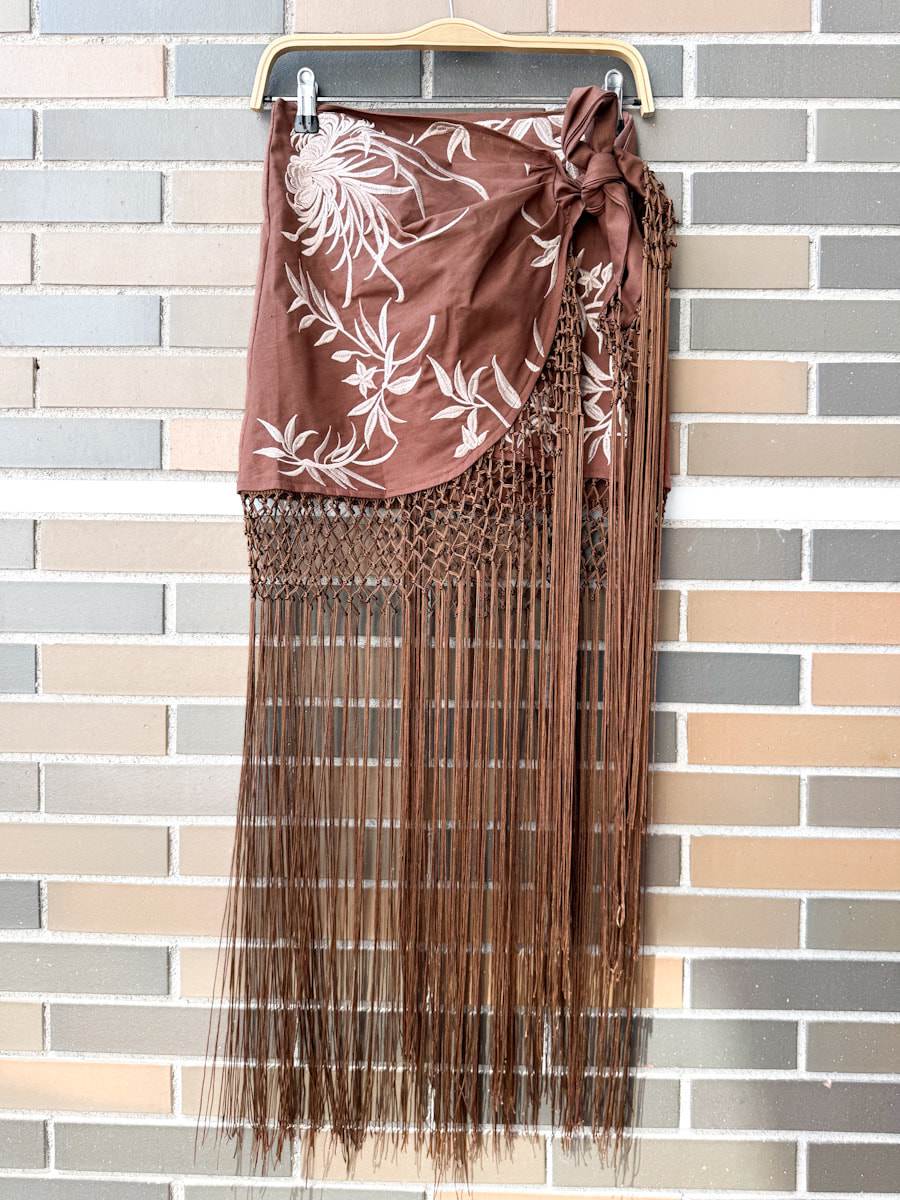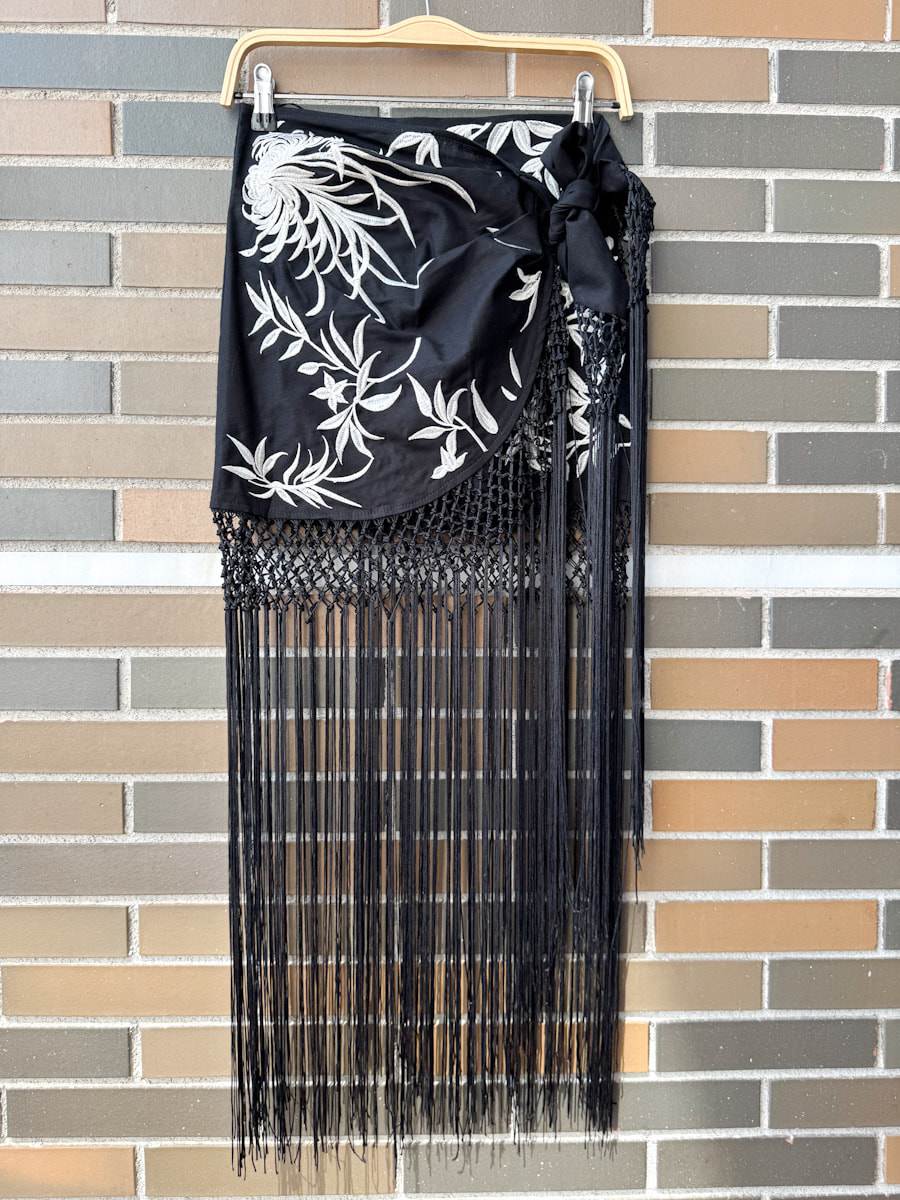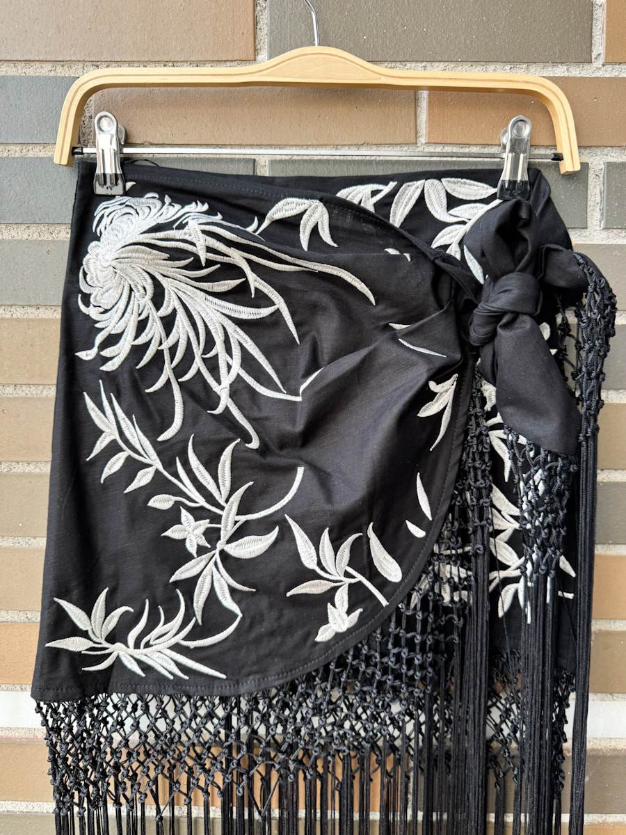 Dale un toque bohemio y sofisticado a tu look con esta falda pareo única. Confeccionada en un tejido suave, presenta un elegante bordado floral en la parte superior y un espectacular detalle de flecos largos que aportan movimiento y estilo. Se ajusta con un lazo lateral para un calce personalizado y cómodo.