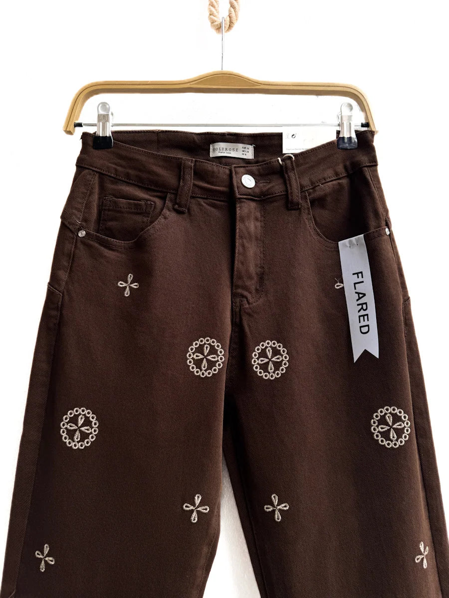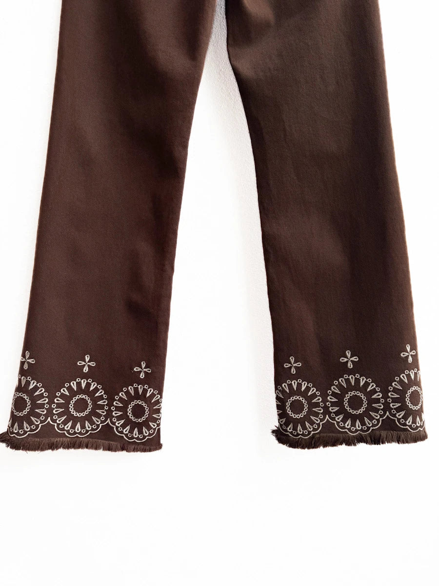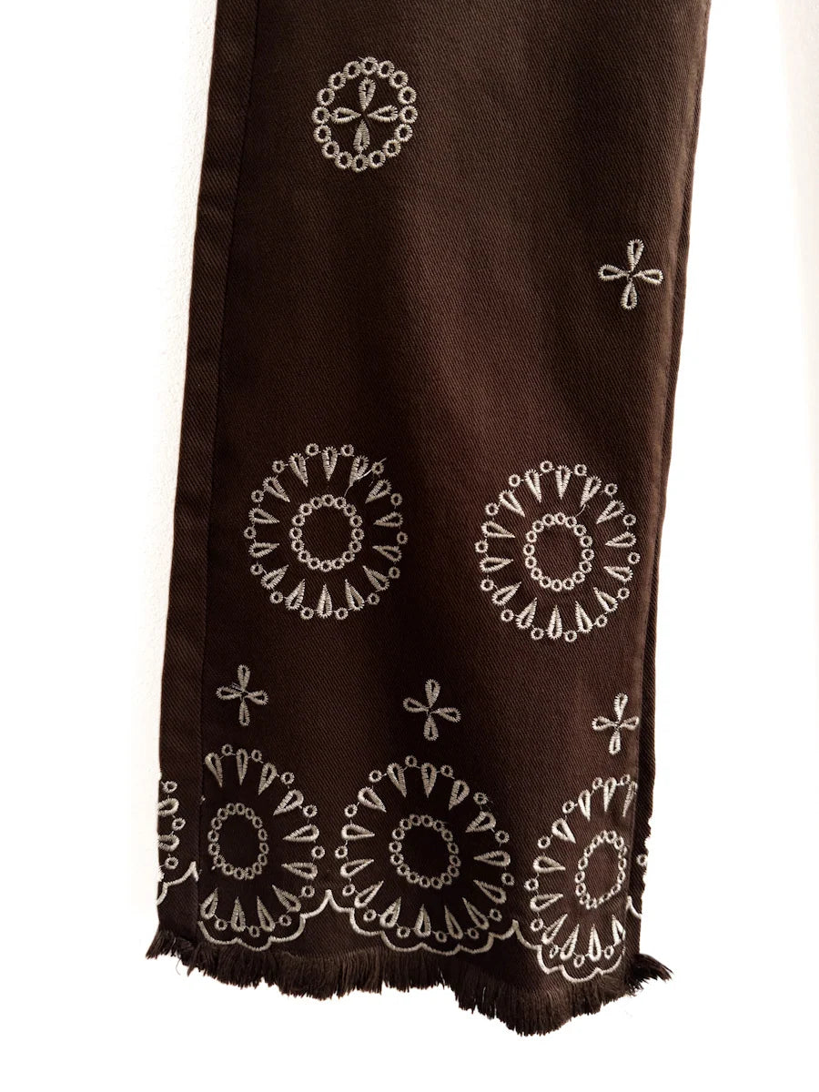 Pantalón de mezclilla de corte ancho en un color marrón oscuro, notablemente adornados con un elaborado bordado de inspiración folclórica o floral en color blanco. El bordado cubre la parte delantera de las piernas con pequeños motivos circulares y en forma de cruz, y se concentra de manera más densa y grande alrededor de los tobillos. El diseño cerca del dobladillo presenta un patrón de margarita o sol con un acabado de flecos o deshilachado que añade un toque bohemio y texturizado.