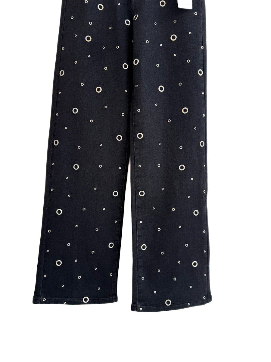 Estos jeans de tiro alto y corte recto están confeccionados en denim oscuro de excelente calidad, ofreciendo una estructura cómoda y favorecedora. Su diseño destaca por los aros metálicos distribuidos a lo largo de la prenda, un detalle moderno que aporta personalidad y un toque urbano.