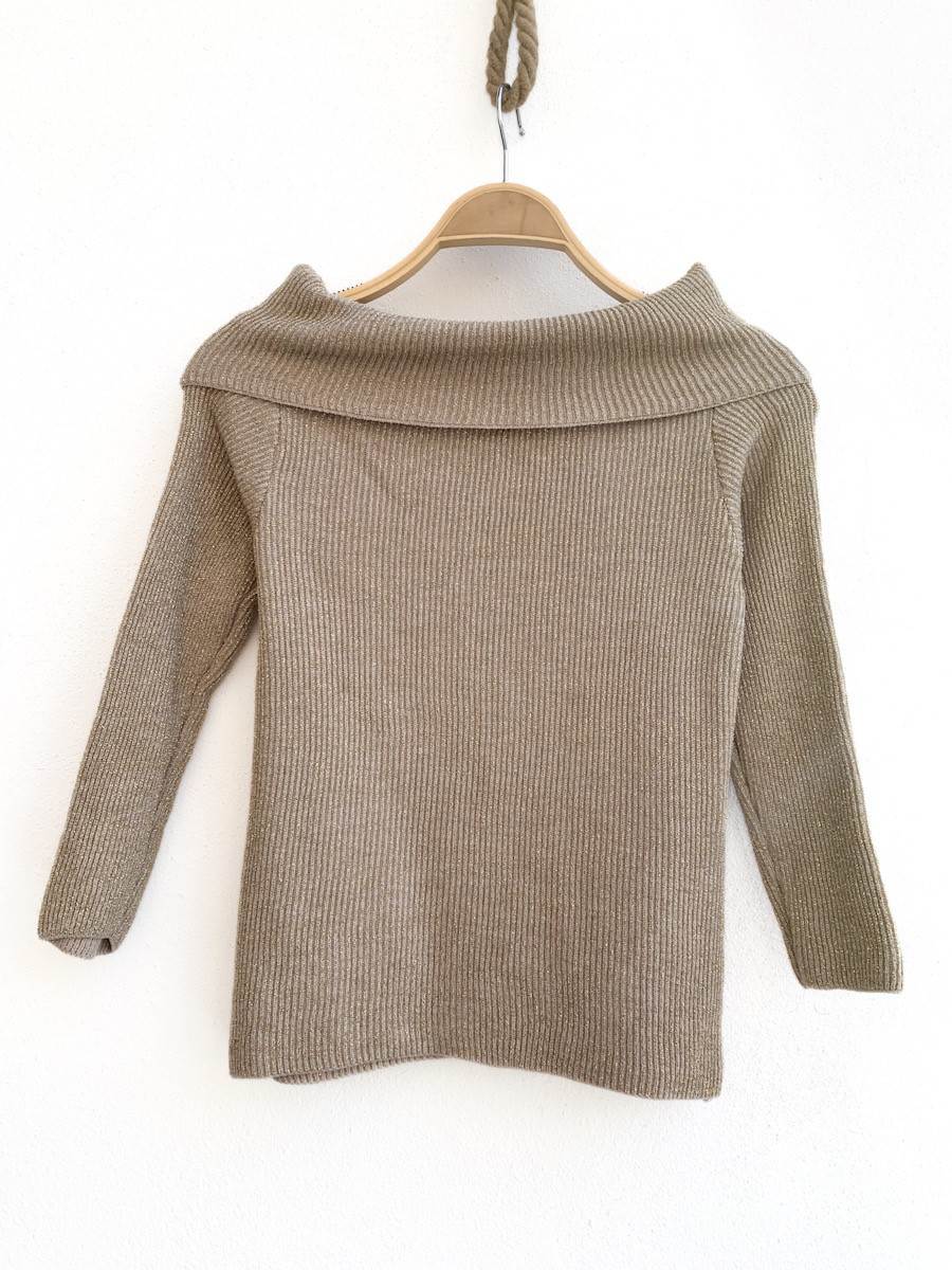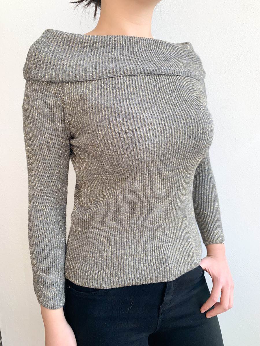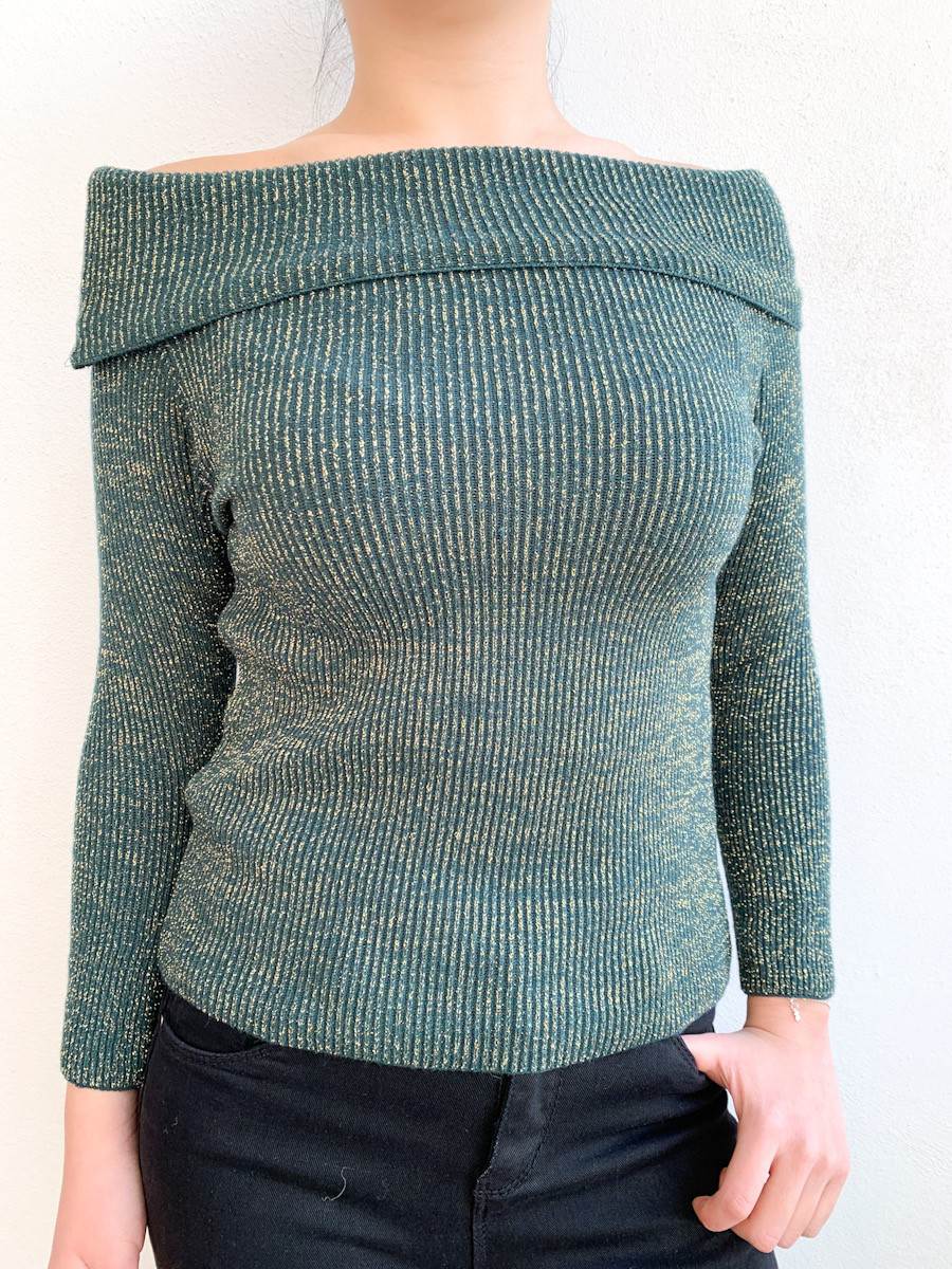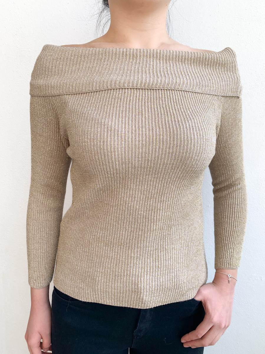 Jersey en punto con hilo dorado mezclade viscosa y poliester con hombros al descubierto. Modelo entallado con borde superior plegado y mangas largas, talla única (S, M, L)