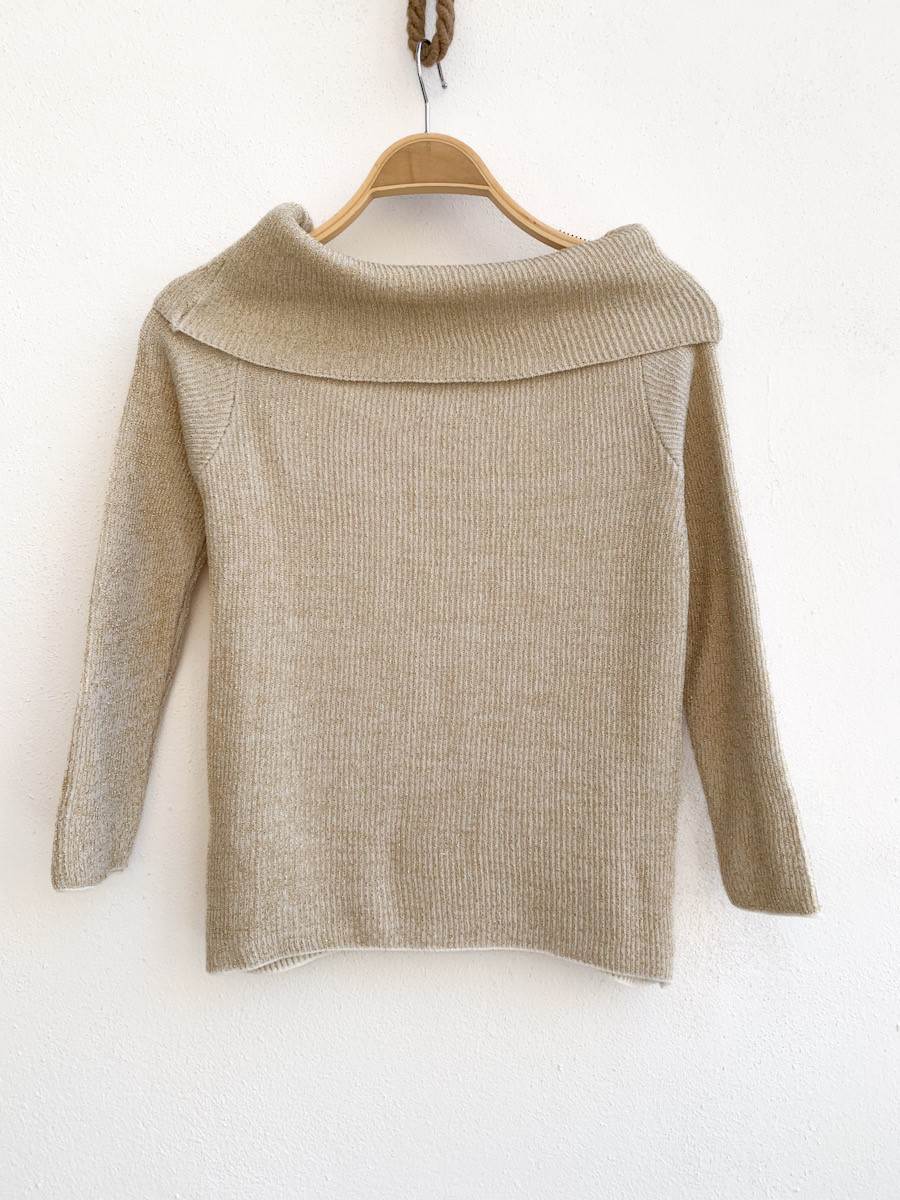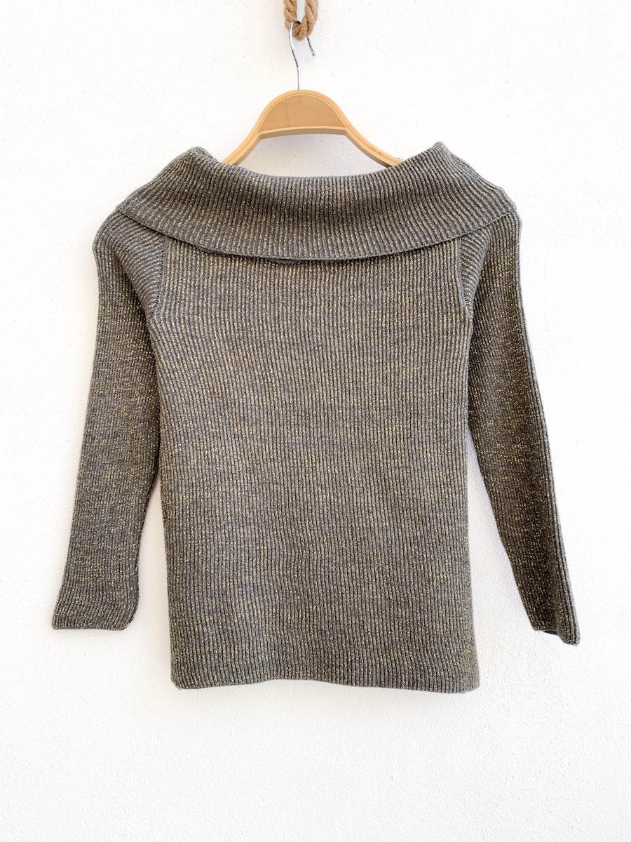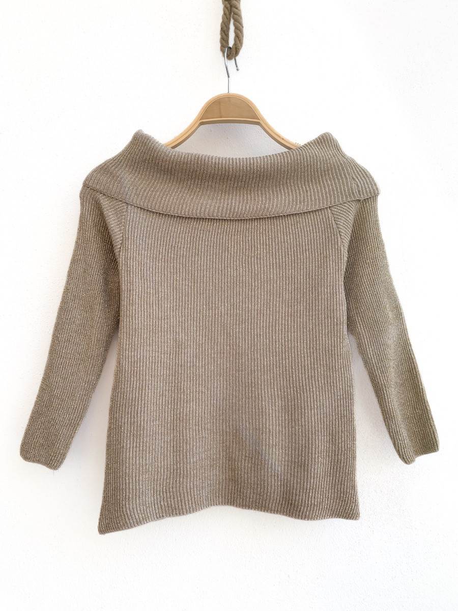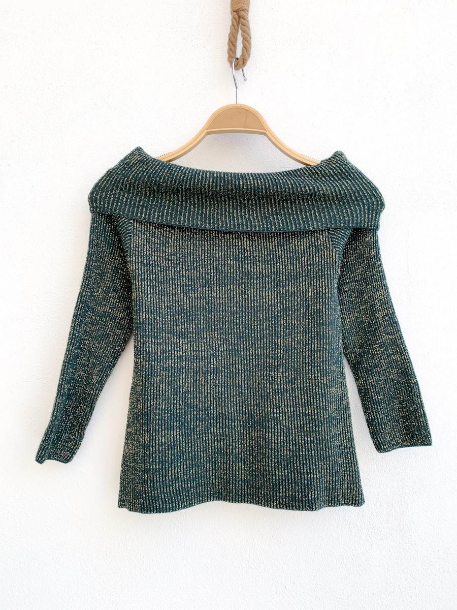 Jersey en punto con hilo dorado mezclade viscosa y poliester con hombros al descubierto. Modelo entallado con borde superior plegado y mangas largas, talla única (S, M, L)