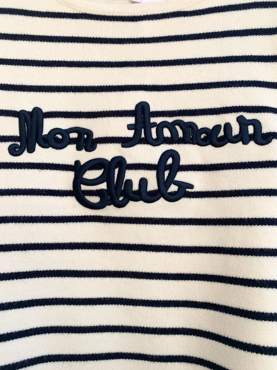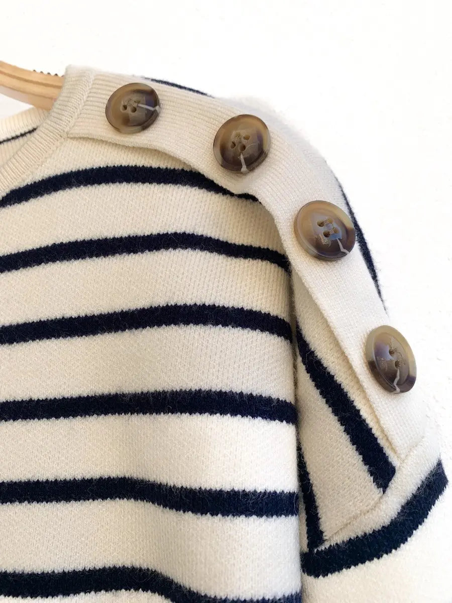 Jersey de punto fino con rayas azul marino, muy suave, hombro caido con detalle de botónes, talla única (recomienda para S, M, L), manga larga.