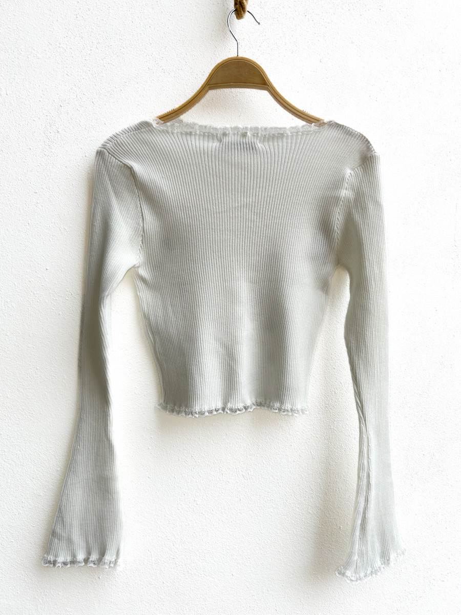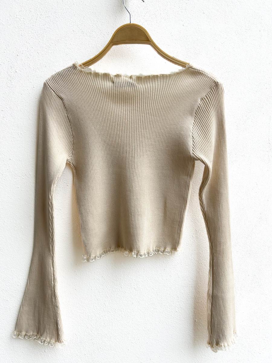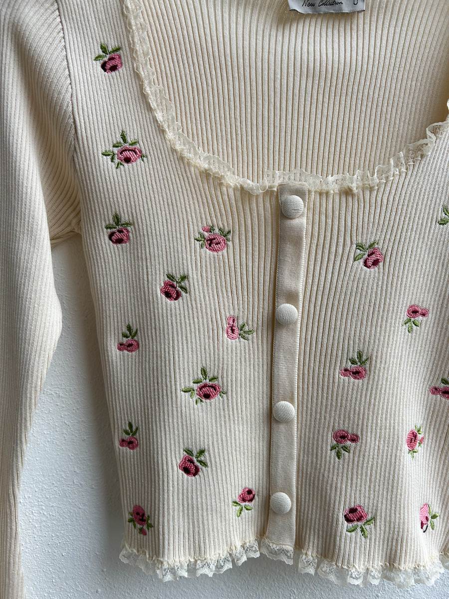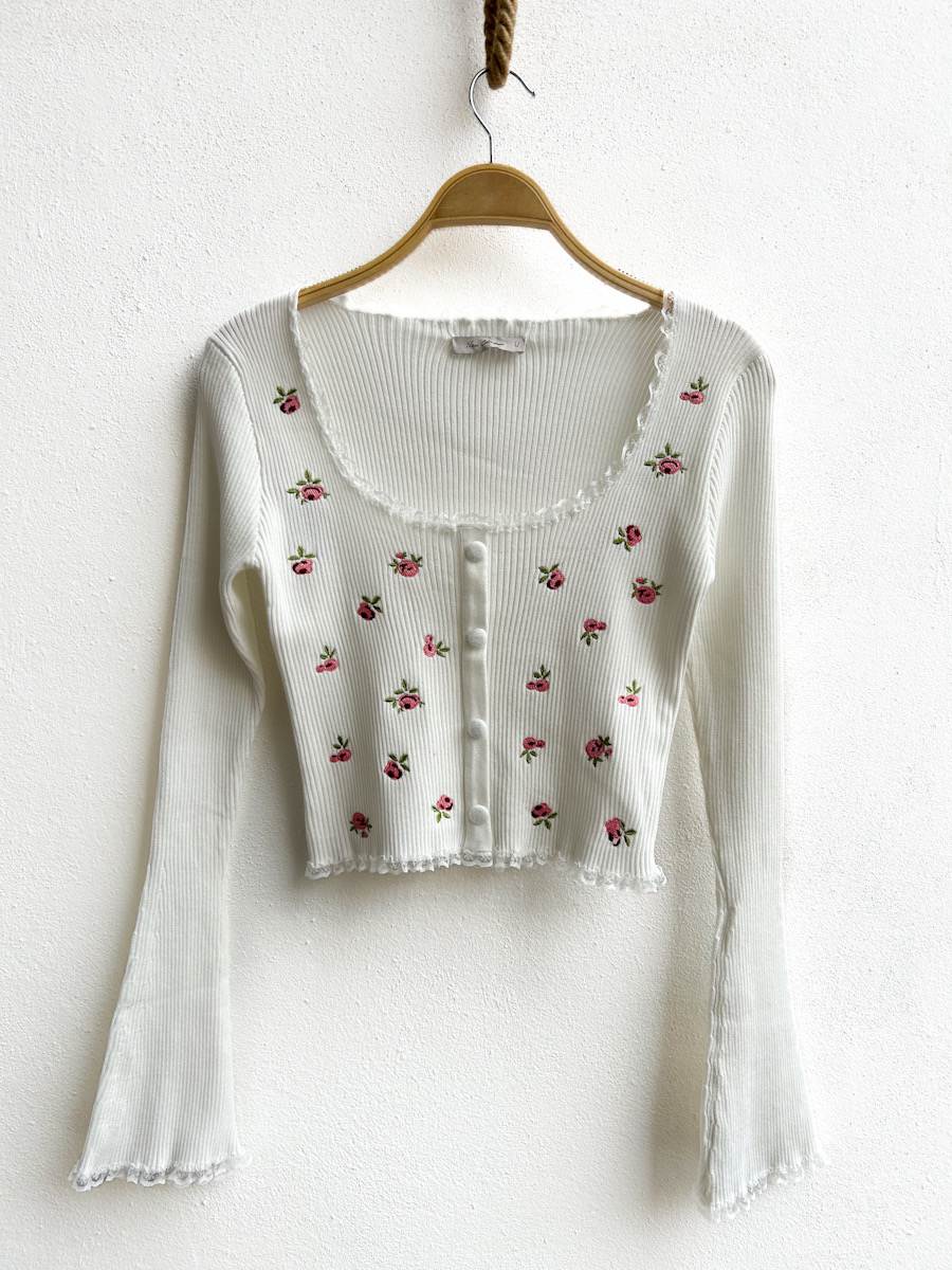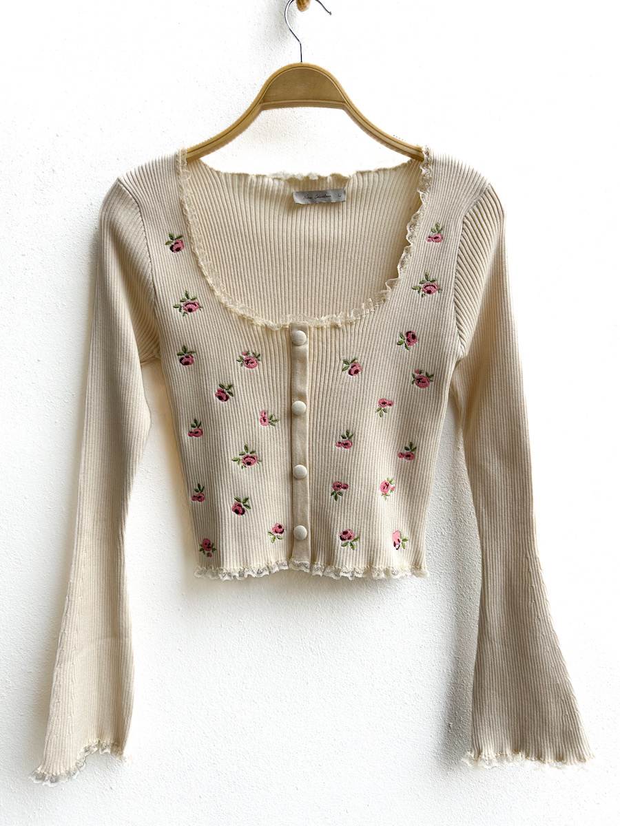 Punto fino en color beige y blanco, decorado con pequeños bordados de flores rosas y verdes. Tiene adorno botones frontales, un escote redondeado con un borde festoneado, y mangas largas con un diseño ligeramente acampanado y ribete desgastado. Este estilo de prenda es ideal para un look casual o romántico. Ref: 8514901