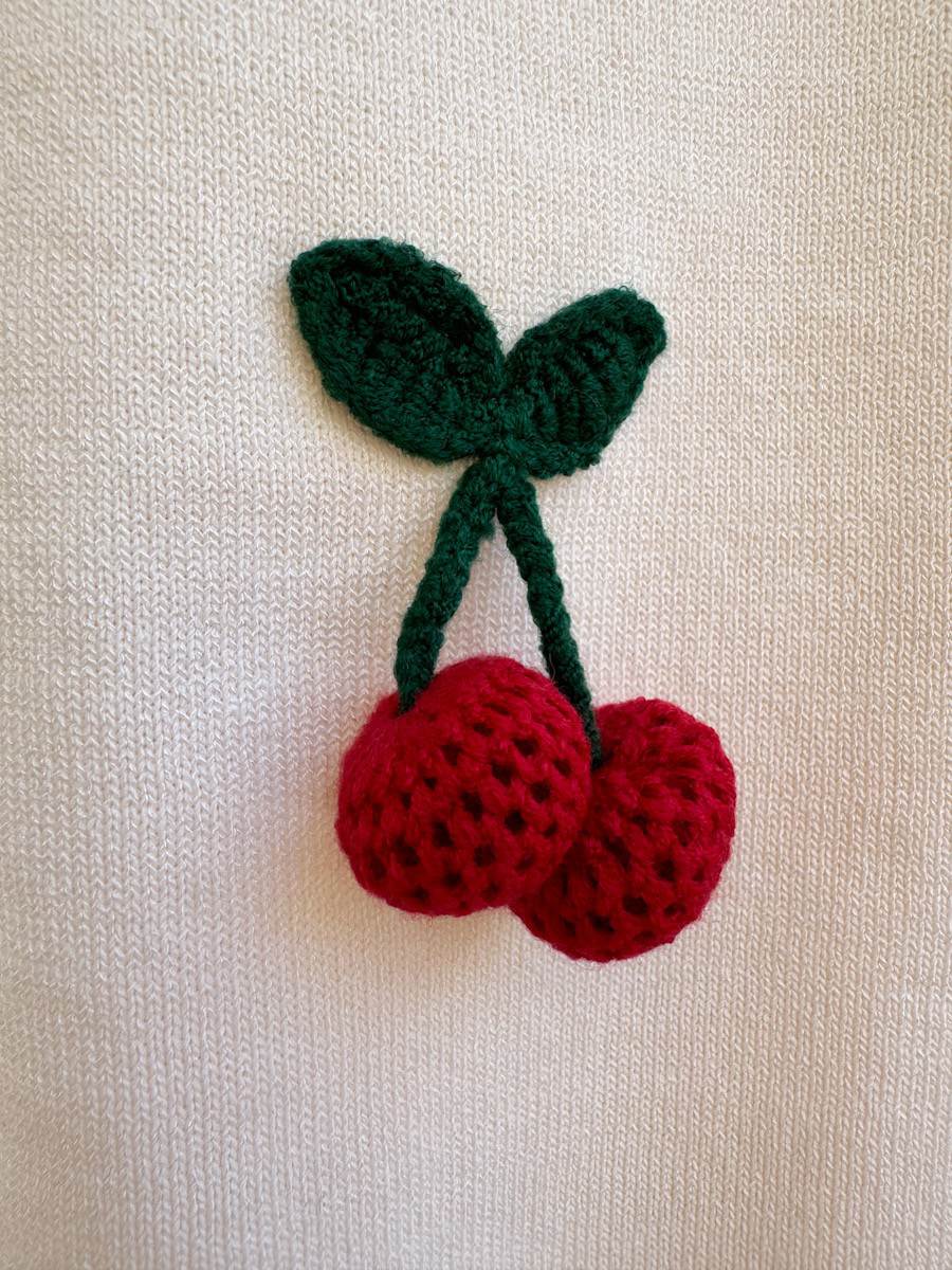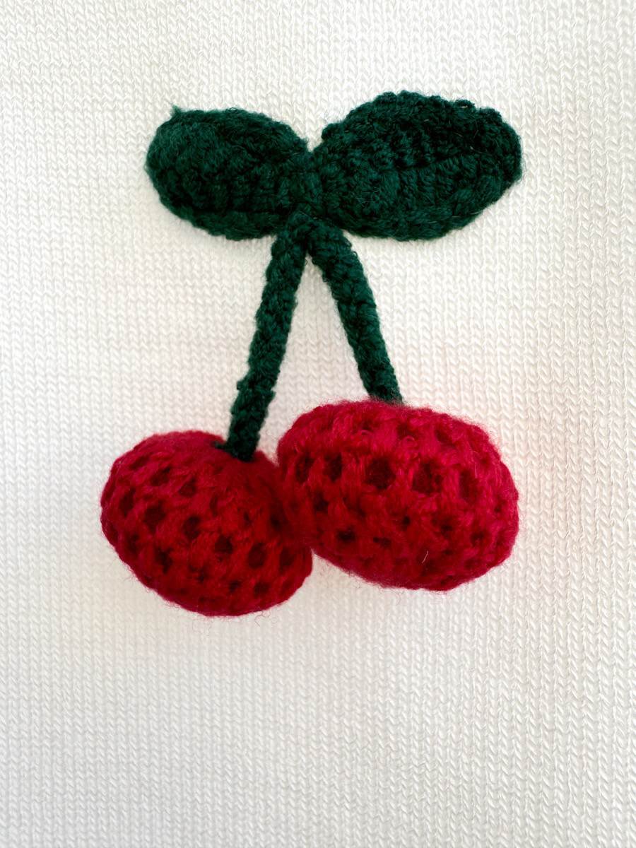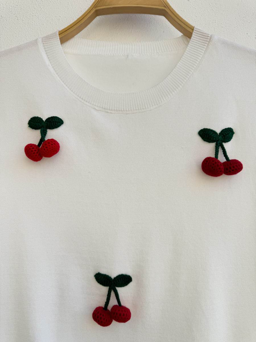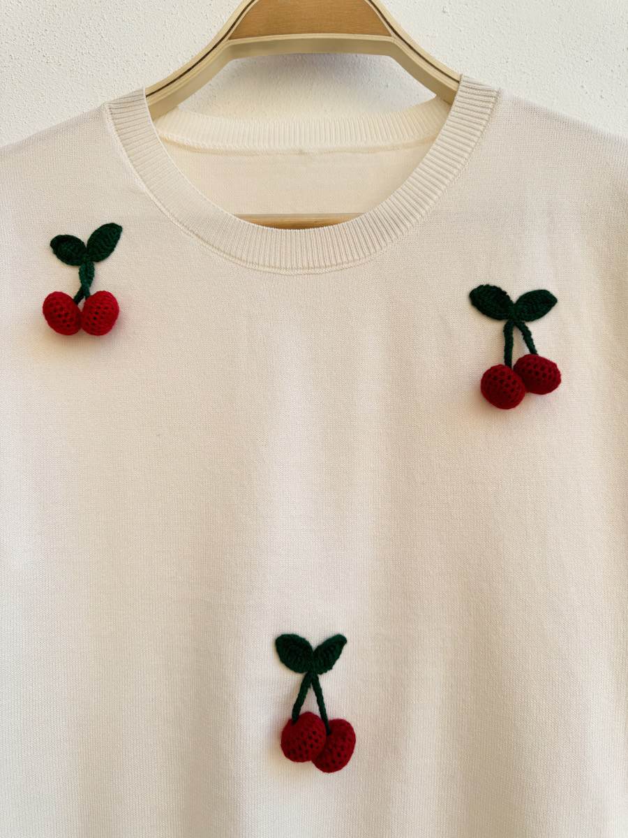 Suéter de manga corta en color crema, con un diseño minimalista y detalles bordados de cerezas rojas con hojas verdes repartidos en la parte frontal. El tejido parece suave y ligero, ideal para un look casual y fresco. La prenda tiene cuello redondo y terminaciones acanaladas en las mangas y el dobladillo, lo que le da un acabado limpio y elegante.