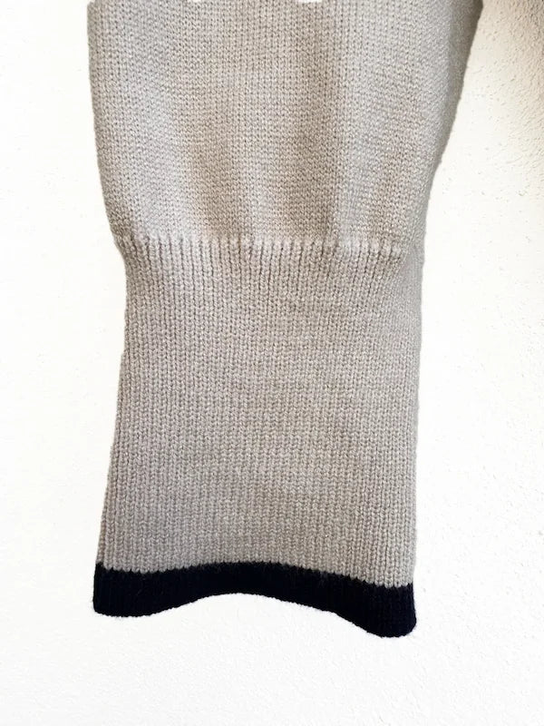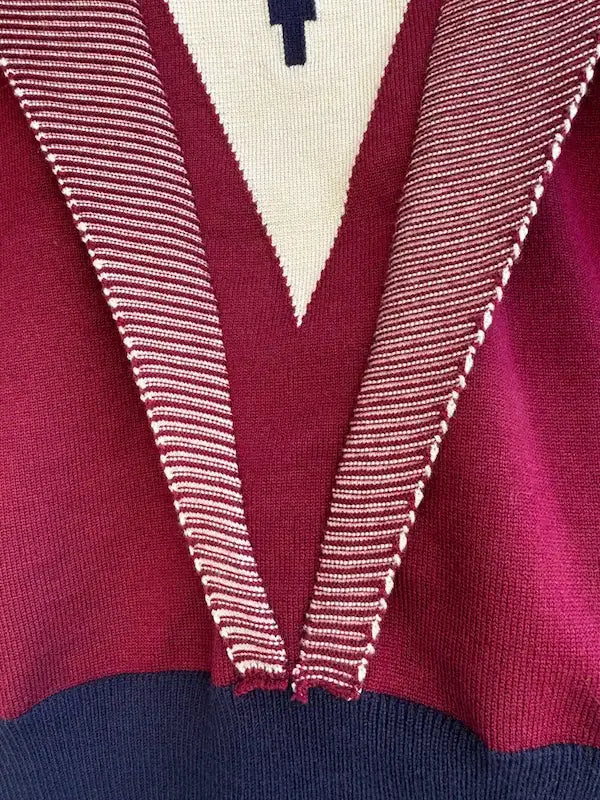 Suéter de tejido fino multicolor con diseño moderno y sofisticado. Presenta un estampado geométrico en forma de “V” en el frontal, que estiliza la silueta y aporta un toque distintivo. Combina tonos borgoña, azul marino, beige y blanco, logrando un equilibrio elegante y actual.