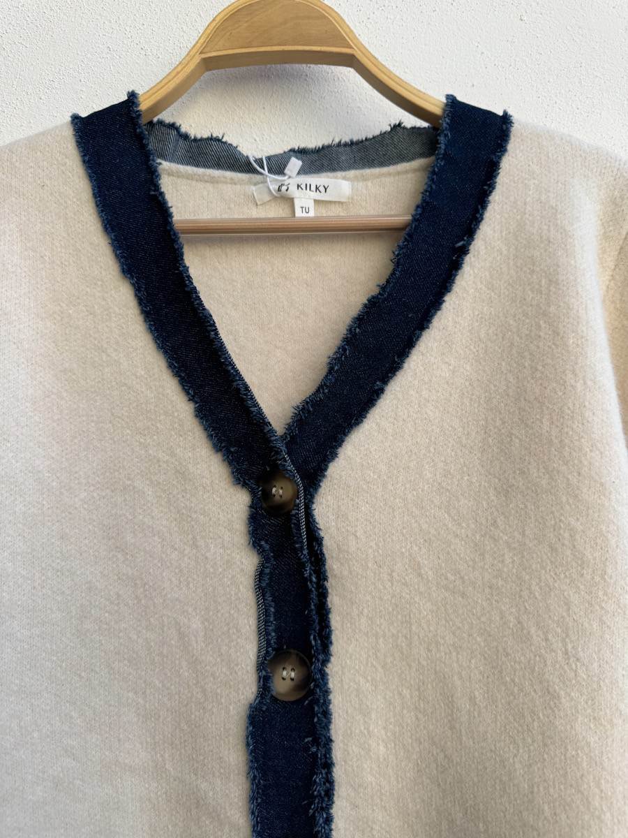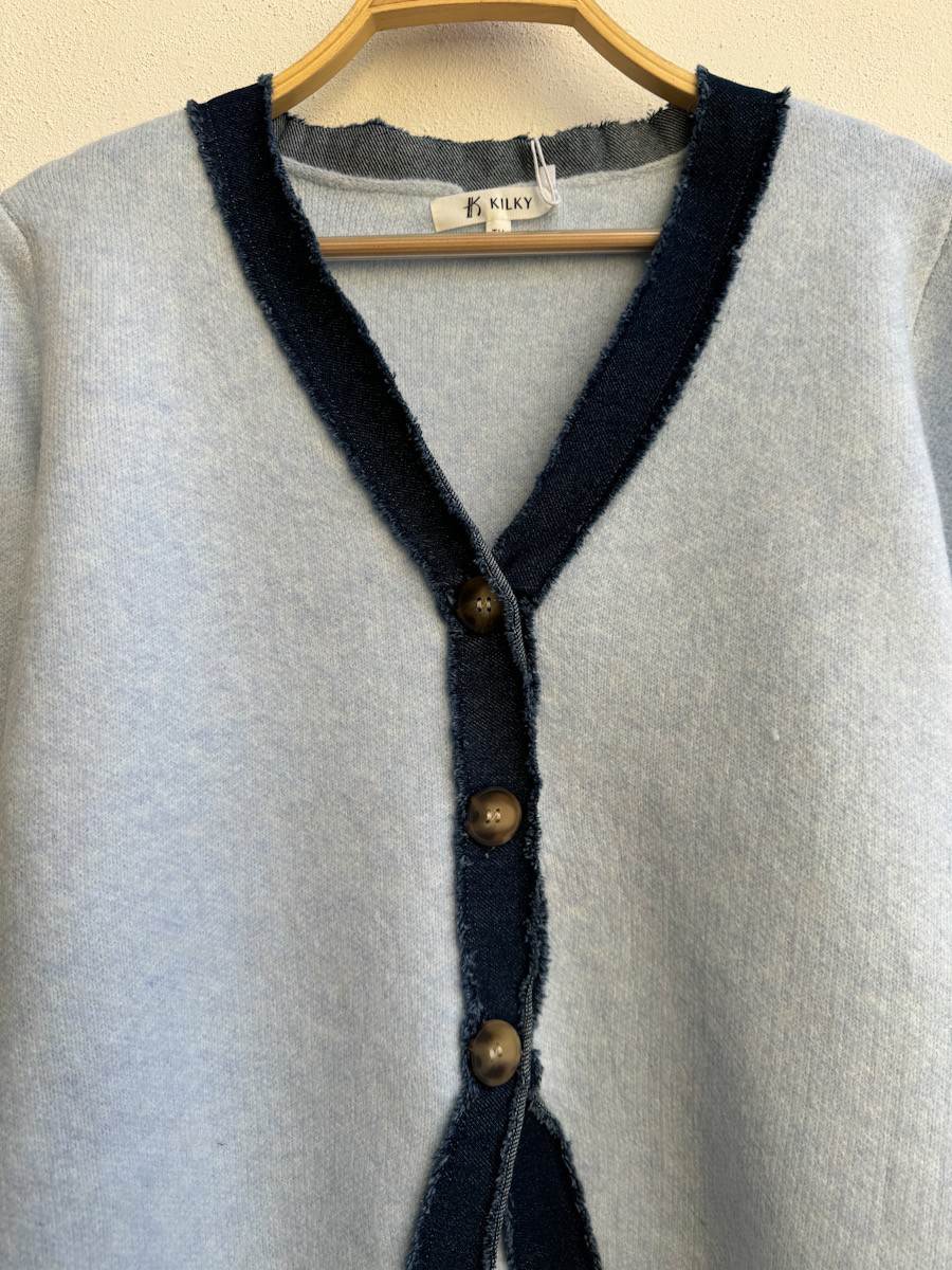 Cárdigan de manga larga con un diseño sencillo y elegante. Está confeccionado en un tejido suave de color azul claro y beige, con ribetes en contraste de color azul vaquero en el cuello en "V", la abertura frontal y los puños. El cárdigan se abrocha con tres botones al frente y tiene un corte recto y ligeramente corto.