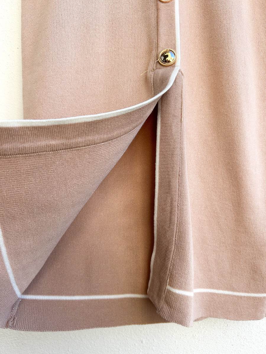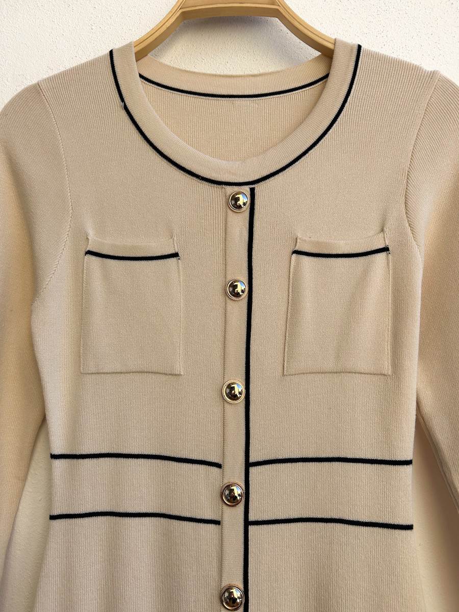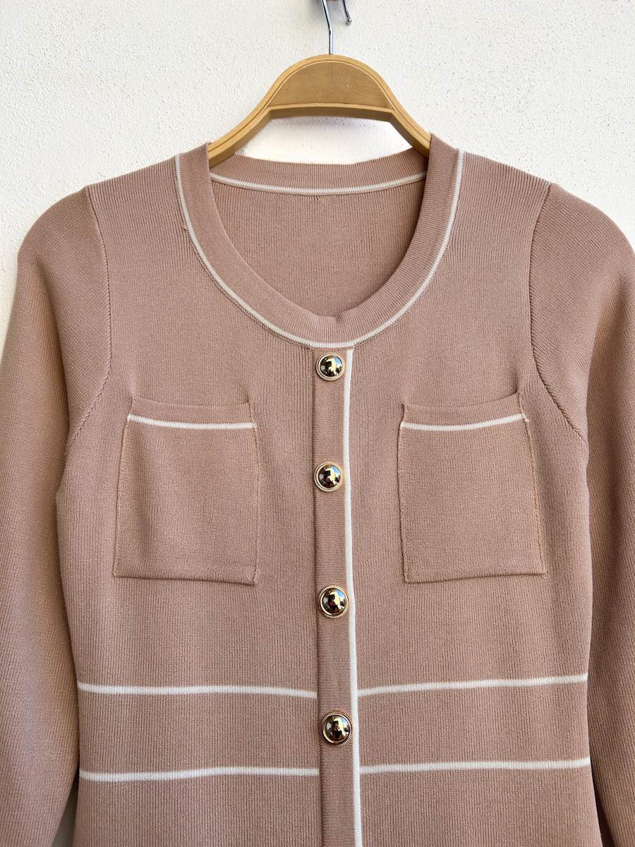 Vestido tipo cárdigan de manga larga en color beige, apricot y negro, Tiene botones que recorren la parte frontal de adorno y dos pares de bolsillos: uno en la zona del pecho y otro cerca de la cintura. Rfe.93670