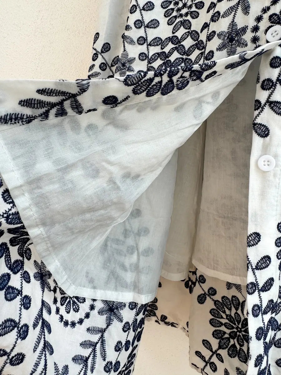 Vestido largo bordado con flor azul, sin manga, cuello camisa, forro interior.