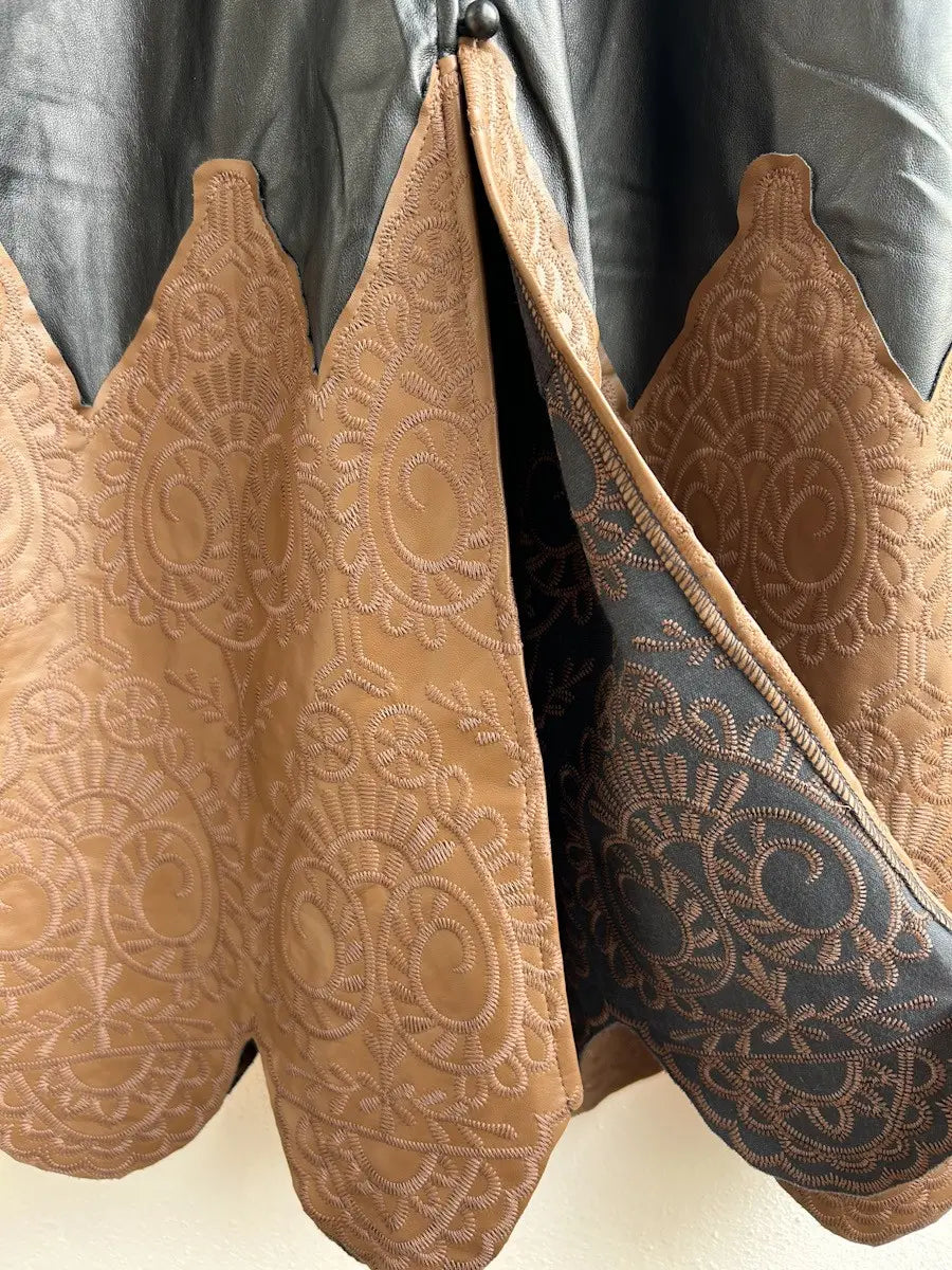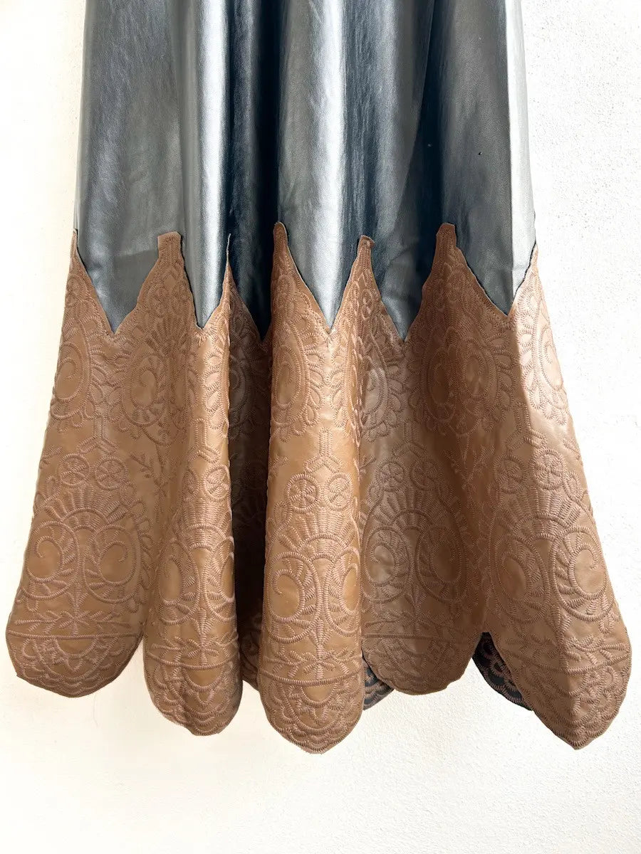 El vestido largo tiene mangas largas y está hecho de dos materiales diferentes. La parte de arriba es de un material que parece cuero negro, con botones en el centro y mangas un poco abullonadas. La parte de abajo es marrón con bordados y tiene un borde ondulado.