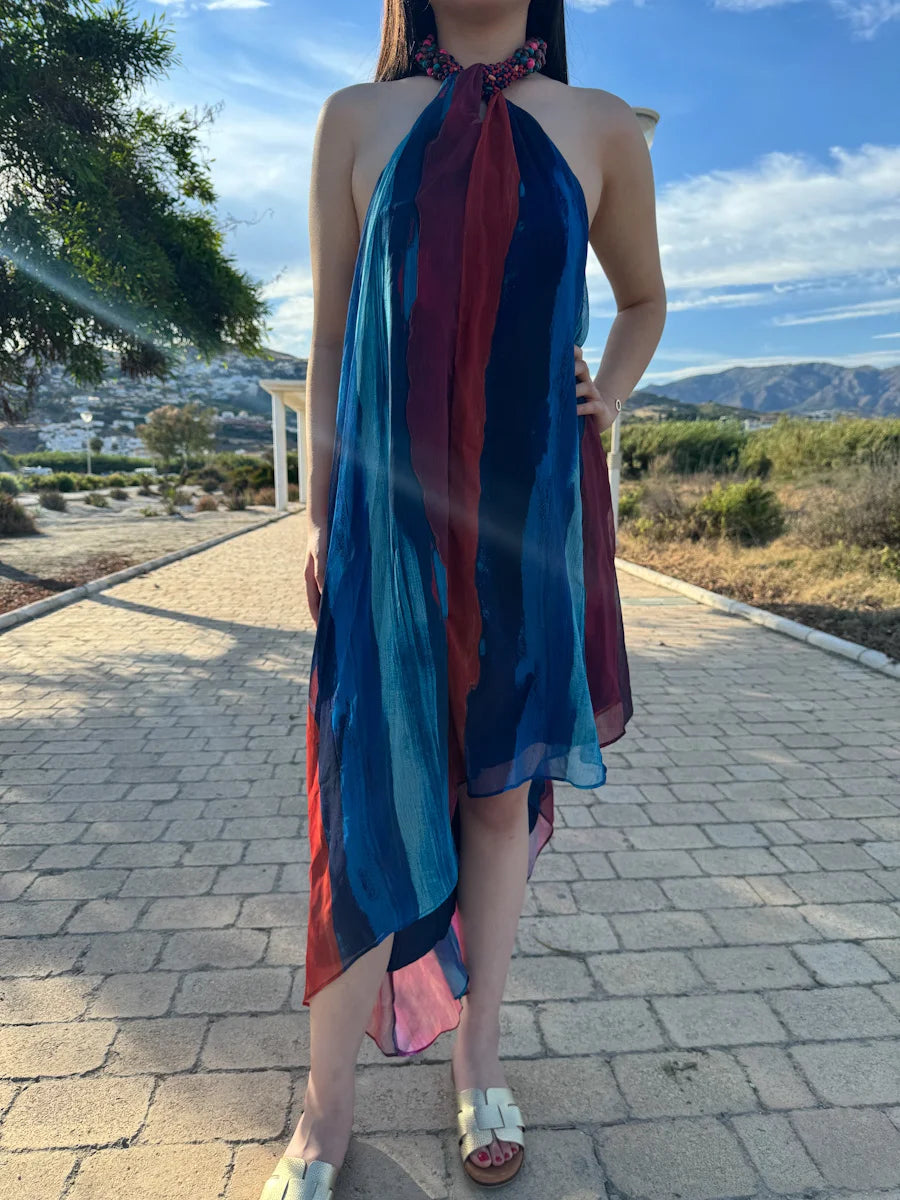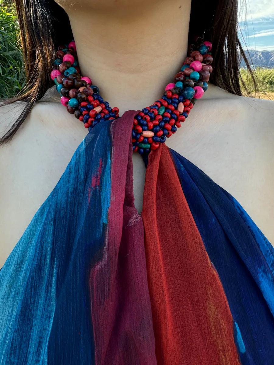 Vestido asimétrico, vaporoso, abalorios en madera de colores en cuello halter lazada, forro interior.