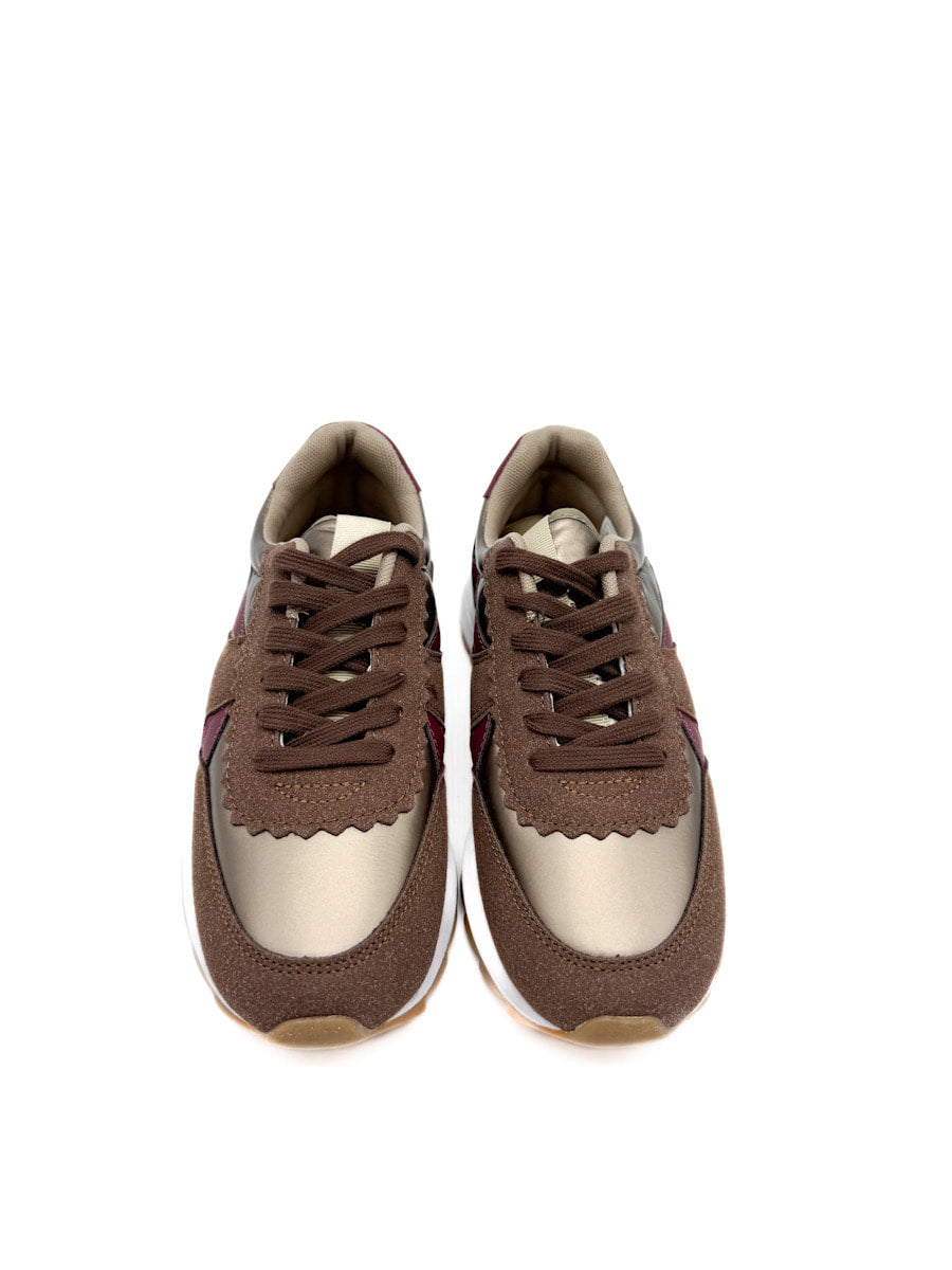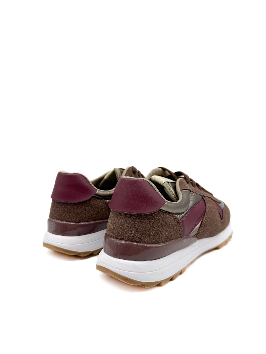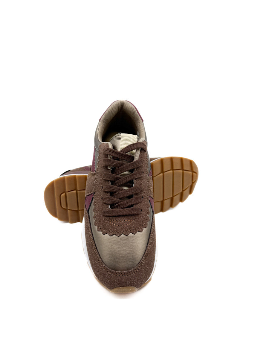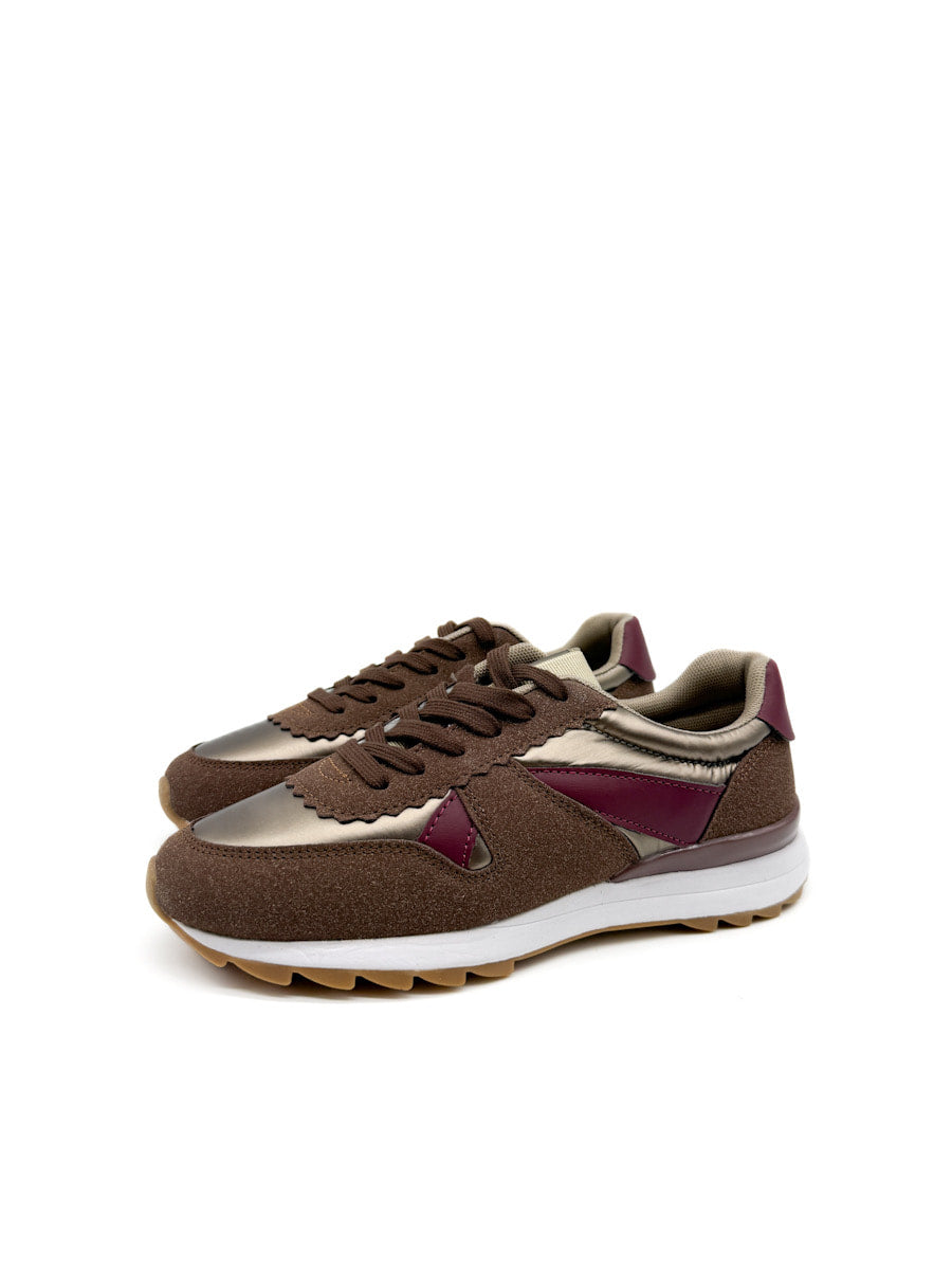 Zapatillas deportivas de estilo casual, que combinan una estética retro de running con toques modernos. El primer modelo destaca por una rica paleta de colores otoñales que incluye marrón chocolate, borgoña en los apliques laterales y el talón, y un material con acabado metálico o brillante de tono bronce. Estas zapatillas tienen una suela de doble capa: una entre suela blanca que ofrece contraste y una suela exterior de goma color caramelo con buen agarre. El segundo modelo, mezcla de texturas más variada y colores azul marino, un tono beige, rosa palo, y acentos en borgoña, con cordones estampados.
