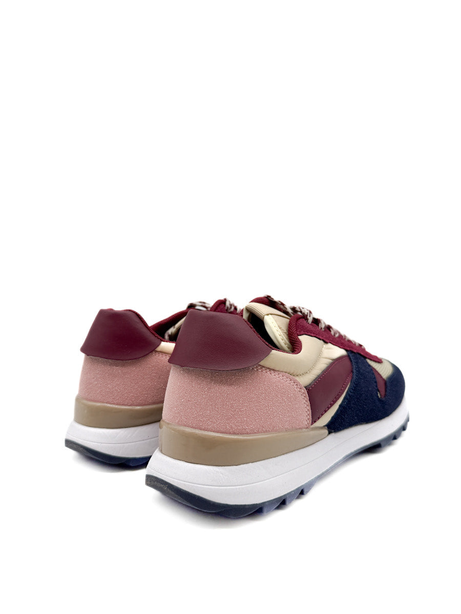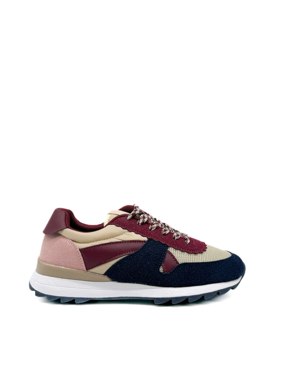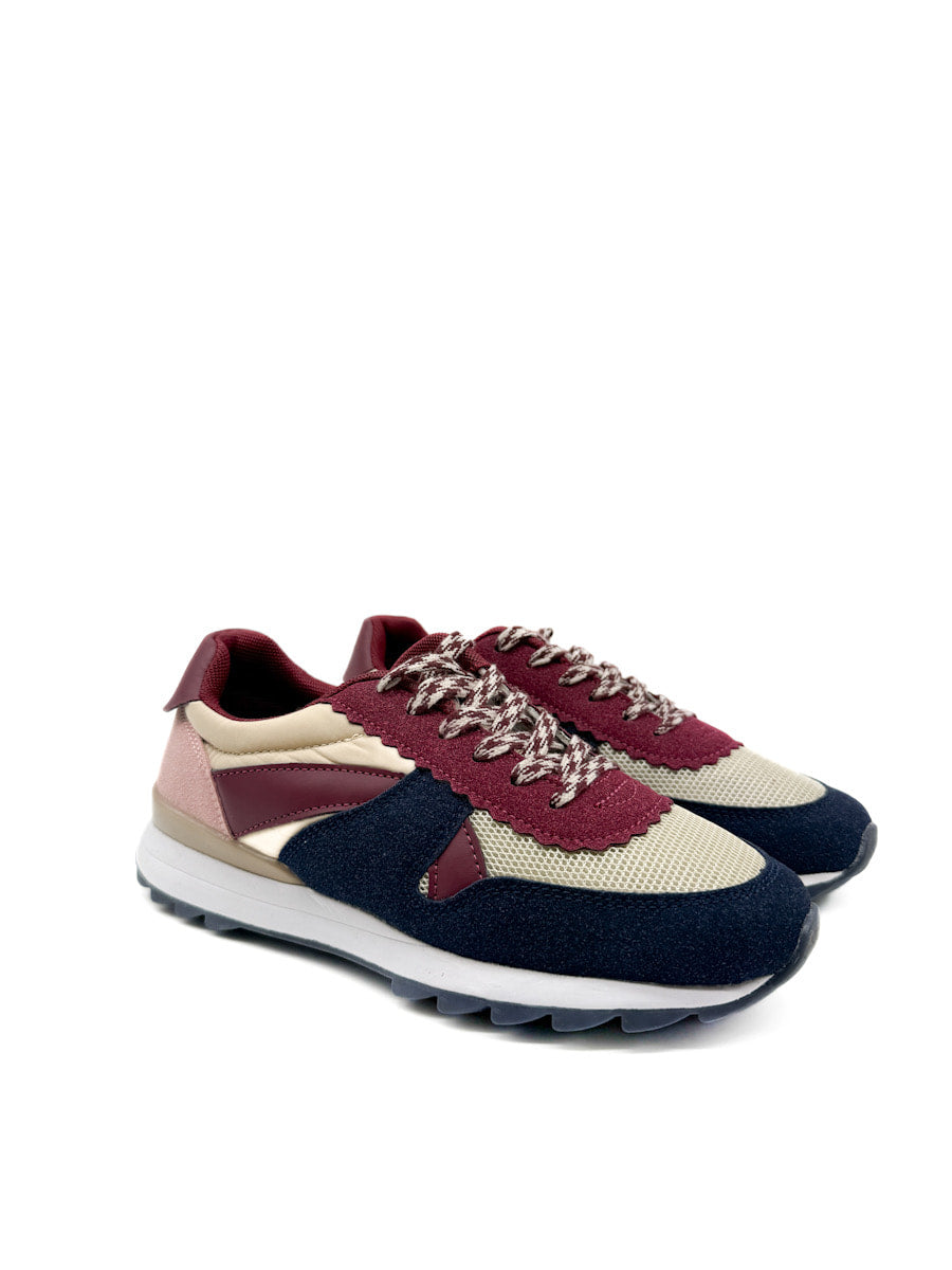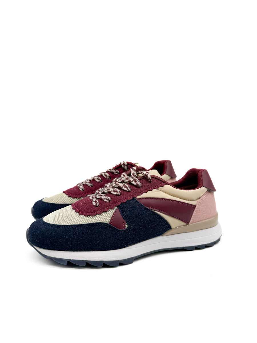 Zapatillas deportivas de estilo casual, que combinan una estética retro de running con toques modernos. El primer modelo destaca por una rica paleta de colores otoñales que incluye marrón chocolate, borgoña en los apliques laterales y el talón, y un material con acabado metálico o brillante de tono bronce. Estas zapatillas tienen una suela de doble capa: una entre suela blanca que ofrece contraste y una suela exterior de goma color caramelo con buen agarre. El segundo modelo, mezcla de texturas más variada y colores azul marino, un tono beige, rosa palo, y acentos en borgoña, con cordones estampados.
