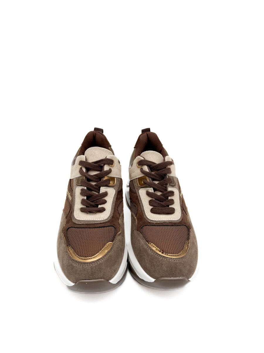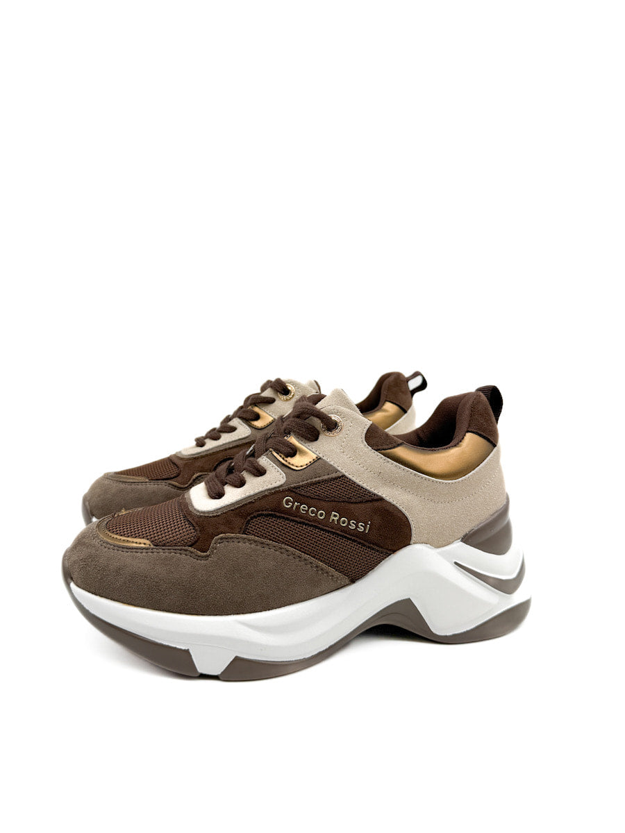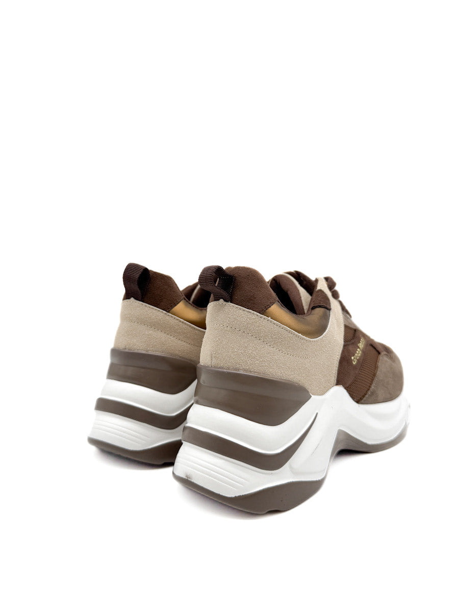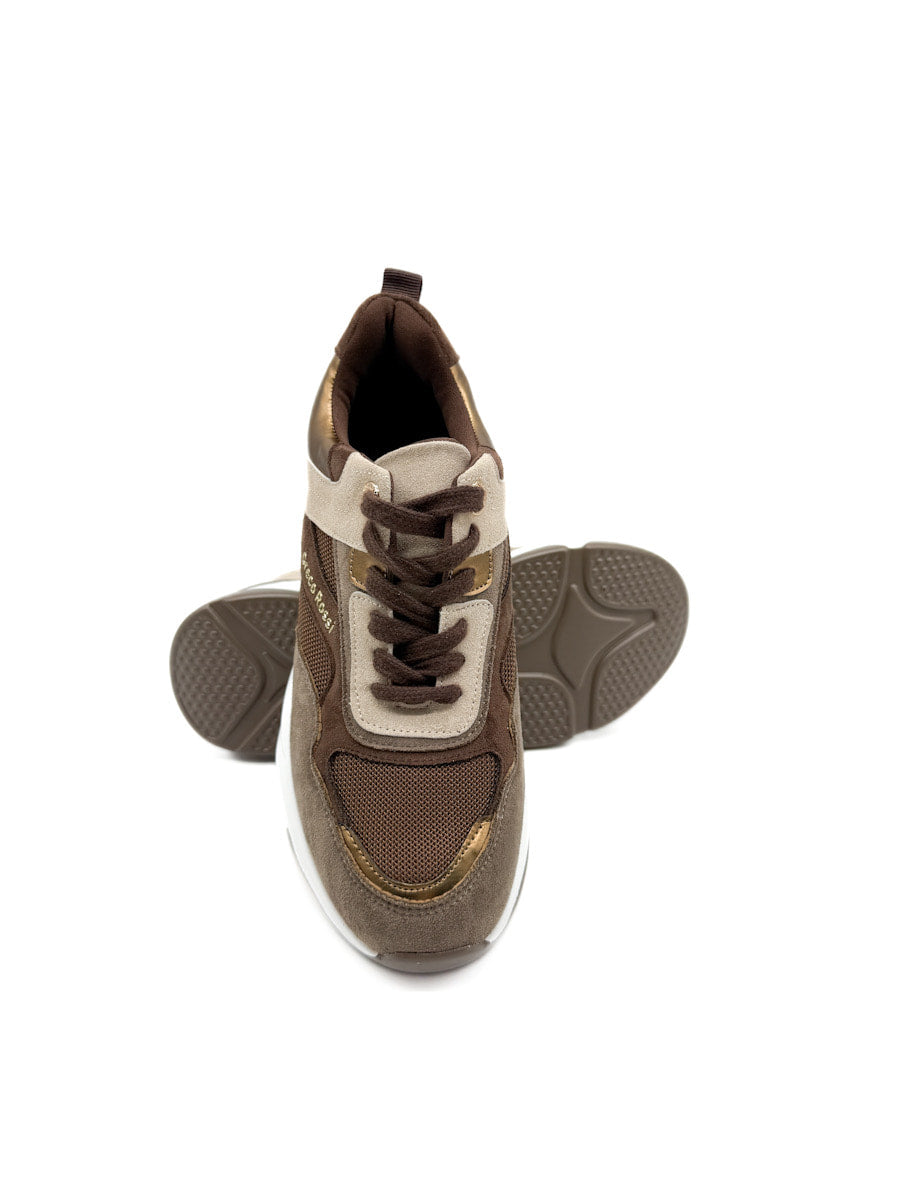 Zapatilla diseño moderno y voluminoso, característico de la tendencia ,combinando una paleta de colores en tonos marrón, café, beige y blanco. La parte superior está confeccionada con una mezcla de materiales, que incluye malla marrón y antelina en tonos café oscuro y un beige más claro, acentuada con detalles en color oro metálico en el área de los ojales y el talón, lo que les da un toque sutilmente premium. El calzado se asienta sobre una suela gruesa y esculpida en blanco y marrón, que ofrece una elevación notable y un perfil visualmente dinámico, lo que los convierte en una opción contemporánea para un look casual o de estilo urbano.