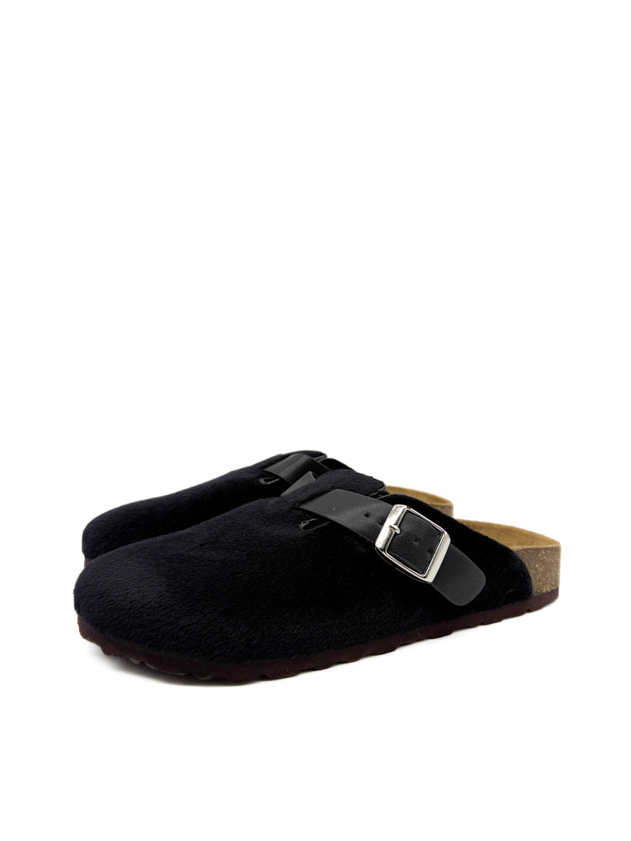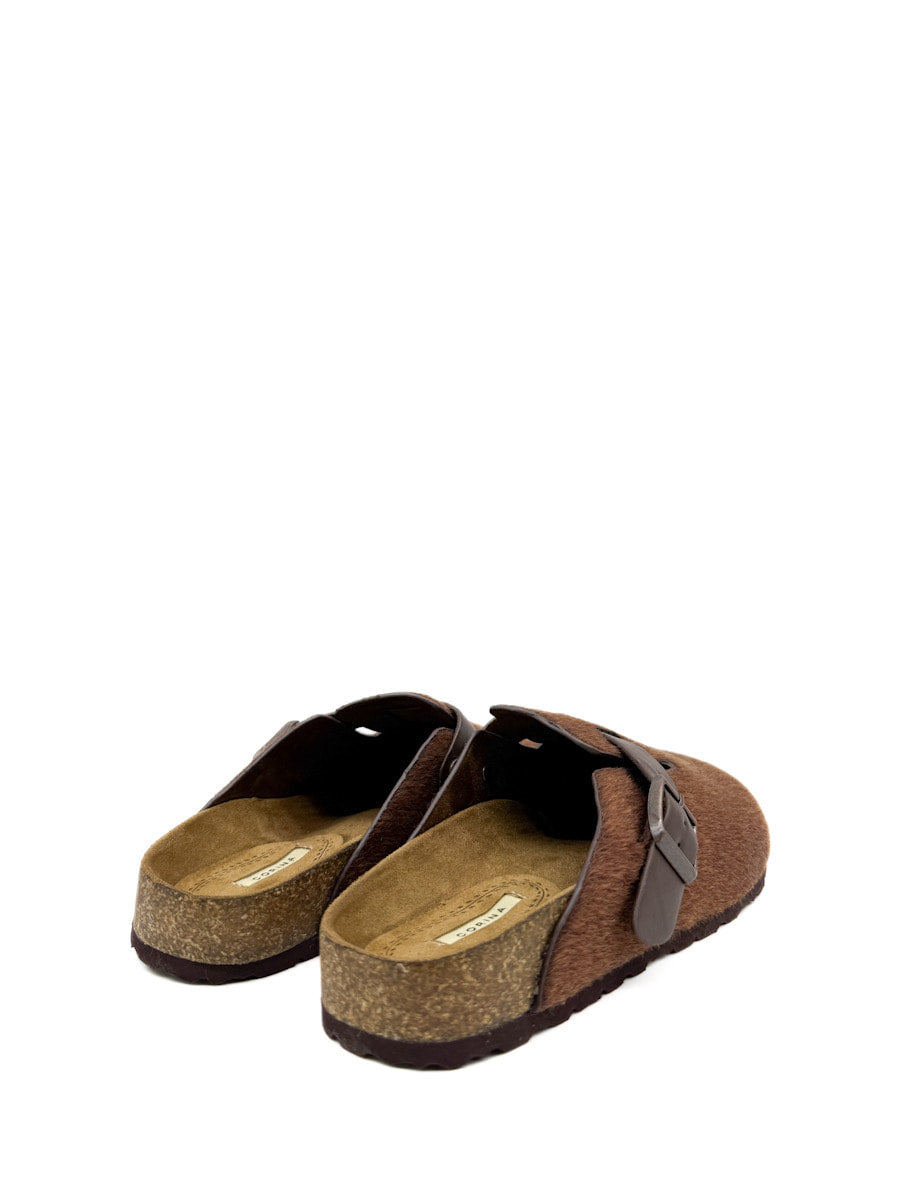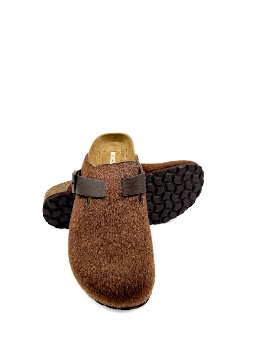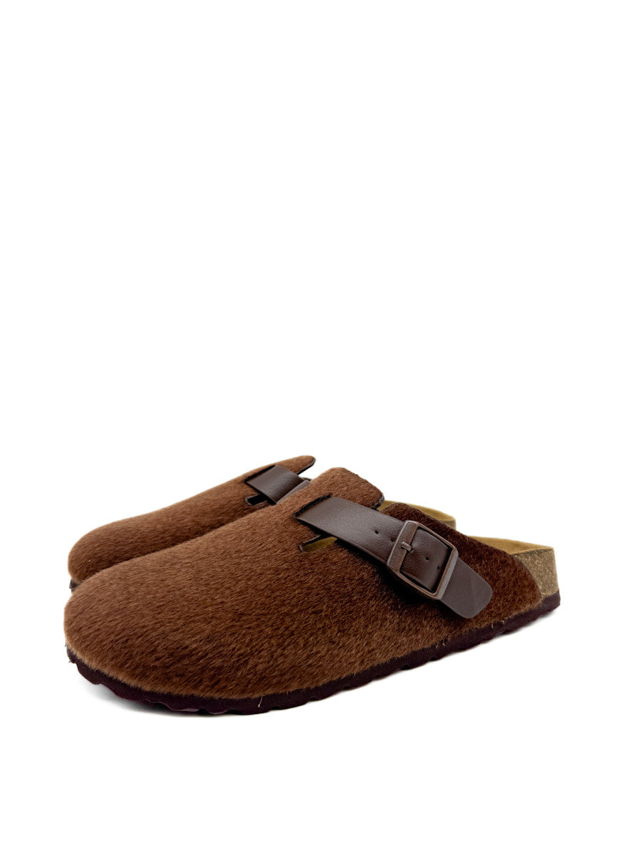 Zuecos de piel de sintética de color marrón y negro, Tienen una sola hebilla ajustable y suela de corcho y EVA, lo que sugiere un diseño cómodo y funcional. La textura peluda de la parte superior contrasta con el acabado liso de las correas de cuero sintético y el diseño robusto de la suela. La combinación de estos materiales indica que los zuecos son adecuados para el uso diario y para quienes buscan un estilo a la vez casual y elegante.