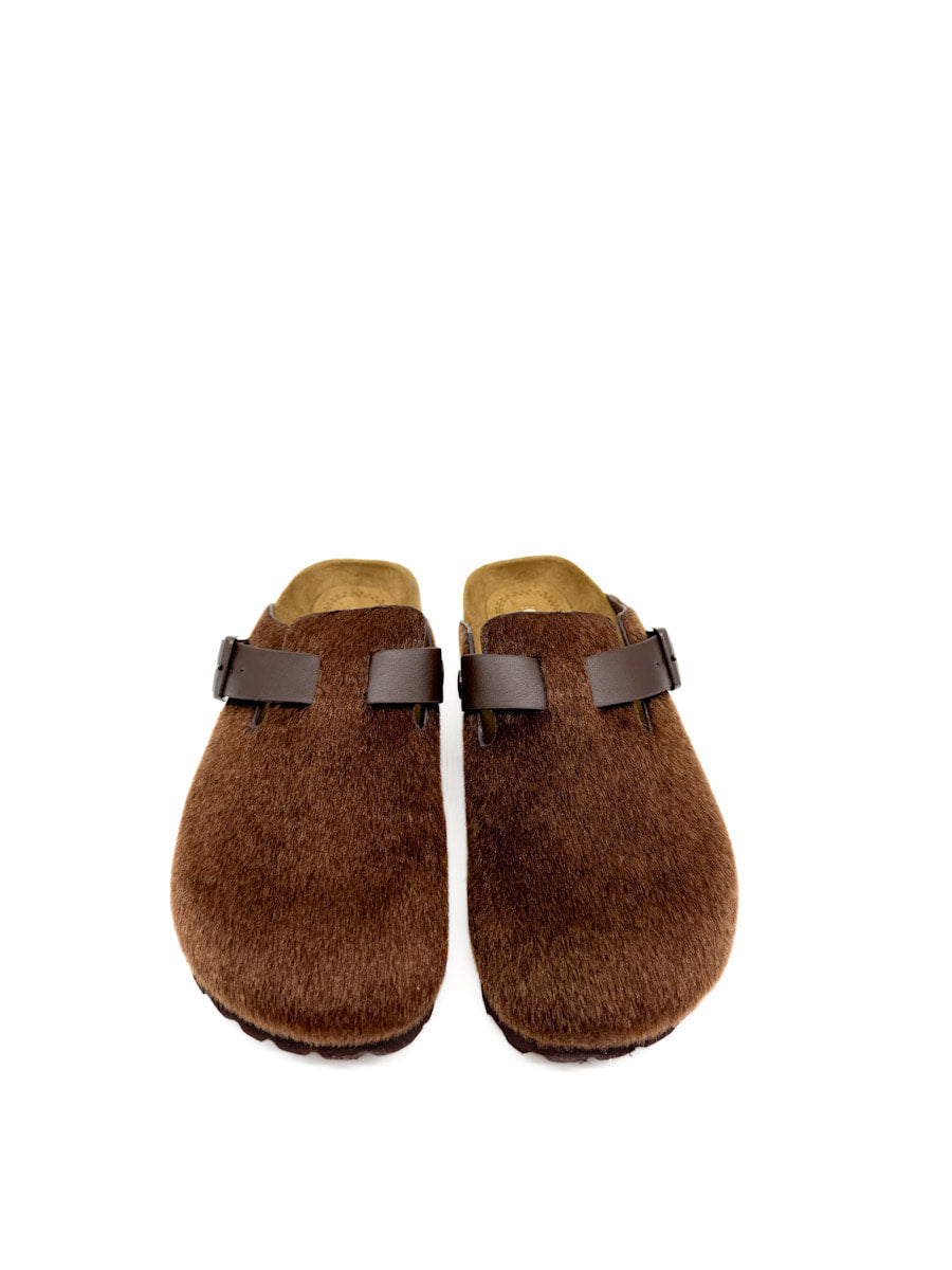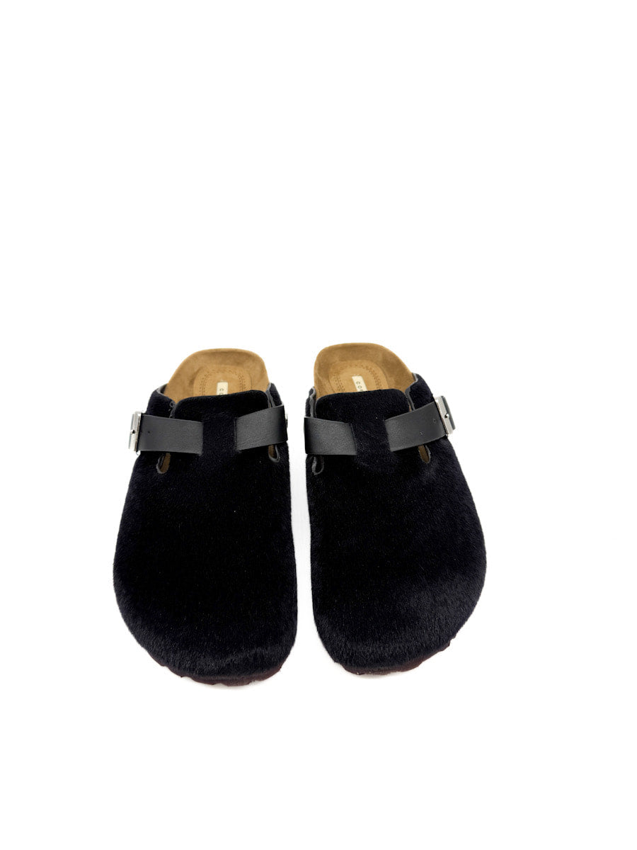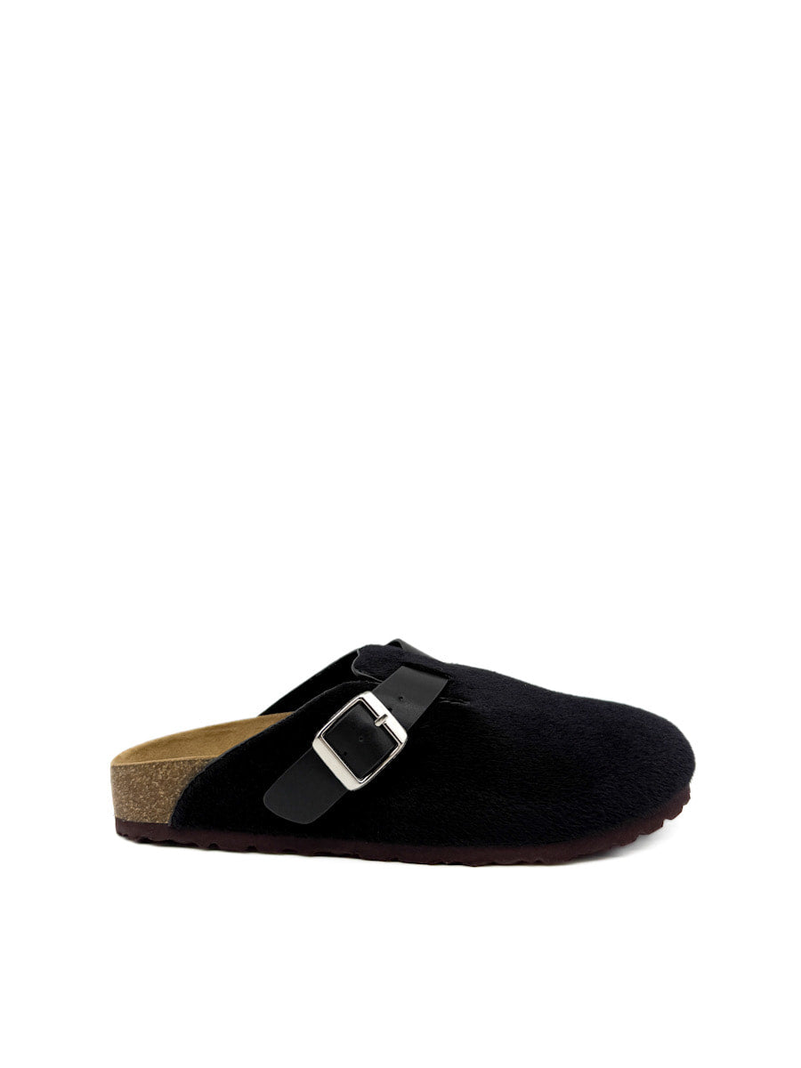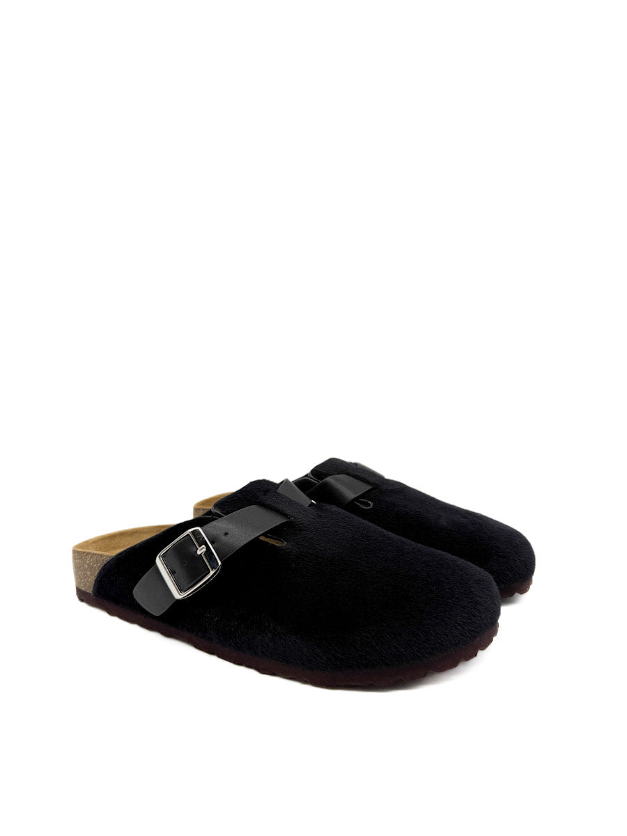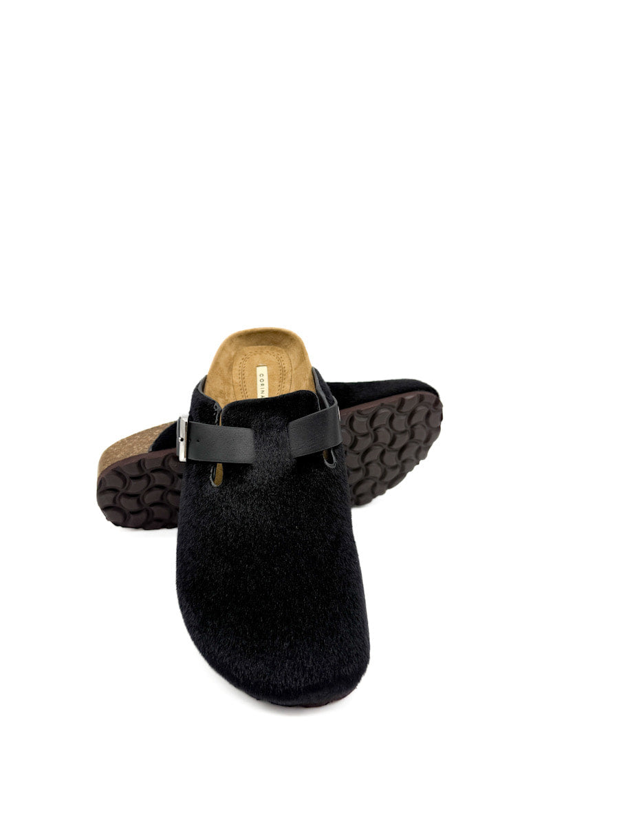 Zuecos de piel de sintética de color marrón y negro, Tienen una sola hebilla ajustable y suela de corcho y EVA, lo que sugiere un diseño cómodo y funcional. La textura peluda de la parte superior contrasta con el acabado liso de las correas de cuero sintético y el diseño robusto de la suela. La combinación de estos materiales indica que los zuecos son adecuados para el uso diario y para quienes buscan un estilo a la vez casual y elegante.