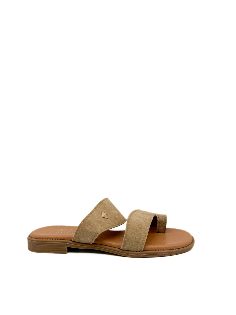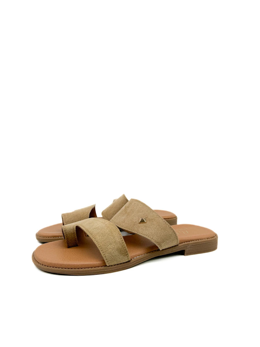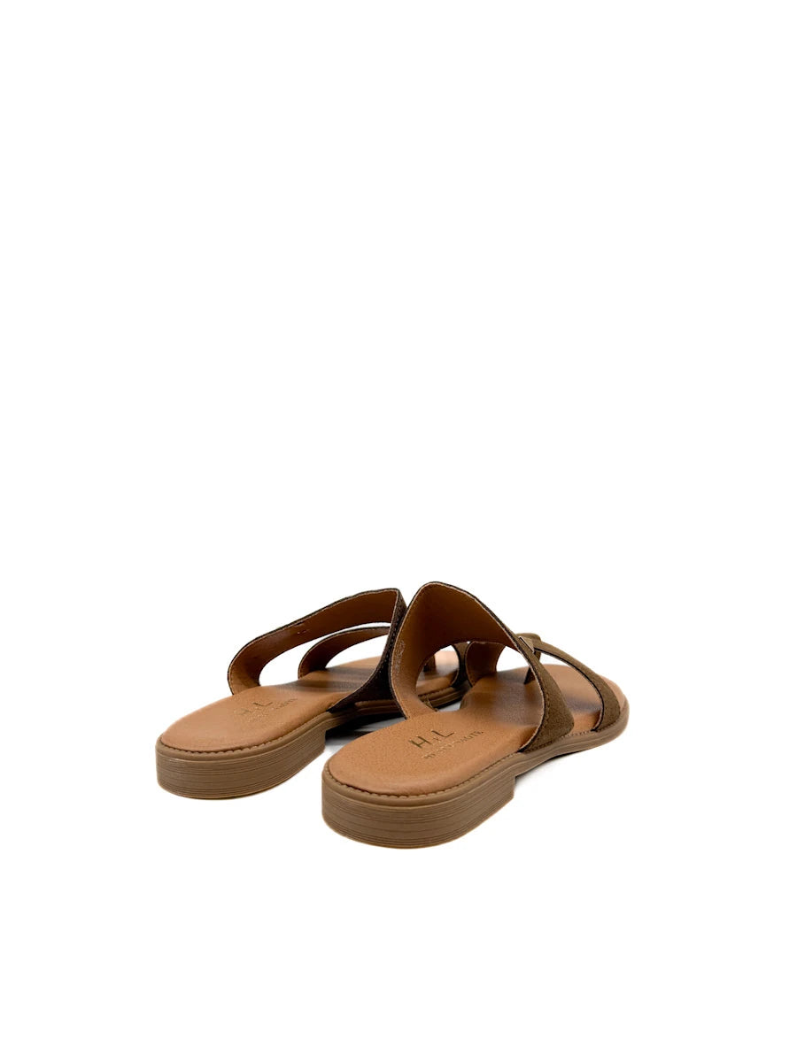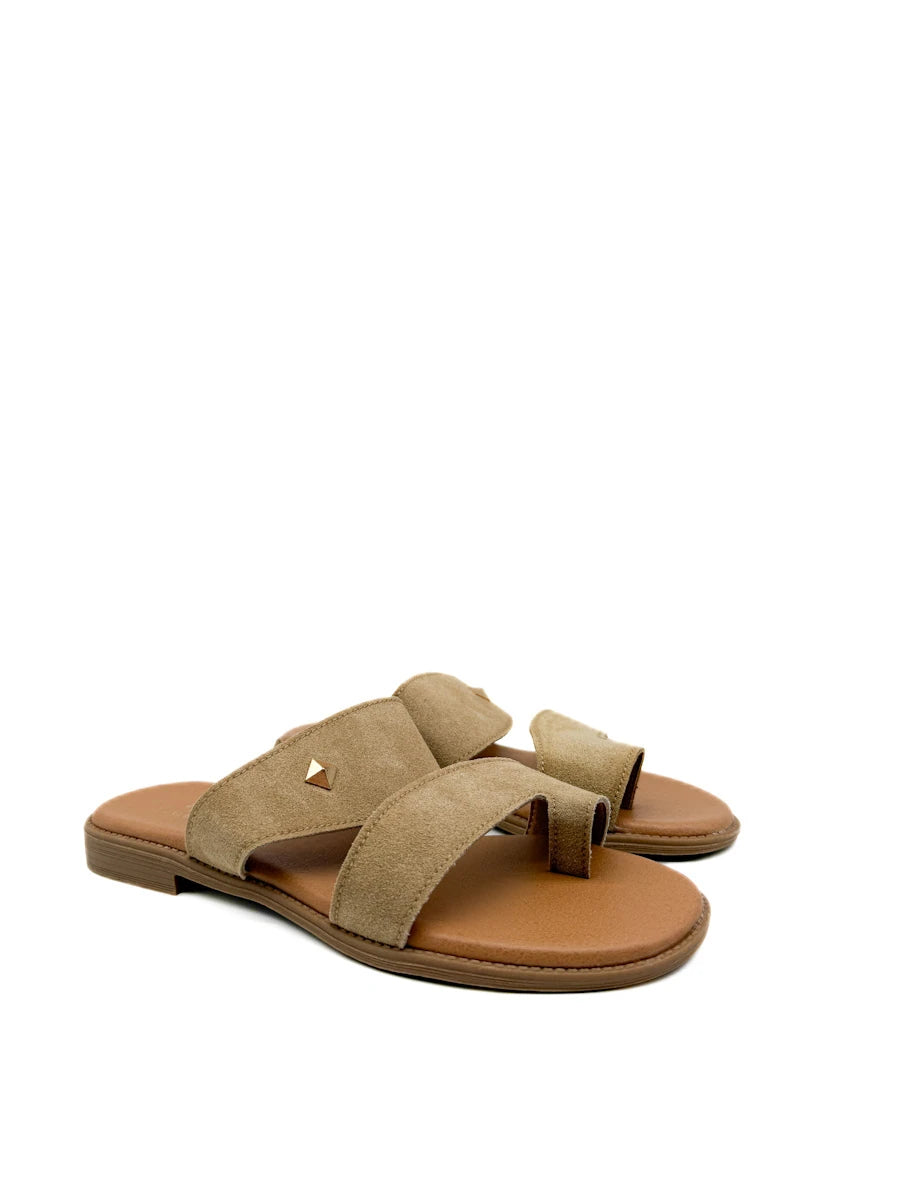 Sandalias planas para mujer presentan un diseño moderno y minimalista de estilo anillo al dedo, confeccionadas en un suave material de antelina que aporta una textura cálida y sofisticada. Destacan por su estructura de correas anchas cruzadas que ofrecen una sujeción segura y confortable, adornadas con un discreto detalle metálico en forma de rombo que añade un toque de brillo sutil. La combinación de tonos tierra, disponibles en marrón y beige , junto con una plantilla acolchada en color canela y una suela ligera, las convierte en el calzado versátil ideal para el día a día durante la temporada de primavera-verano, equilibrando a la perfección la comodidad ergonómica con un estilo casual refinado.