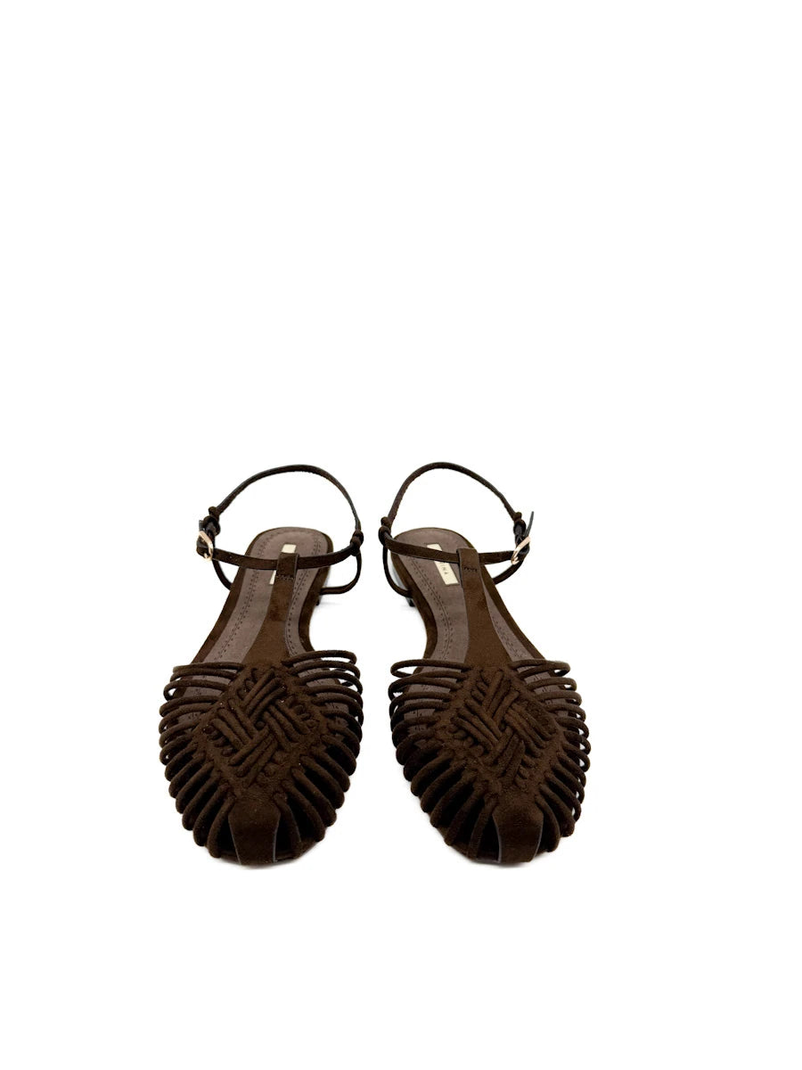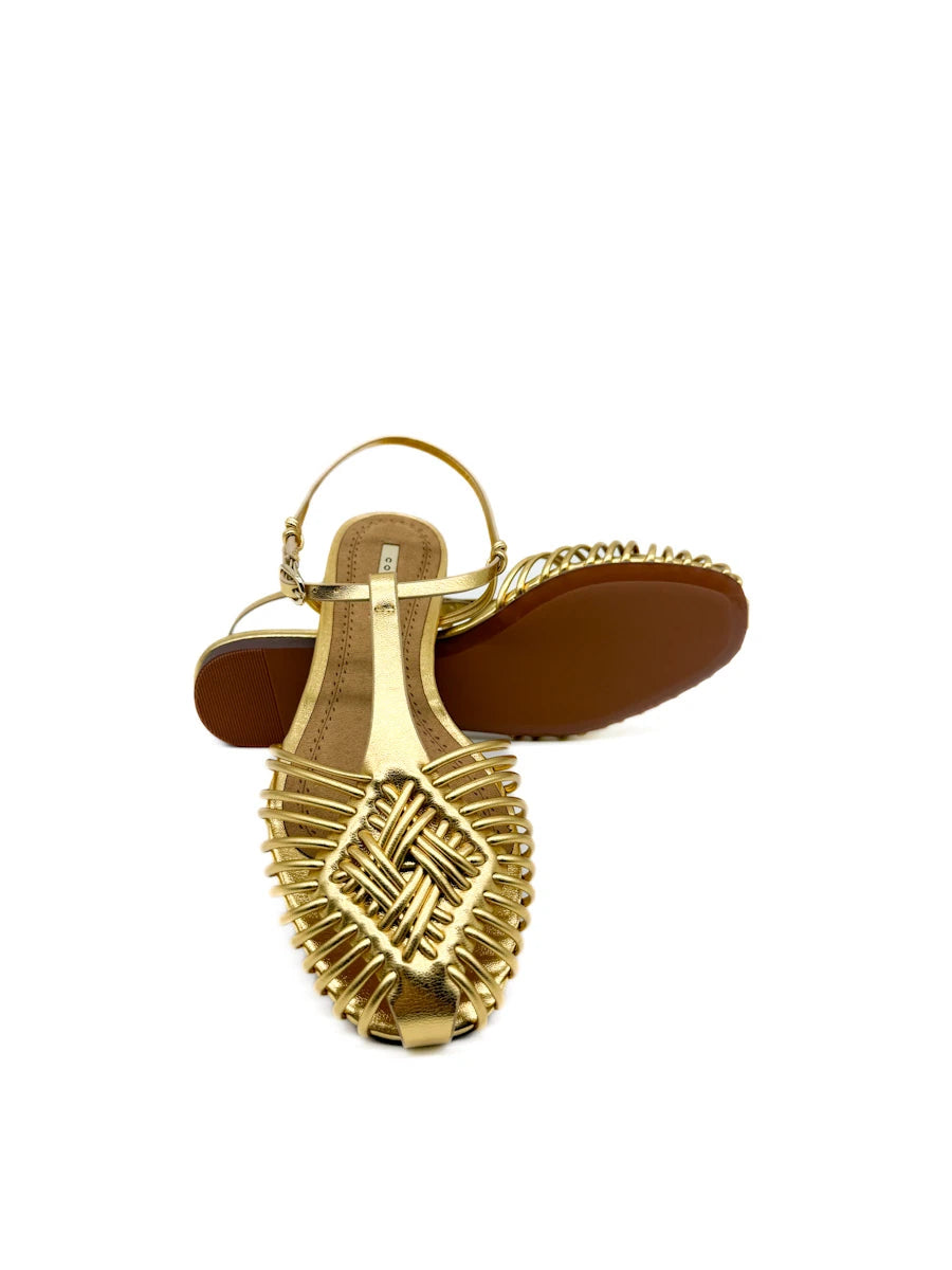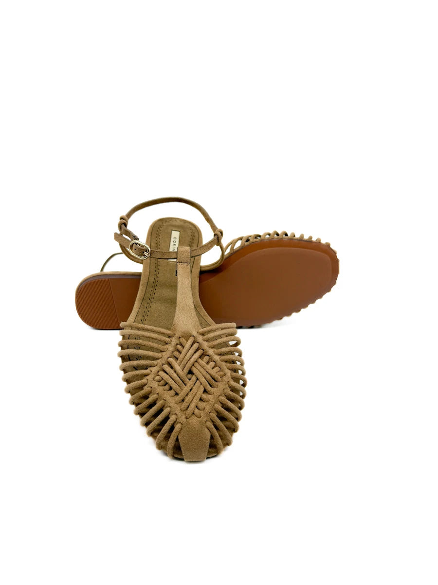 Sandalias planas de estilo cangrejeras de la marca Corina, que destacan por su elaborado diseño de tiras tubulares entrelazadas que forman una puntera cerrada y geométrica. Este modelo combina una estética artesanal con un toque moderno, con una fina tira que rodea el tobillo y se ajusta mediante una delicada hebilla metálica. Están disponibles en tres acabados distintos: un marrón chocolate profundo y un camel suave, ambos con textura de antelina, y una versión en dorado metalizado para un look más sofisticado. Su suela extra plana y plantilla acolchada las convierten en la opción ideal para quienes buscan un calzado cómodo, transpirable y con mucha personalidad para la temporada de verano.