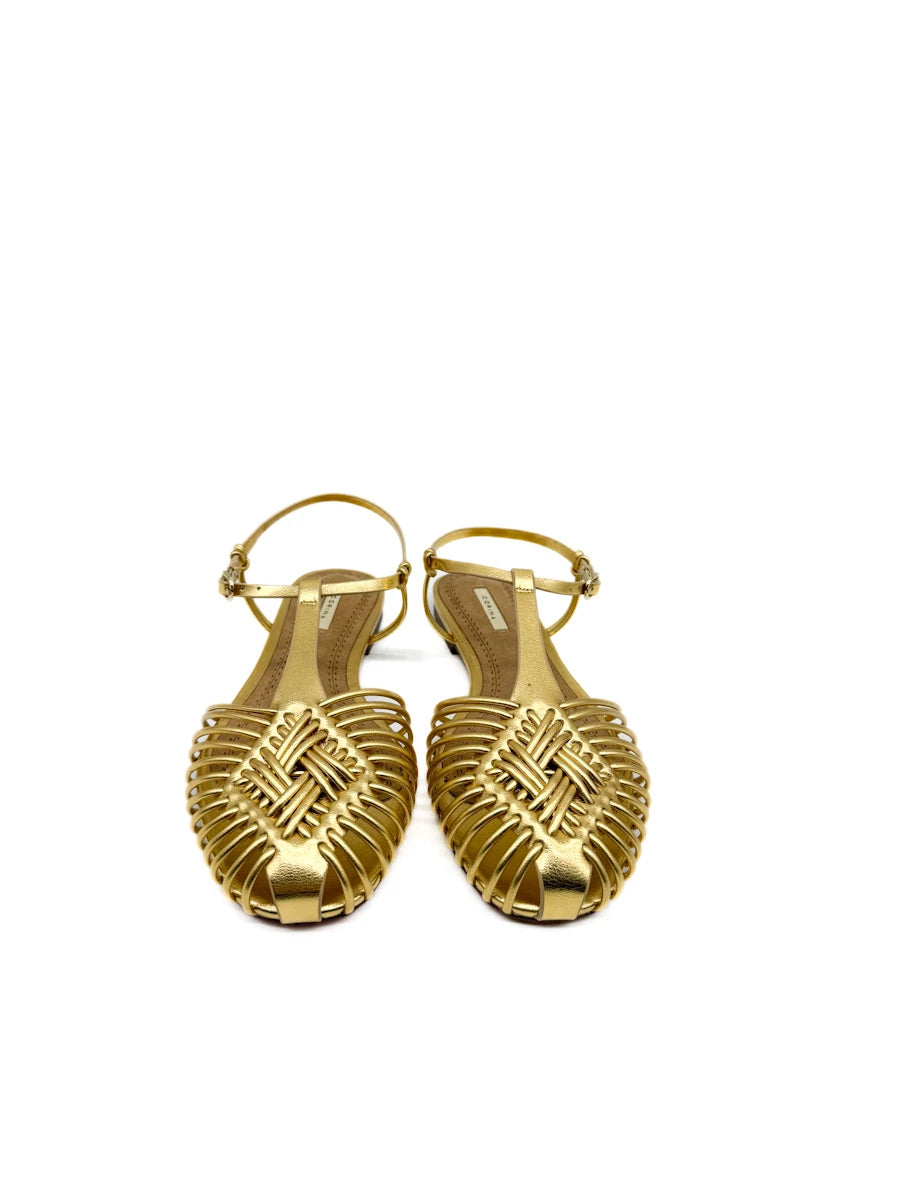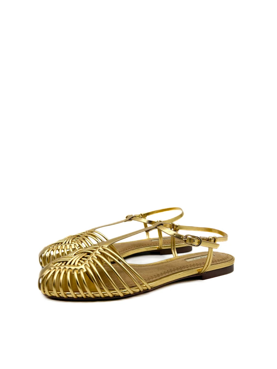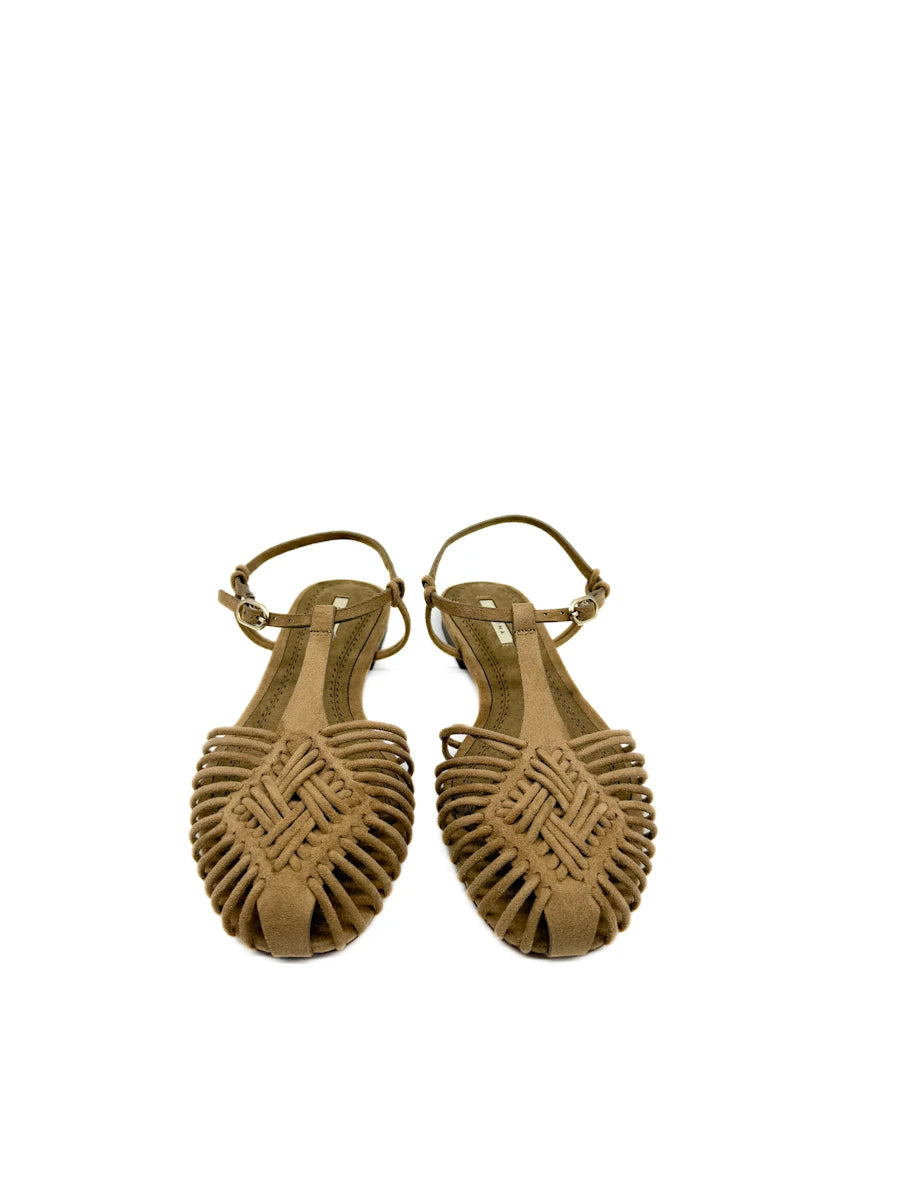 Sandalias planas de estilo cangrejeras de la marca Corina, que destacan por su elaborado diseño de tiras tubulares entrelazadas que forman una puntera cerrada y geométrica. Este modelo combina una estética artesanal con un toque moderno, con una fina tira que rodea el tobillo y se ajusta mediante una delicada hebilla metálica. Están disponibles en tres acabados distintos: un marrón chocolate profundo y un camel suave, ambos con textura de antelina, y una versión en dorado metalizado para un look más sofisticado. Su suela extra plana y plantilla acolchada las convierten en la opción ideal para quienes buscan un calzado cómodo, transpirable y con mucha personalidad para la temporada de verano.