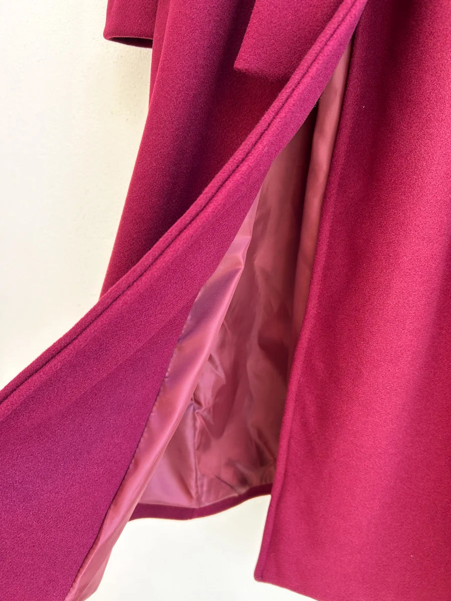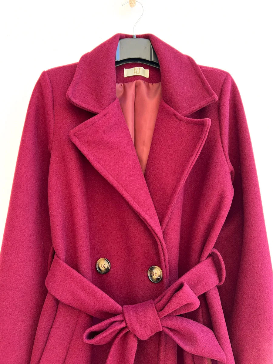 Abrigo largo con cinta, Cuello solapa de muescas y manga larga acabada en abertura y botones. Bolsillos de vivo en laterales. Forro interior. Cierre frontal cruzado con botones.
