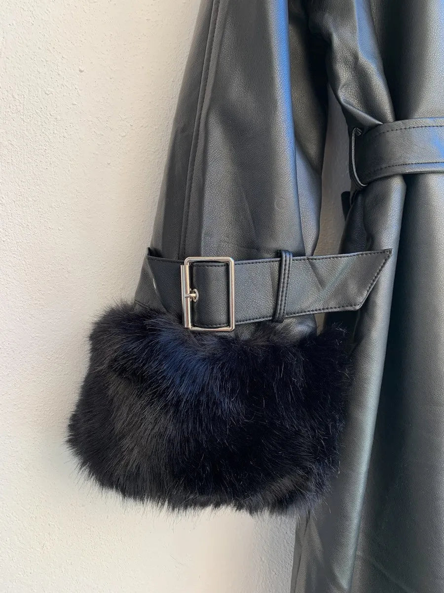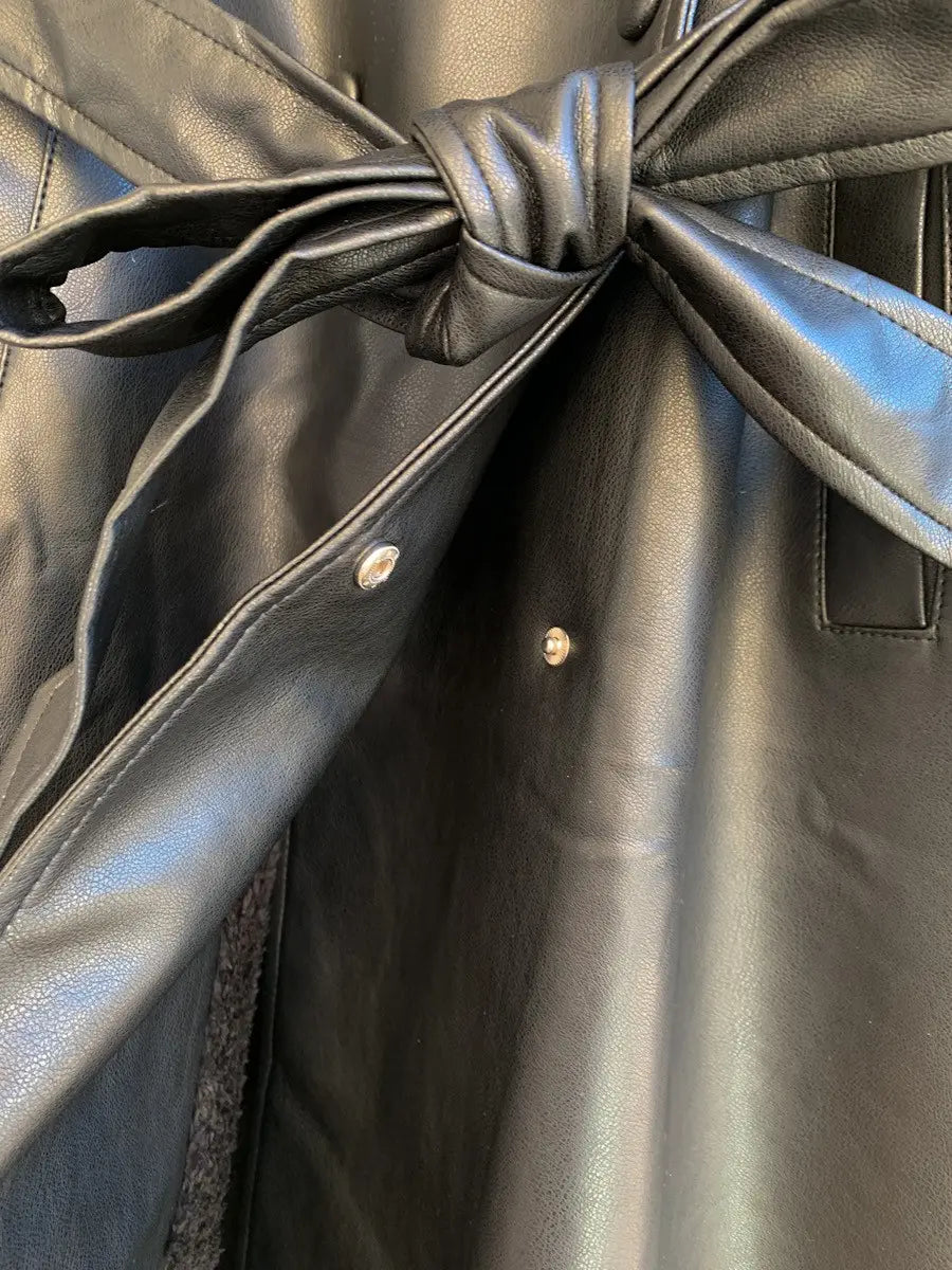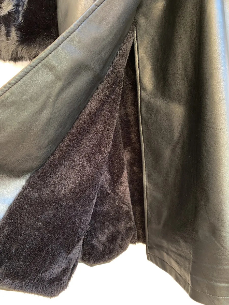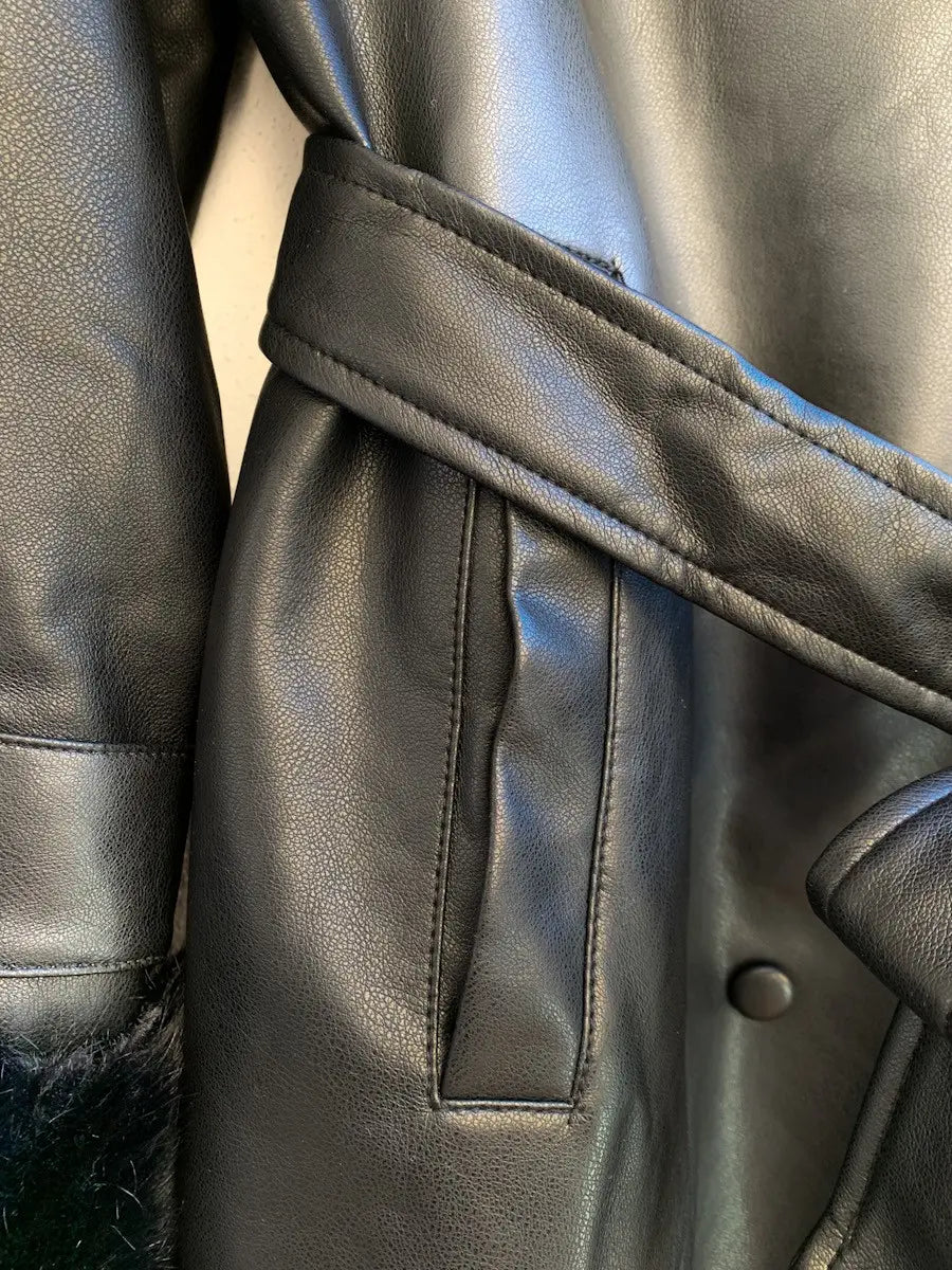 Abrigo largo de polipiel. Cierre de botón doble, Pelito suave en cuello y puños extraible en ambos. Forro en el interior. Cinta de polipiel para ajustar en la cintura, talla M.